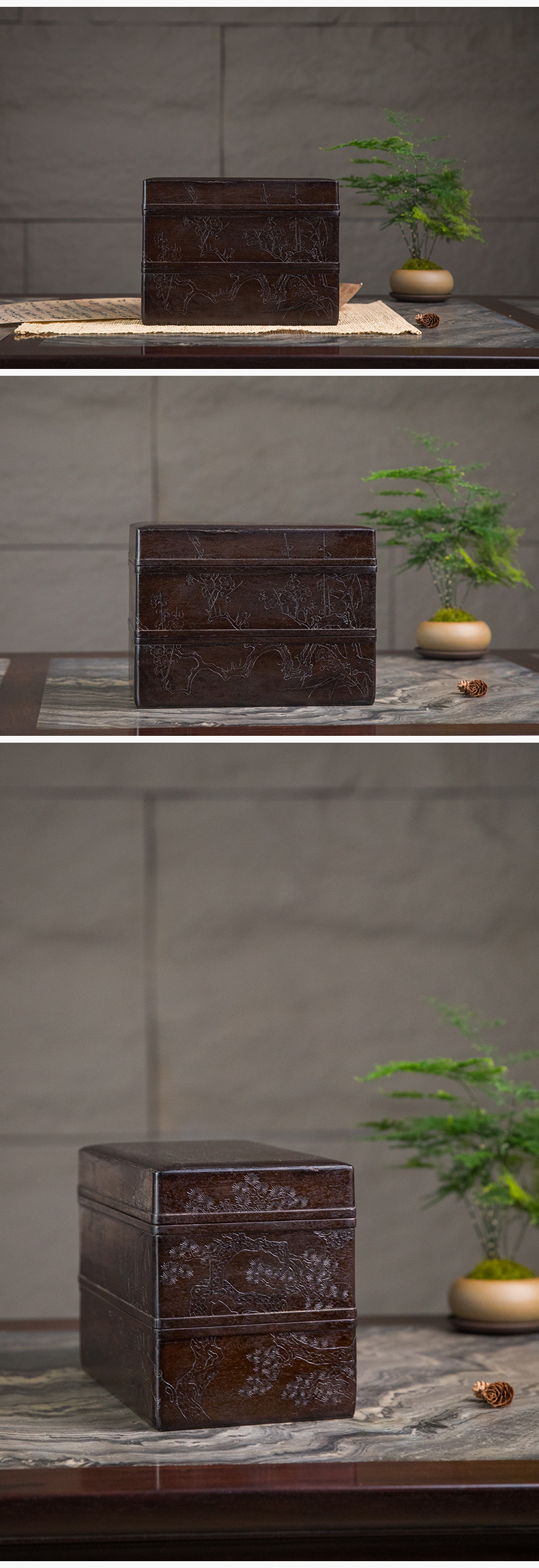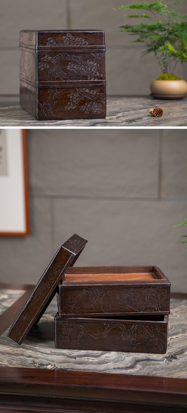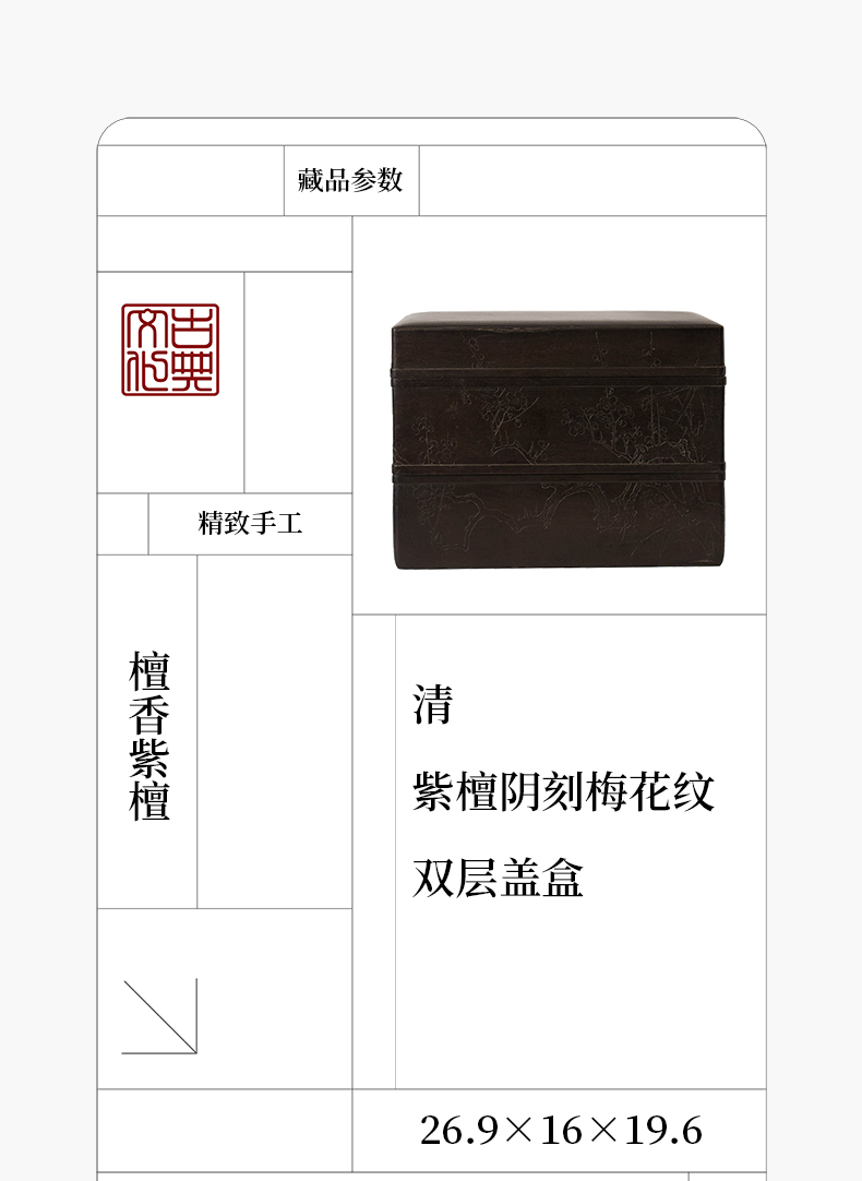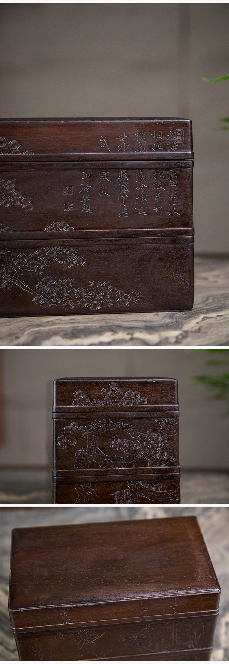 清 紫檀阴刻梅花纹双层盖盒