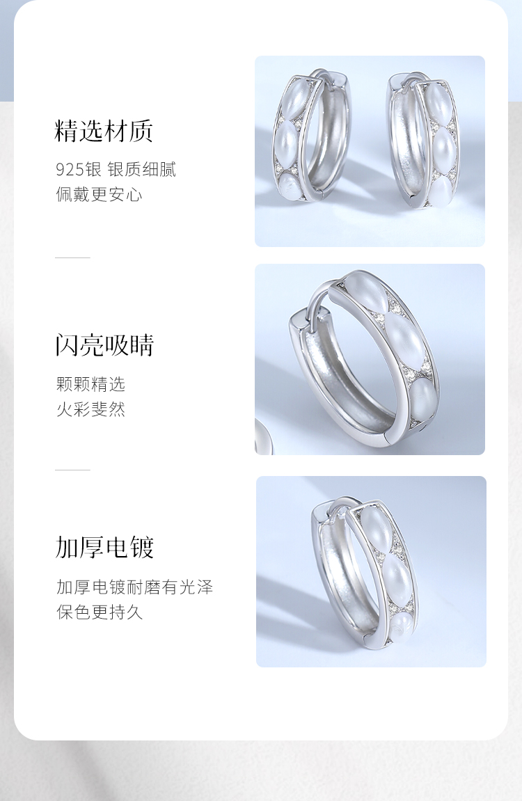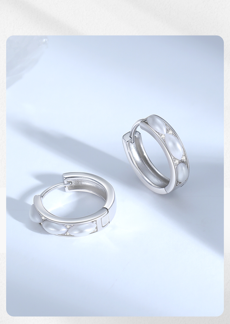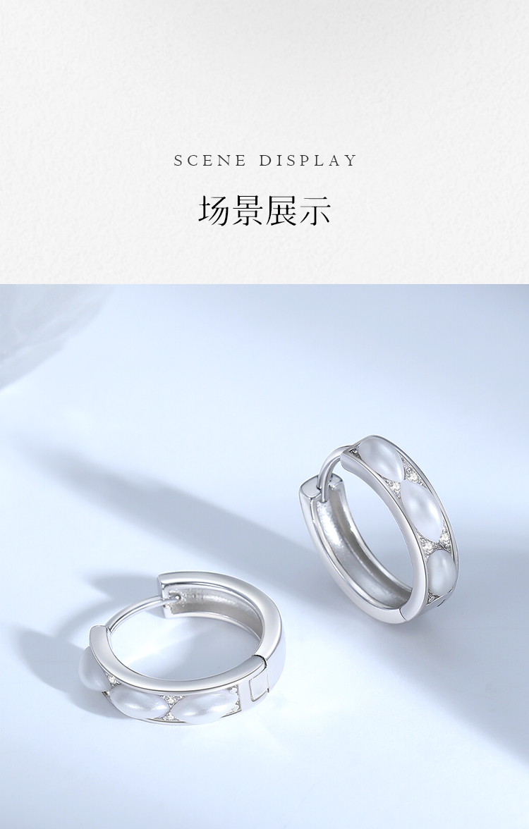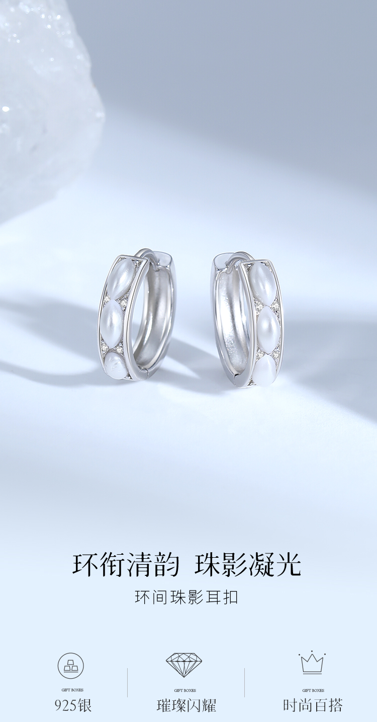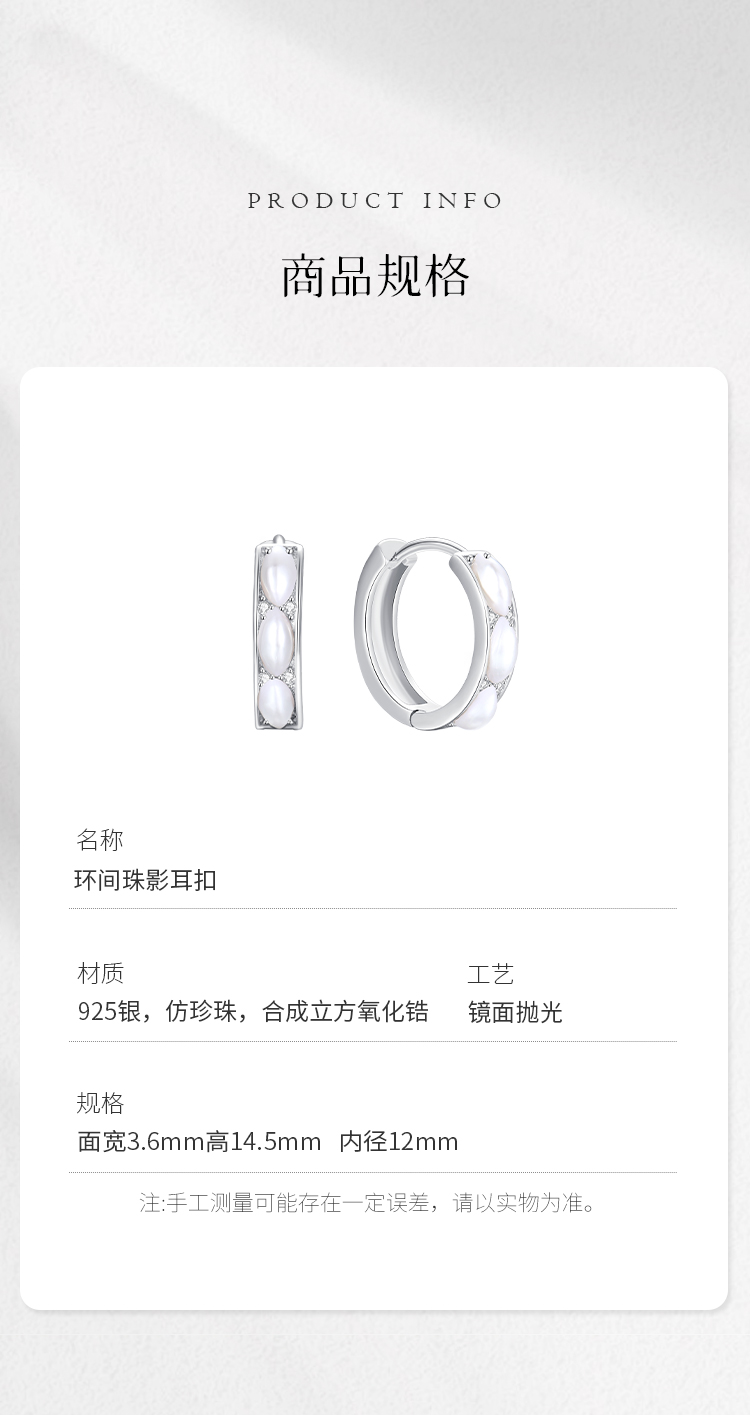 Winy S925 银环间珠影耳扣 仿珍珠合成立方氧化锆 银色精致通勤耳饰 气质百搭
