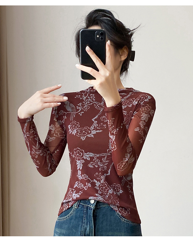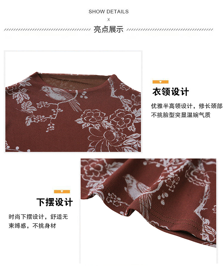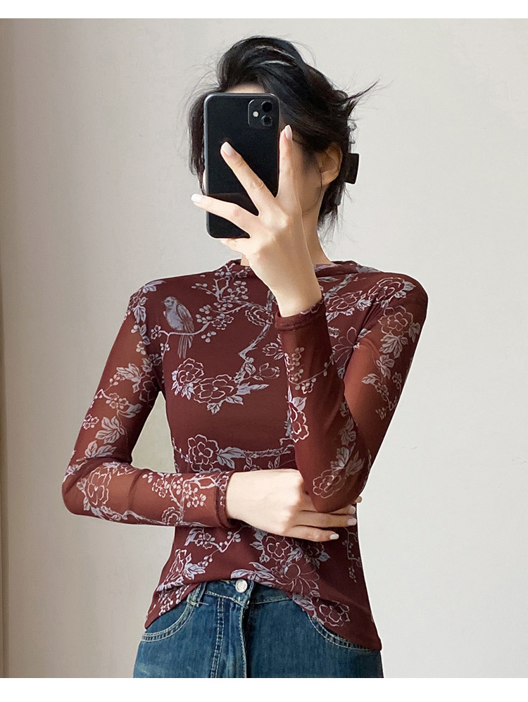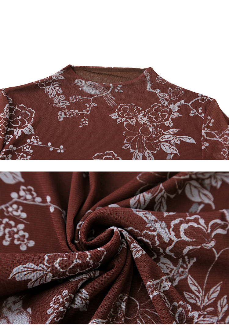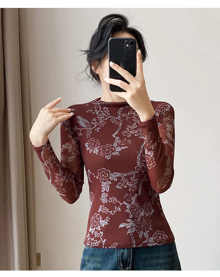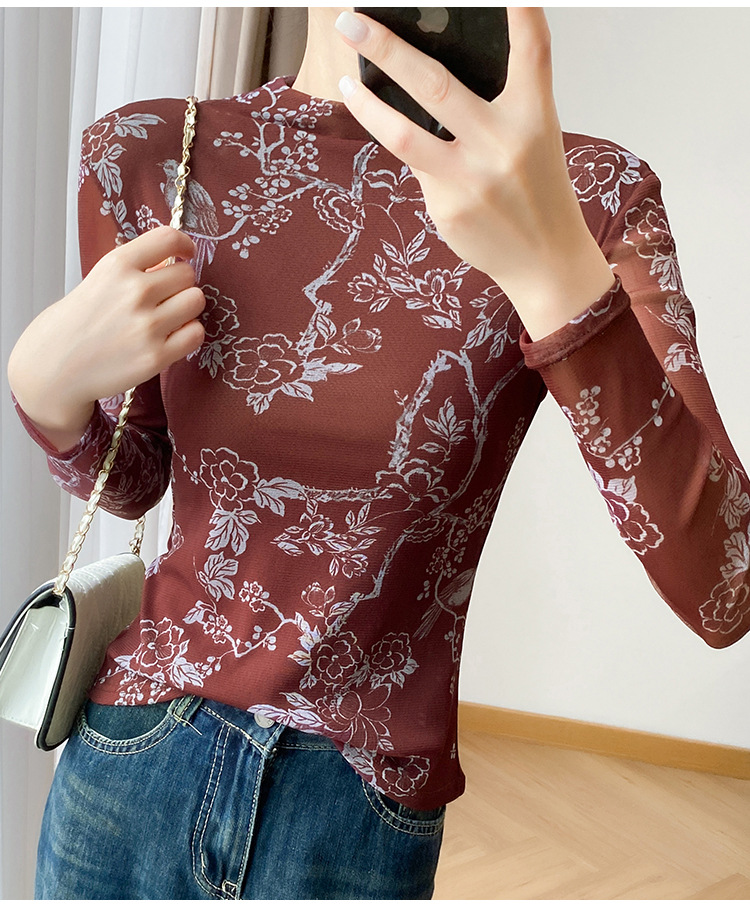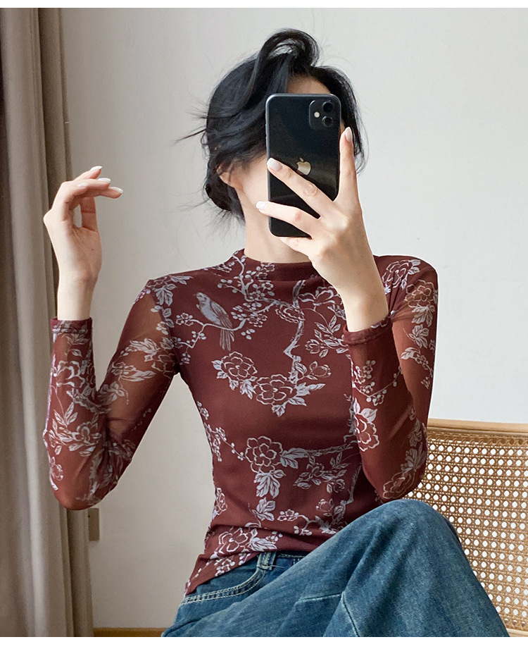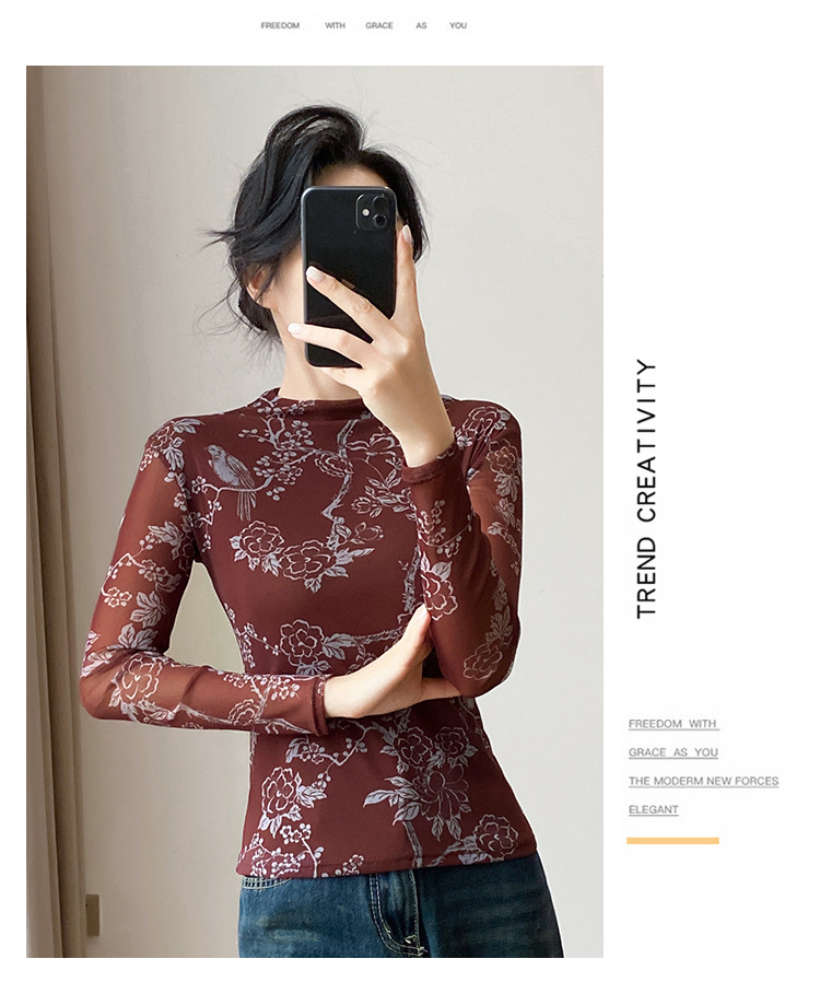 KQLA55F8569女装2025秋冬时尚洋气高弹网长袖印花高领打底衫T恤上衣