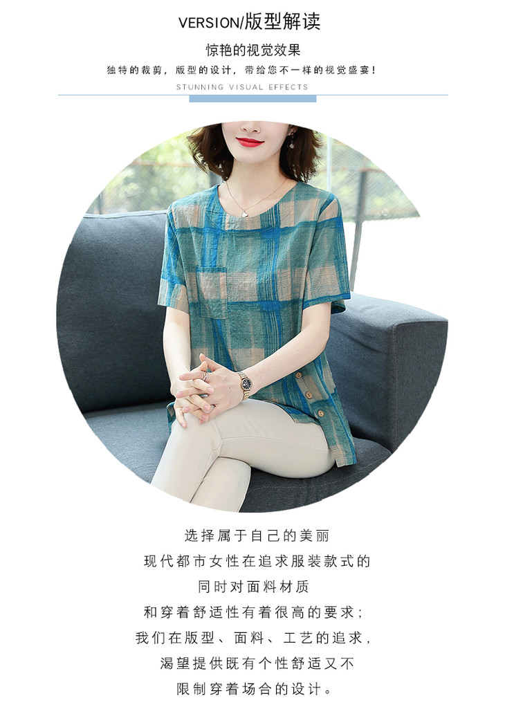 W-859妈妈夏装短袖洋气时尚格子棉麻T恤小衫
