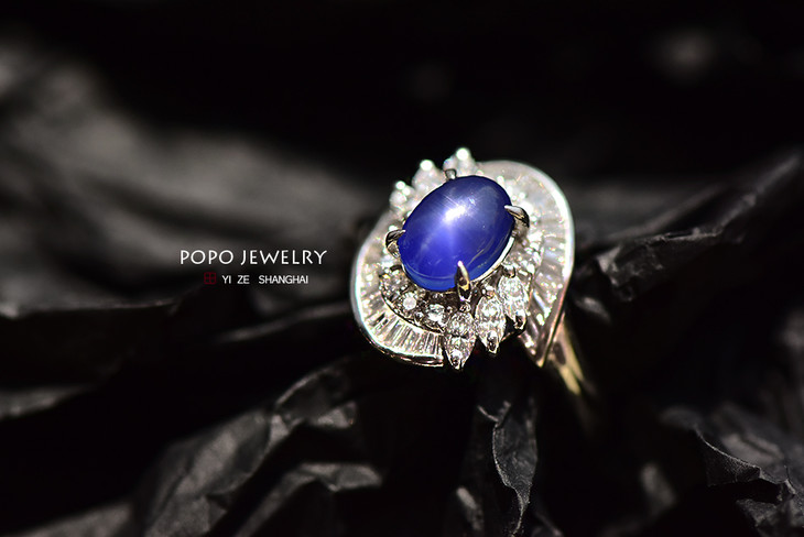 PT900铂金星光蓝宝石钻石戒指