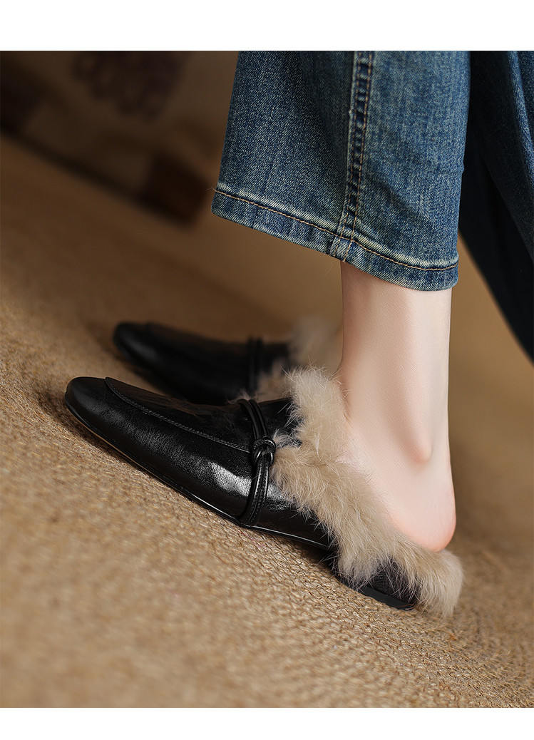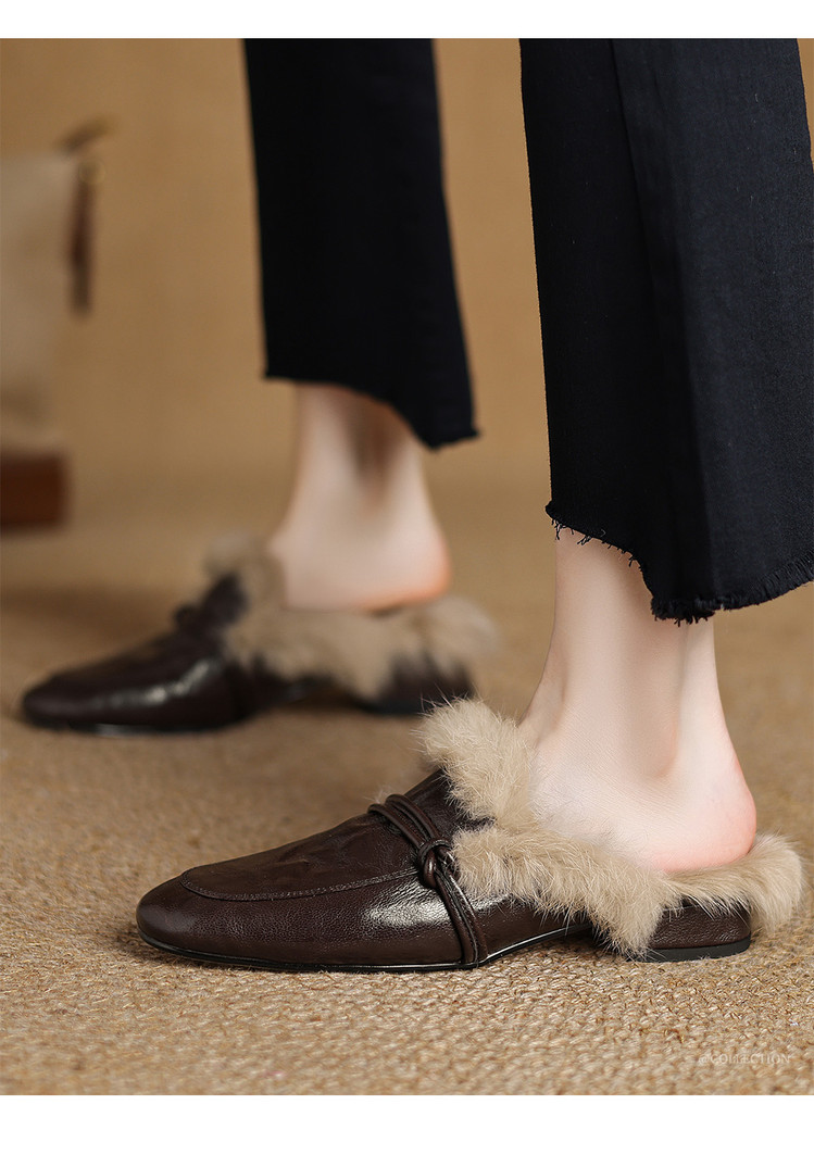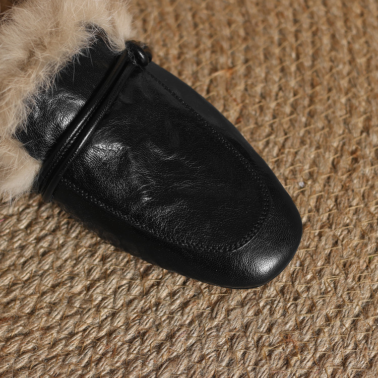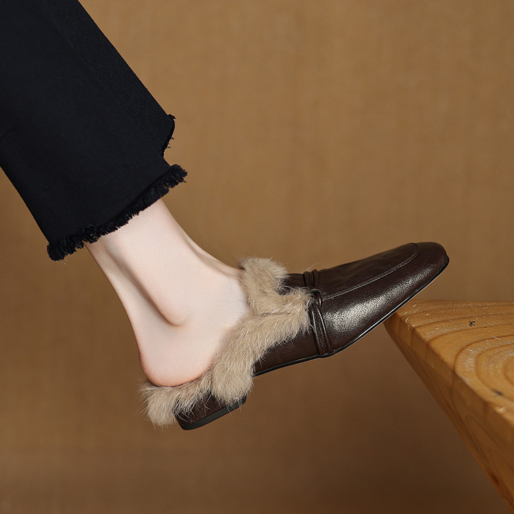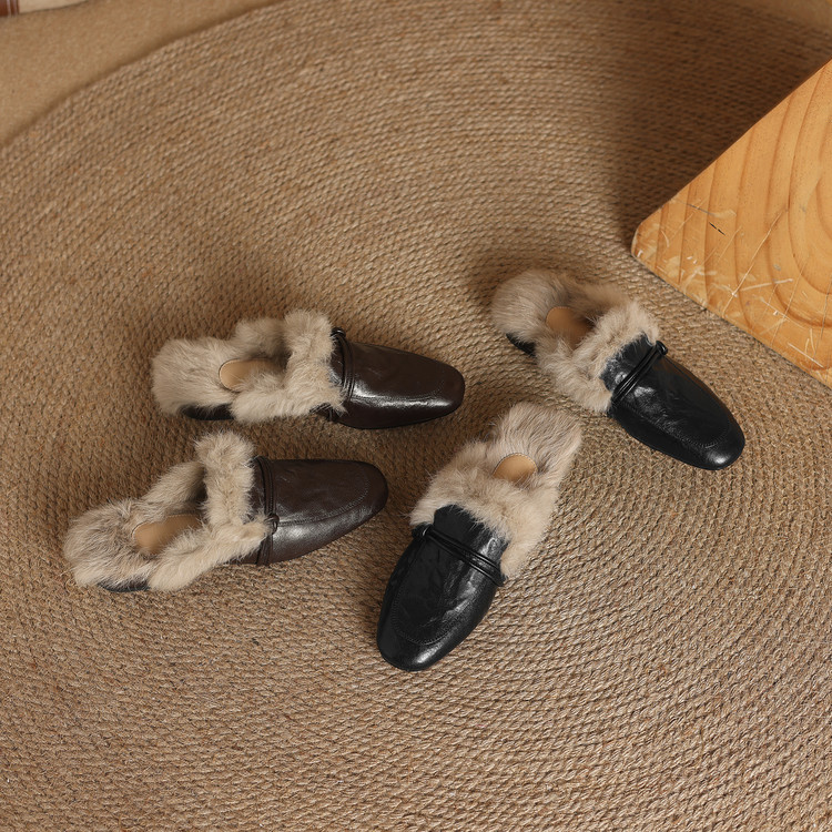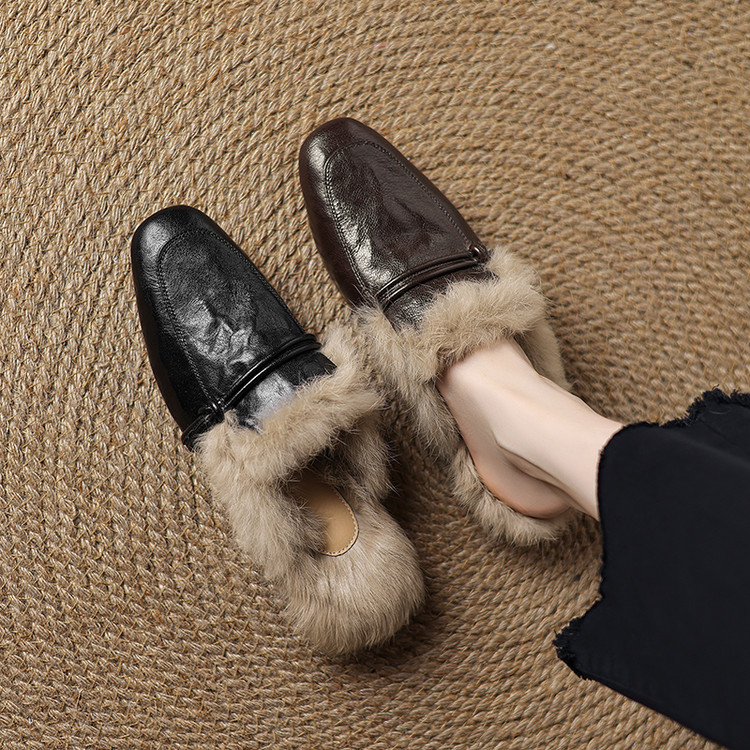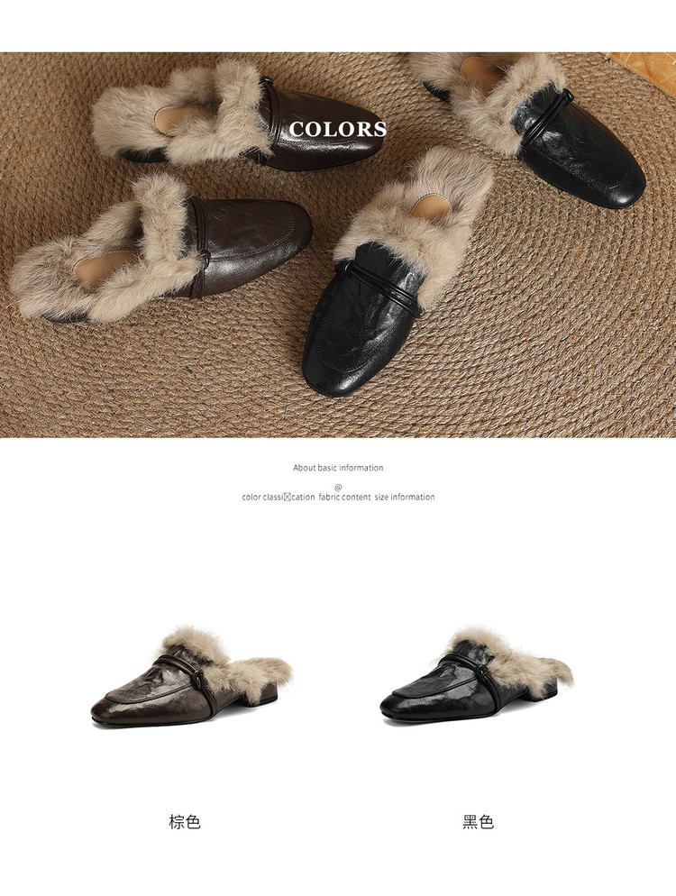 【预售5天】羊皮兔毛毛拖鞋女外穿秋冬英伦复古加绒保暖包头半拖鞋粗跟穆勒鞋NGMZR&7955