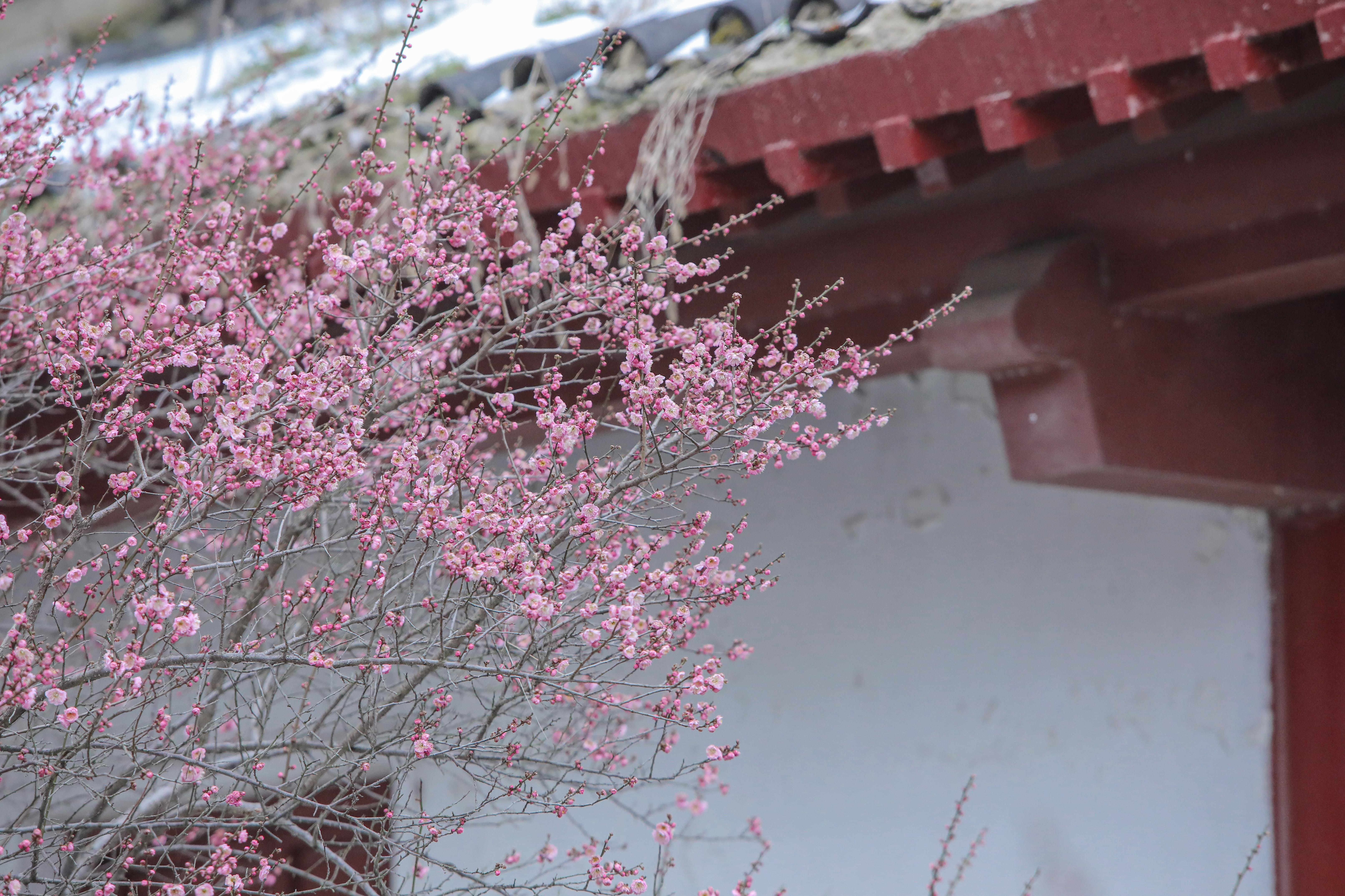 东湖梅园位于长江流域,早春梅花开时,常遇瑞雪。每当瑞雪压枝,梅花怒放之时,轻摇梅枝雪花飞舞,诗云:“梅须逊雪三分白,雪却输梅一段香”。