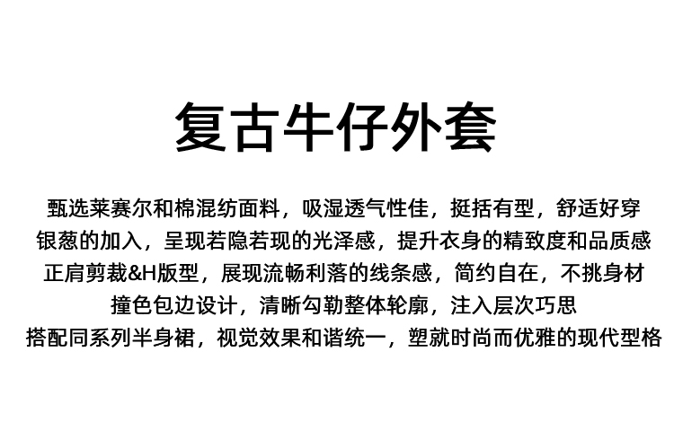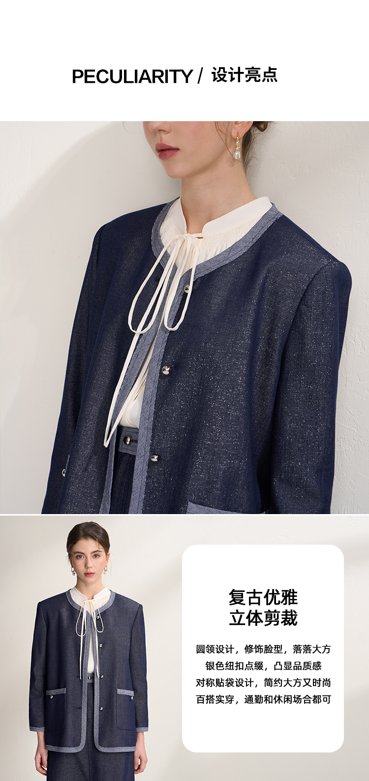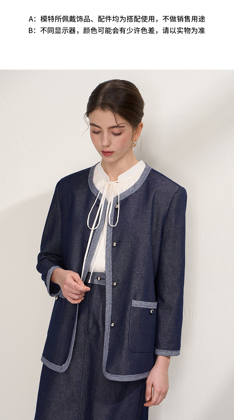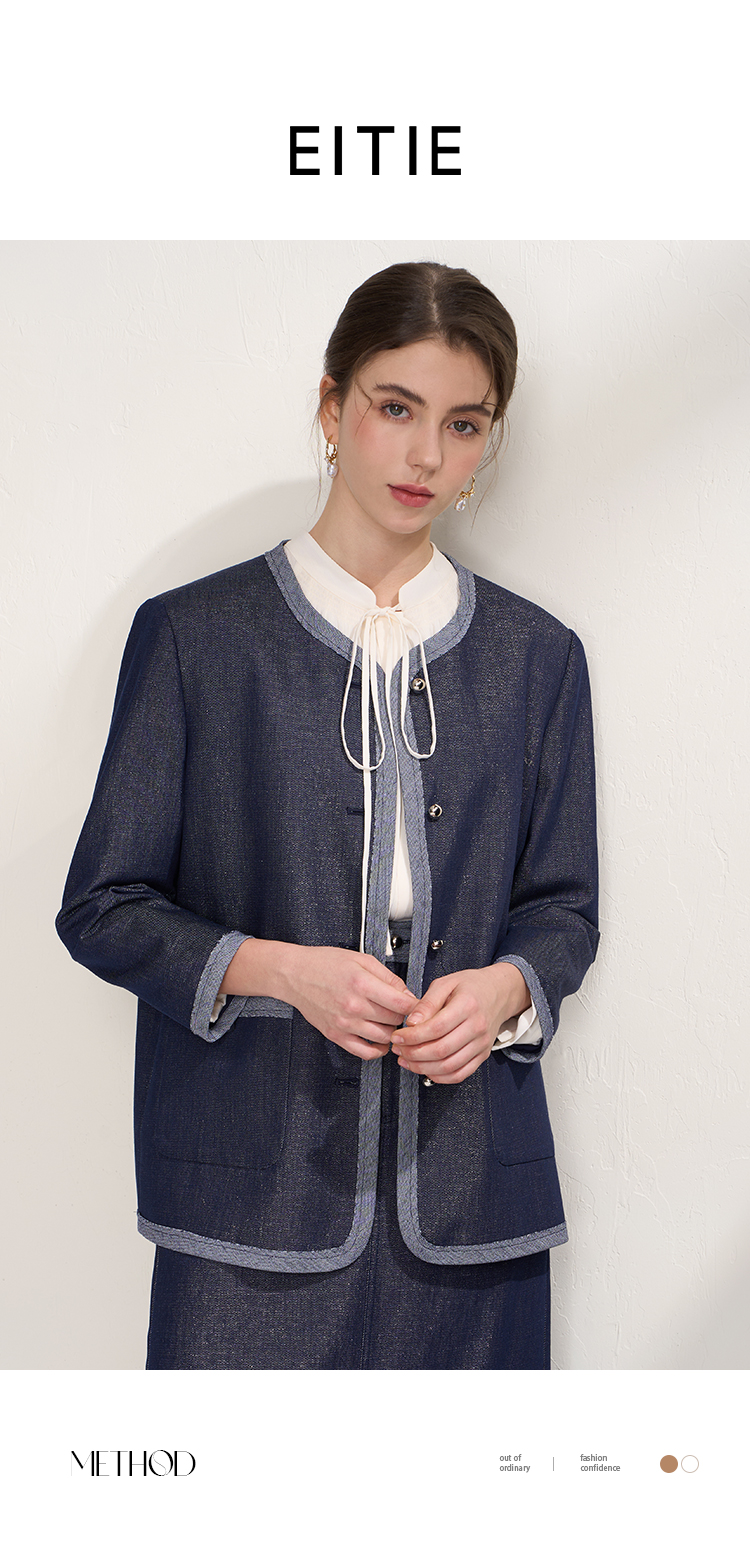 EITIE爱特爱复古圆领优雅亮丝撞色设计2026春季新款牛仔外套A2603109