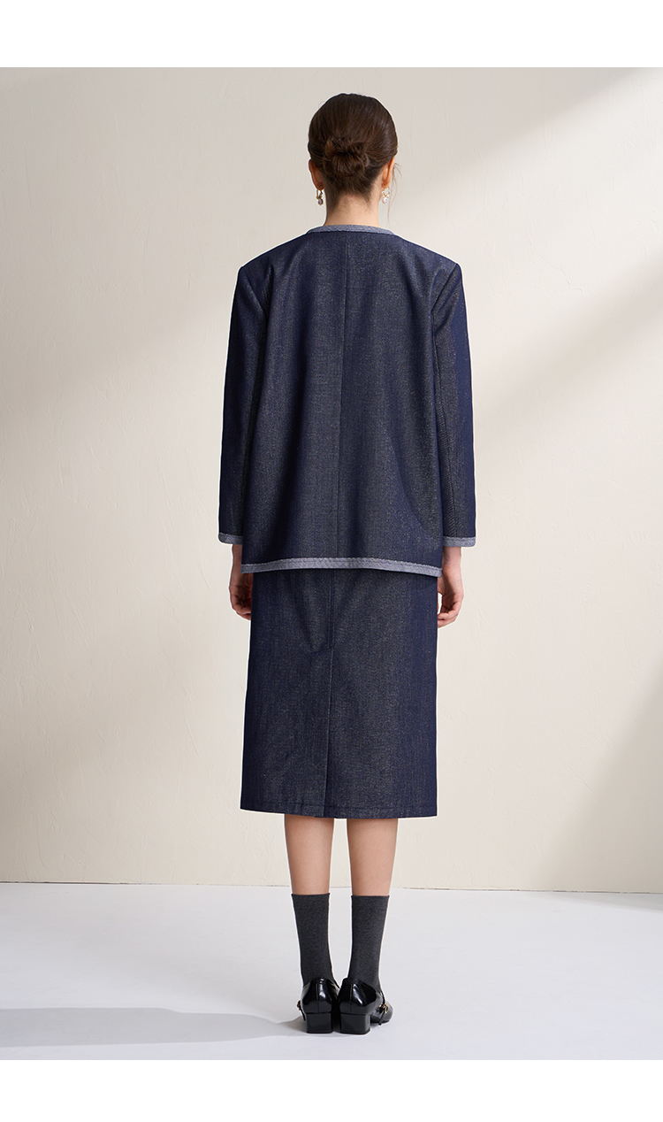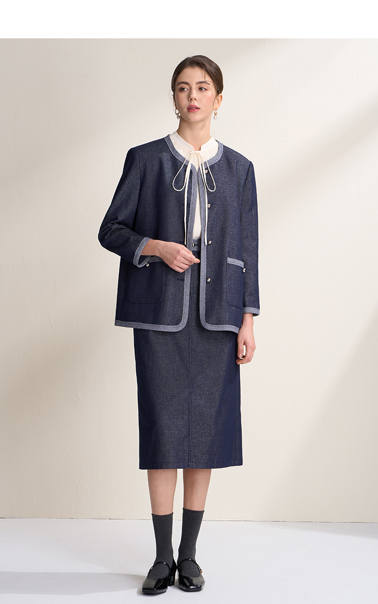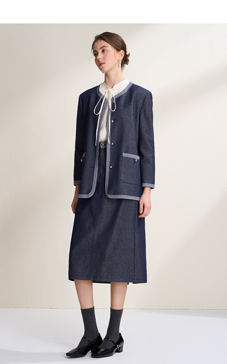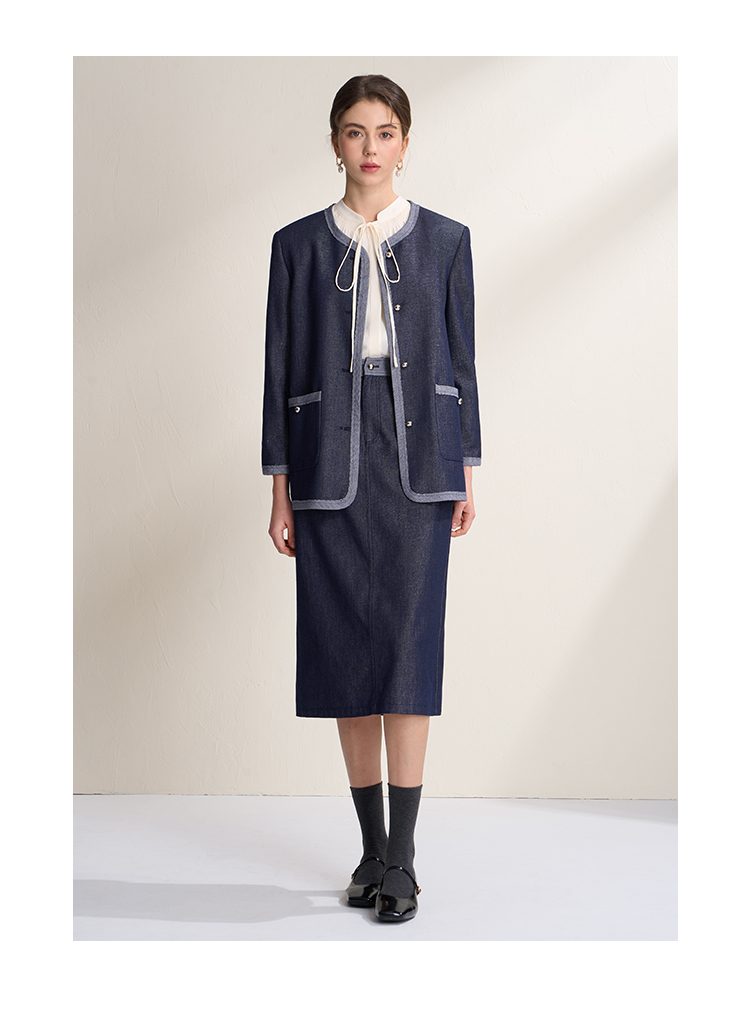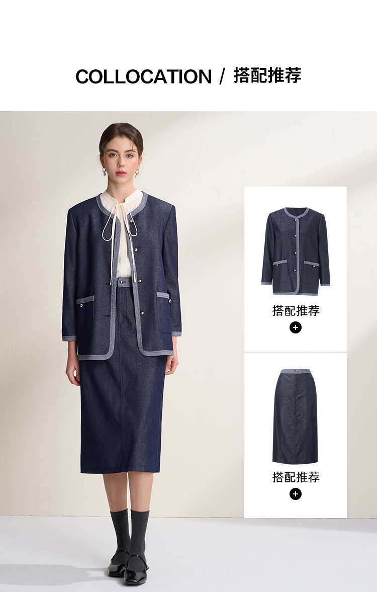 EITIE爱特爱复古圆领优雅亮丝撞色设计2026春季新款牛仔外套A2603109