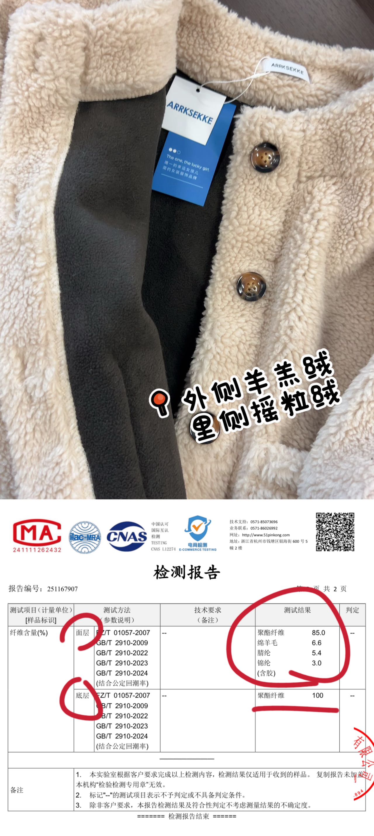 材质:外衣:羊羔绒棉羊毛6.6 腈纶5.4 锦纶3.0 聚酯纤维85.0;里衣:摇粒绒100%聚酯纤维