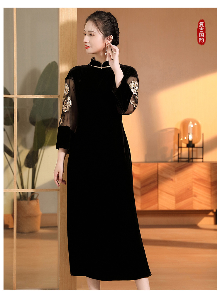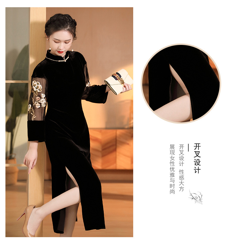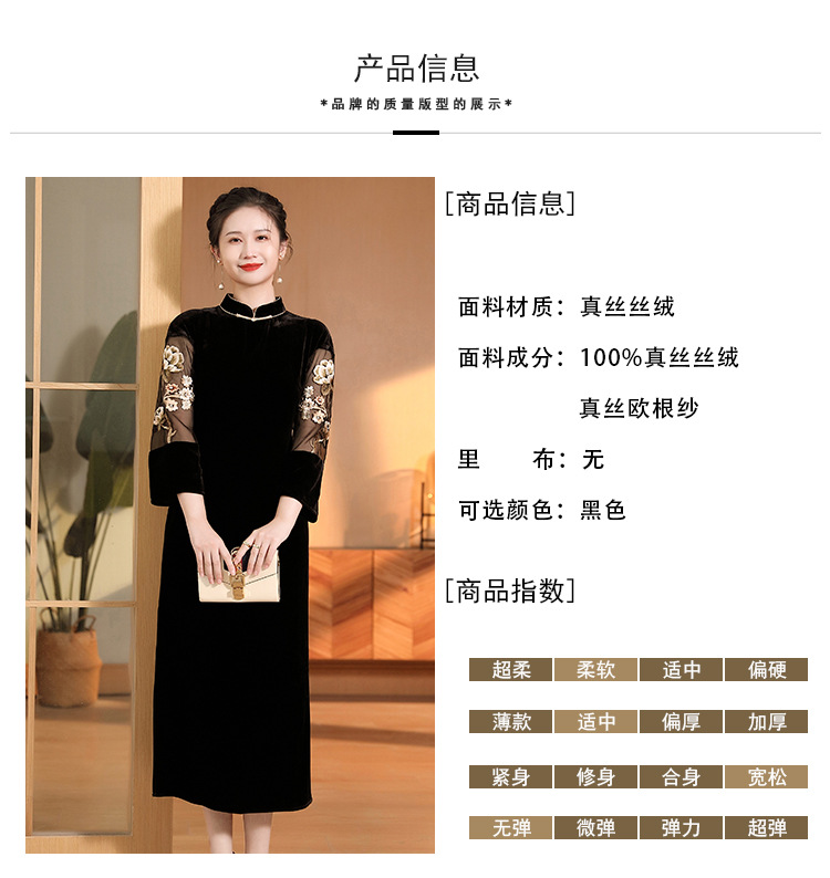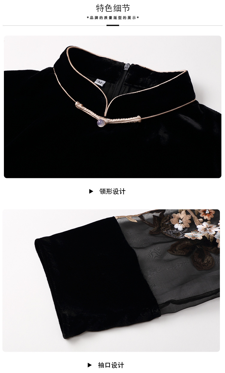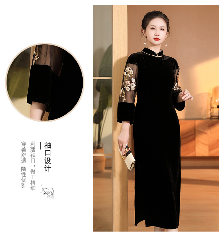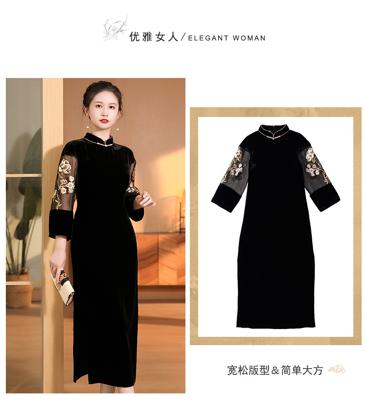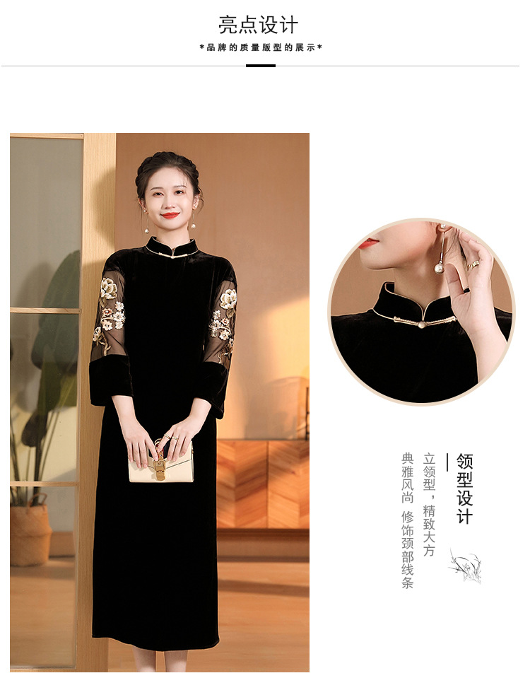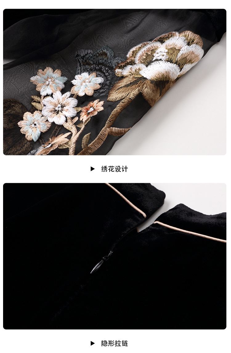 AYK QF-220810 真丝丝绒拼接欧根纱绣花长款旗袍九分袖国风连衣裙2022秋冬女装