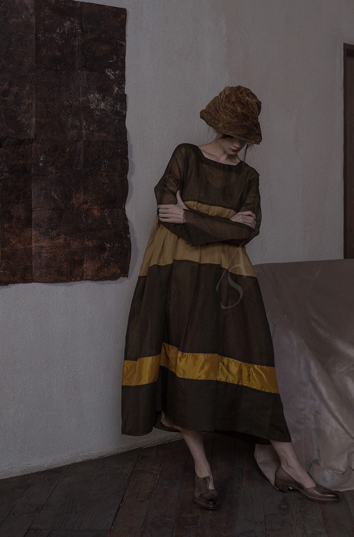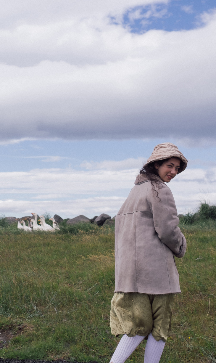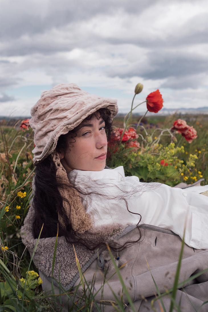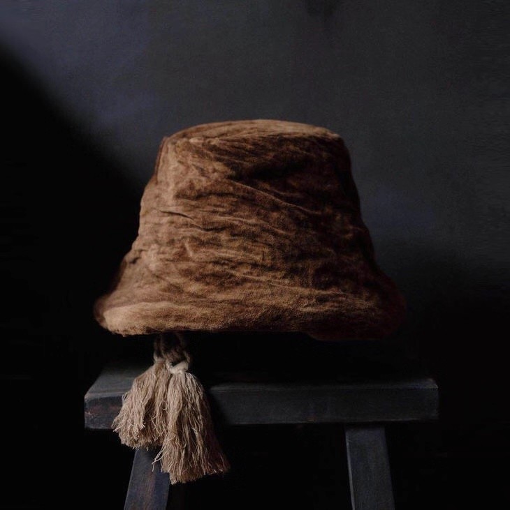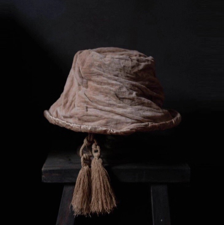 使用褶皱棉绒和立体丝绵植水洗后定型制成的双面盆帽,由天然植物染色纹理斐然出彩,搭配的手工编织棉流苏古朴自然,末端链接抽绳可调节帽围大小,使佩戴者根能根据自己喜好塑造形状。