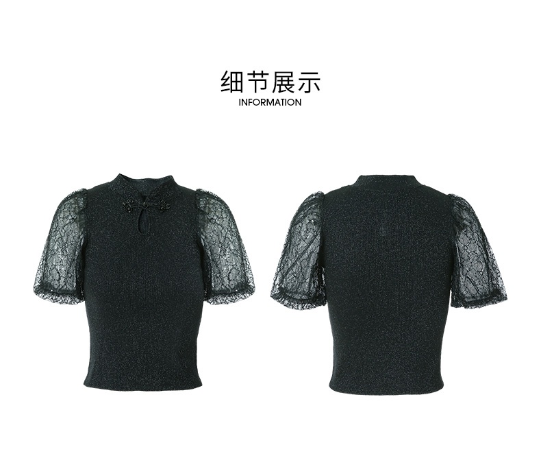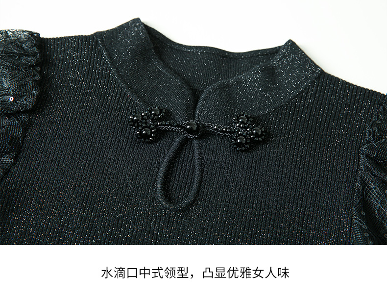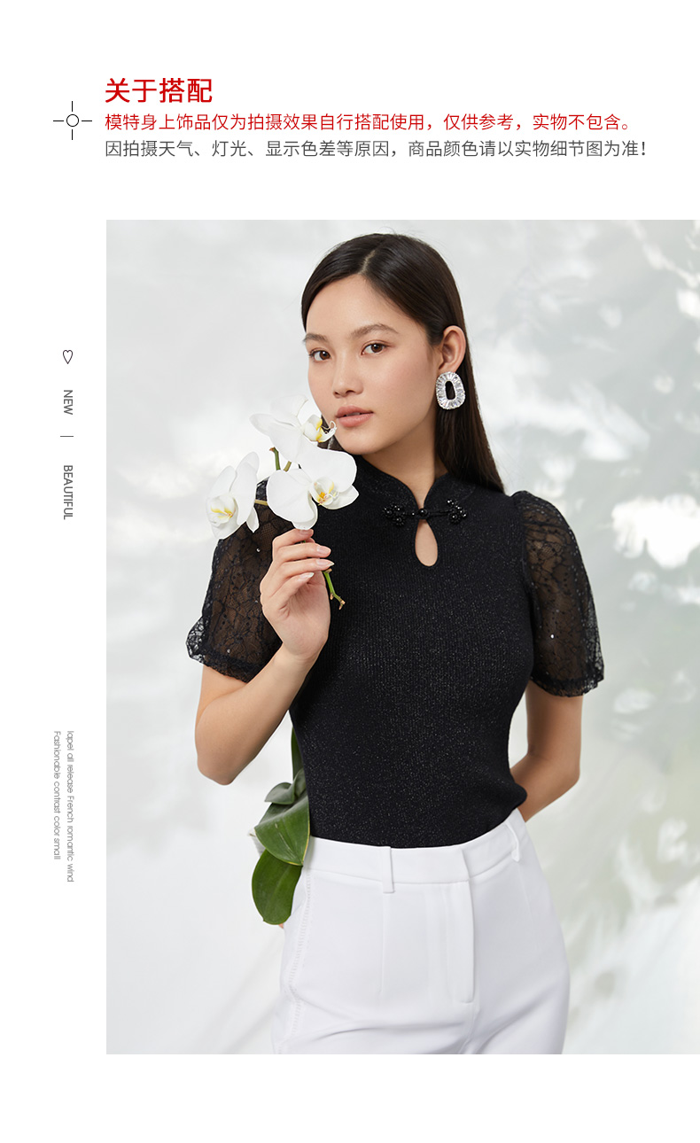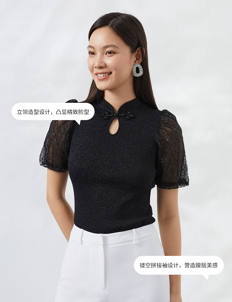 EITIE爱特爱夏季新款气质显瘦立领黑色中式盘扣修身针织上衣B2201904
