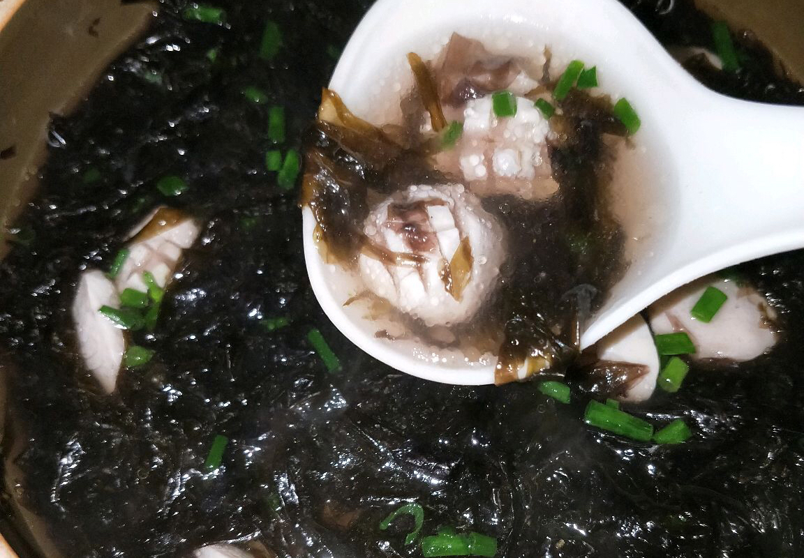 东山岛头水紫菜的煮法是:不用洗,水开或者底汤熬煮妥当以后,直接下紫菜,下完紫菜马上关火。这样煮出来的紫菜就绝对是又绿又嫩又甜了。