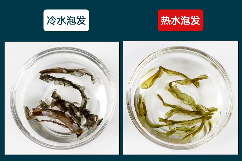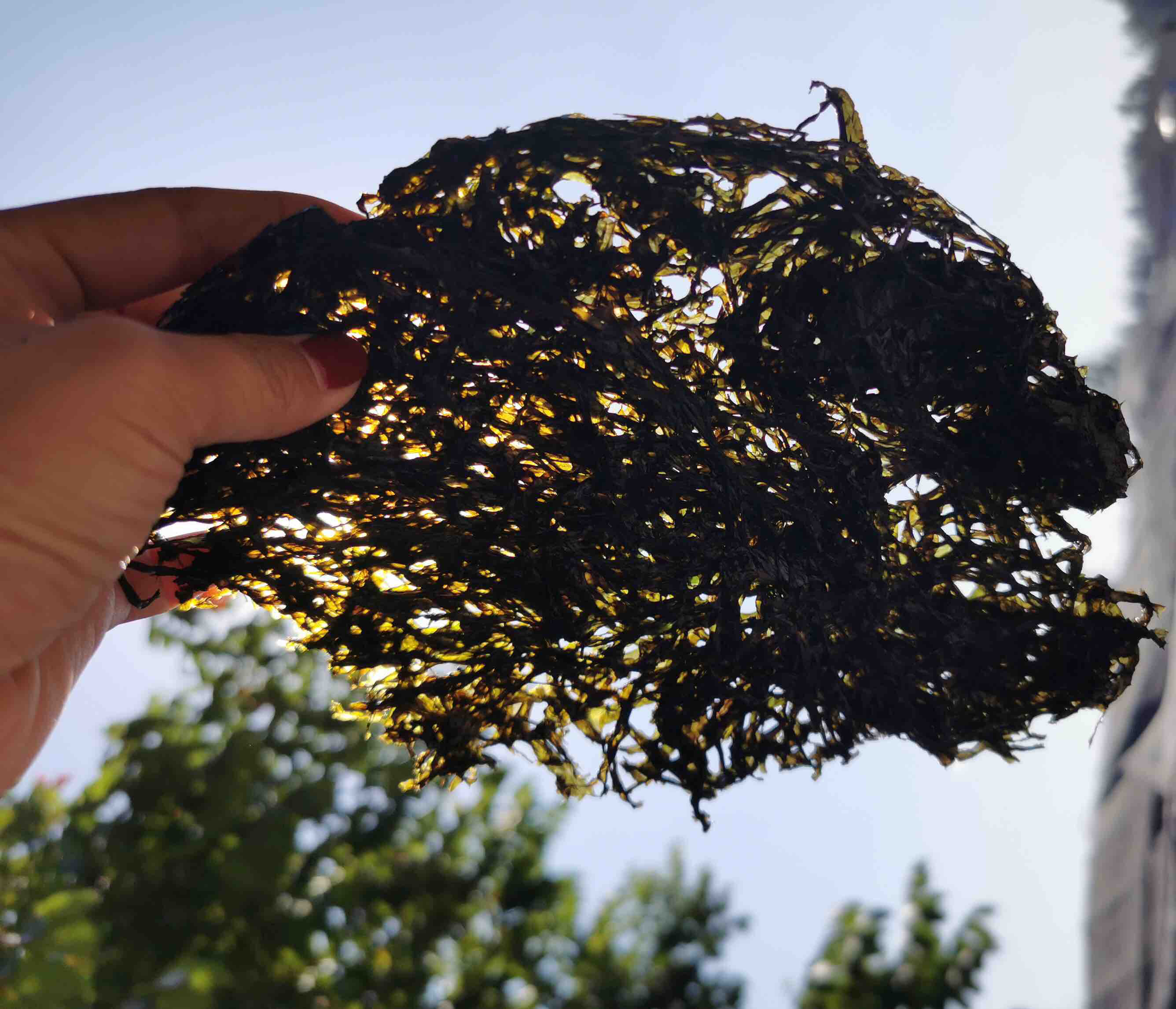 东山岛的头水紫菜,还没烘烤前是深紫色的,烘干以后变成纯黑色,遇热水马上会展开,呈非常漂亮的绿色,叶片清爽,泡的水清澈。