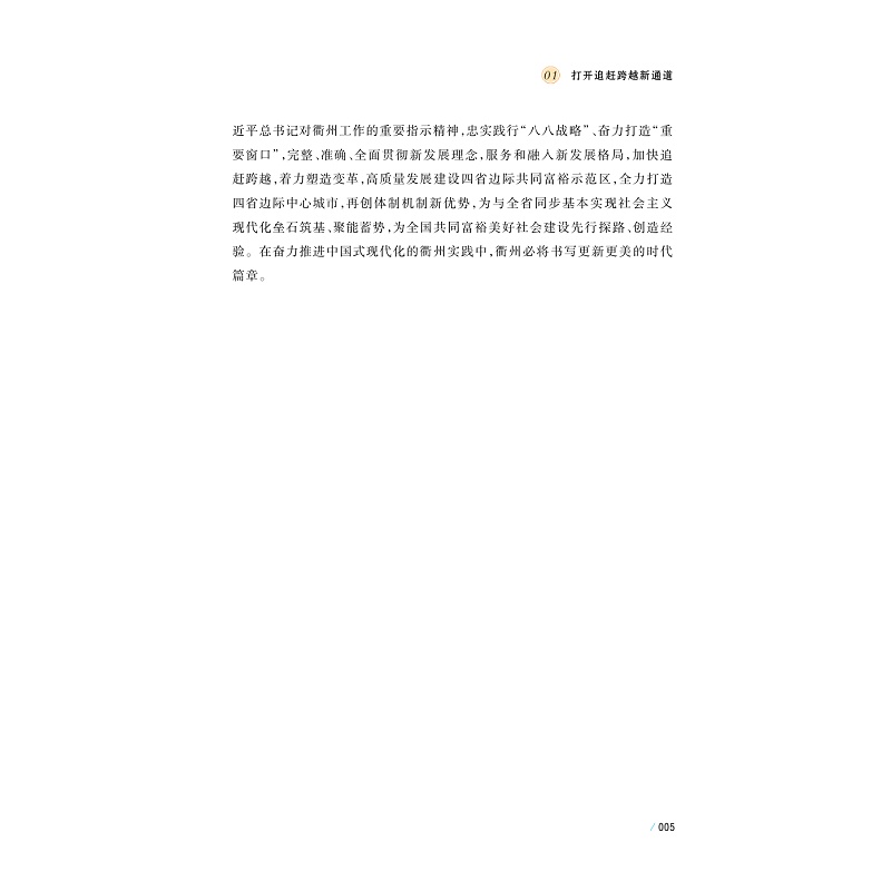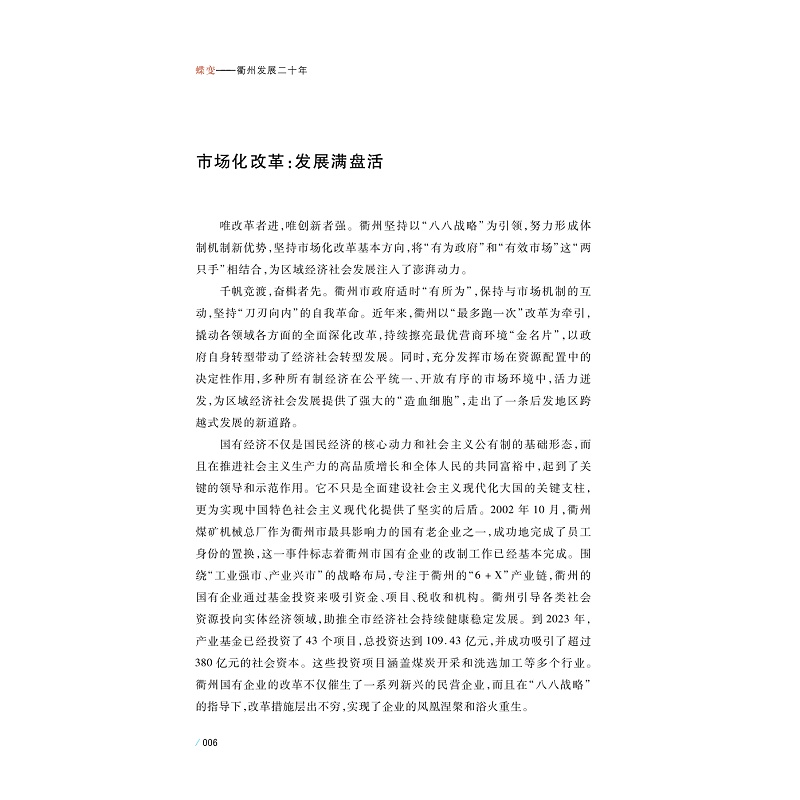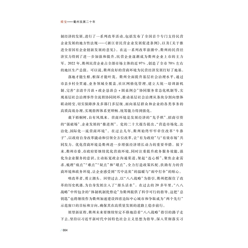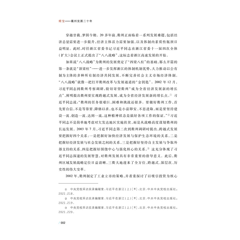 本书为衢州市委宣传部与衢州学院马克思主义学院共建课题的成果。20年来,衢州坚持以“八八战略”为总纲,深入践行习近平总书记的殷殷嘱托,经济社会各领域改革发展取得突破性进展。衢州实现了全方位、系统性、深层次的精彩蝶变,为“八八战略”在浙江萌发与实践提供了生动案例和鲜活样本。本书梳理总结“八八战略”实施20年来三衢大地发生的巨变,充分展示衢州加快打造十个“桥头堡”、建设四省边际中心城市、争当“两个先行”示范窗口的生动实践、鲜活案例和精彩蝶变。