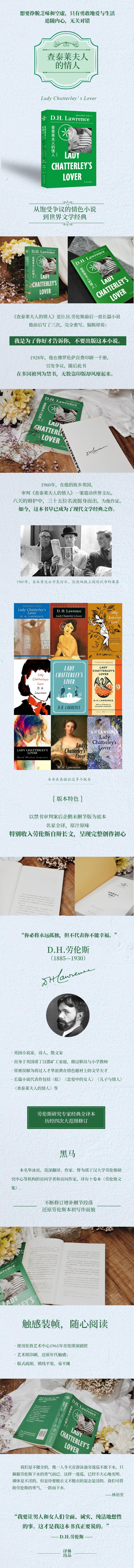 《查泰莱夫人的情人》,劳伦斯前后写了三次,完全重写。编辑说:我是为了你好才告诉你,不要出版这本小说。1928年,他在佛罗伦萨自费印刷一千册,引发争议,随后此书在多国被列为禁书,无数盗印版却风靡起来。 1960年,在他的故乡英国,审判《查泰莱夫人的情人》一案震动世界文坛。六天的辩护中,三十五位名流挺身而出,为他作证。 如今,这本书早已从一本饱受争议的情色小说成为现代文学经典之作。