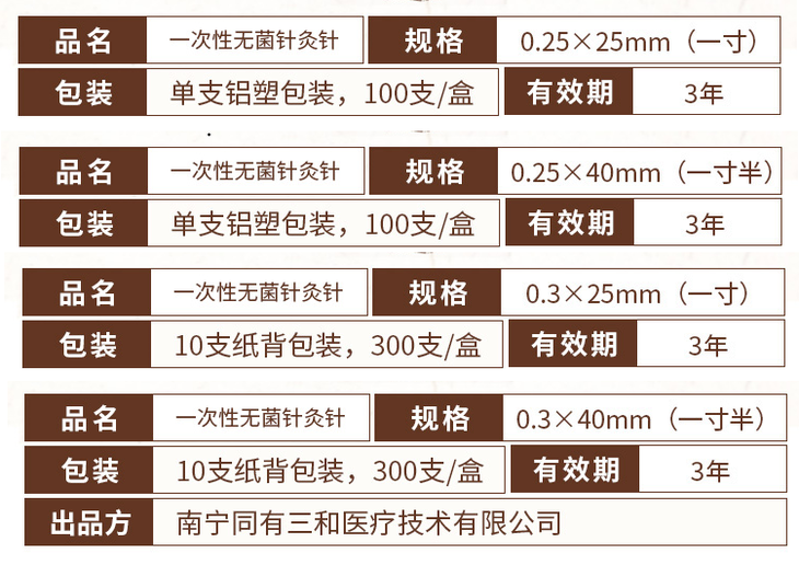 其中0.18、0.25、0.3(直径:毫米)为针的粗细,数字越小针越细。越细的针痛感越少;越粗的针硬度越高,破皮更快,相对更容易进针。大家可以根据自己的习惯和喜好,以及被扎者的年龄、耐受度等来选择针的粗细。