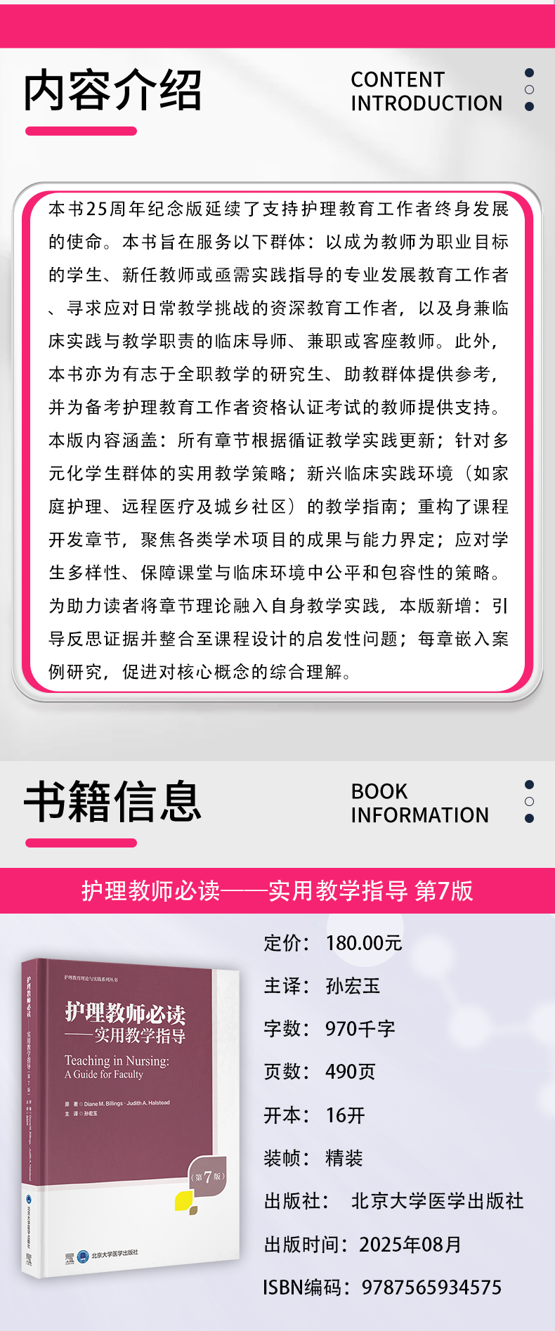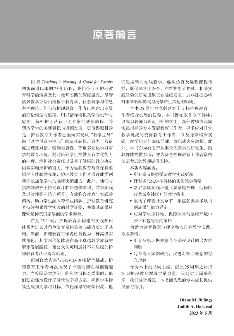 本书25周年纪念版延续了支持护理教育工作者终身发展的使命。本书旨在服务以下群体:以成为教师为职业目标的学生、新任教师或亟需实践指导的专业发展教育工作者、寻求应对日常教学挑战的资深教育工作者,以及身兼临床实践与教学职责的临床导师、兼职或客座教师。此外,本书亦为有志于全职教学的研究生、助教群体提供参考,并为备考护理教育工作者资格认证考试的教师提供支持。本版内容涵盖:所有章节根据循证教学实践更新;针对多元化学生群体的实用教学策略;新兴临床实践环境(如家庭护理、远程医疗及城乡社区)的教学指南;重构了课程开发章节,聚焦各类学术项目的成果与能力界定;应对学生多样性、保障课堂与临床环境中公平和包容性的策略。为助力读者将章节理论融入自身教学实践,本版新增:引导反思证据并整合至课程设计的启发性问题;每章嵌入案例研究,促进对核心概念的综合理解。