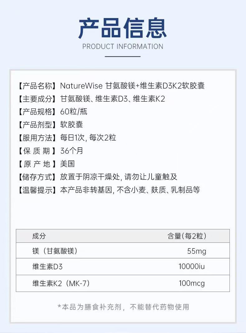 Naturewise牌甘氨酸镁+D3+K2软胶囊60粒