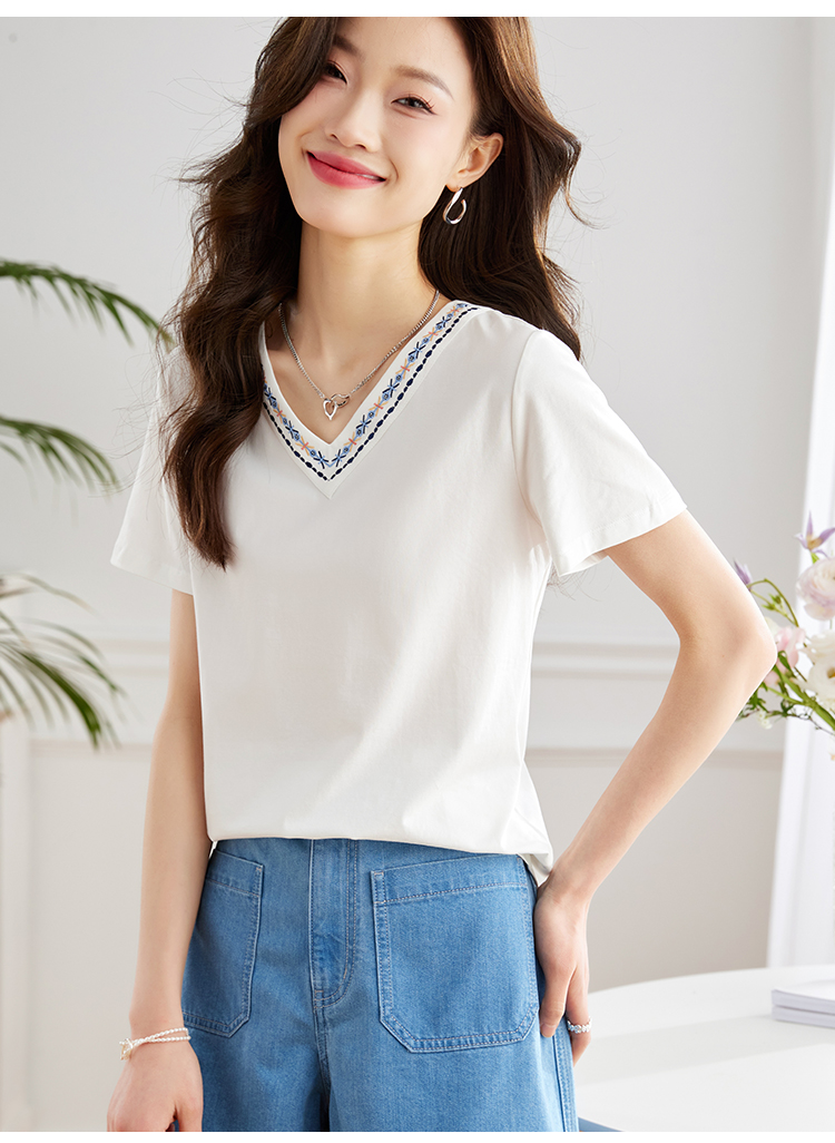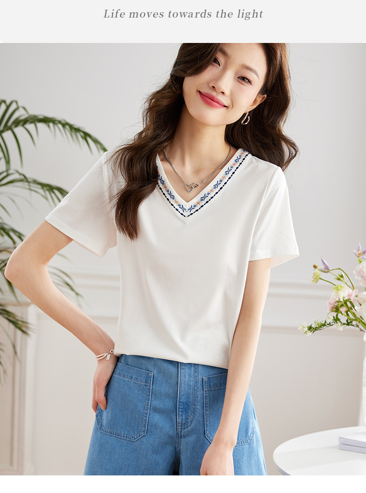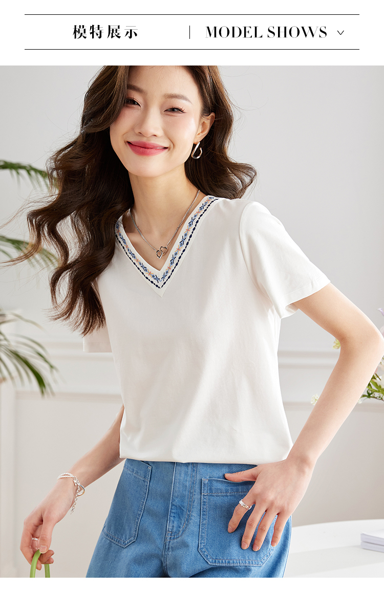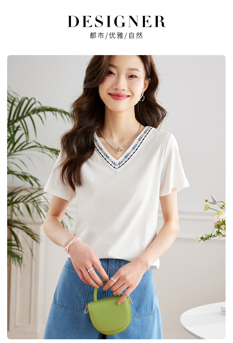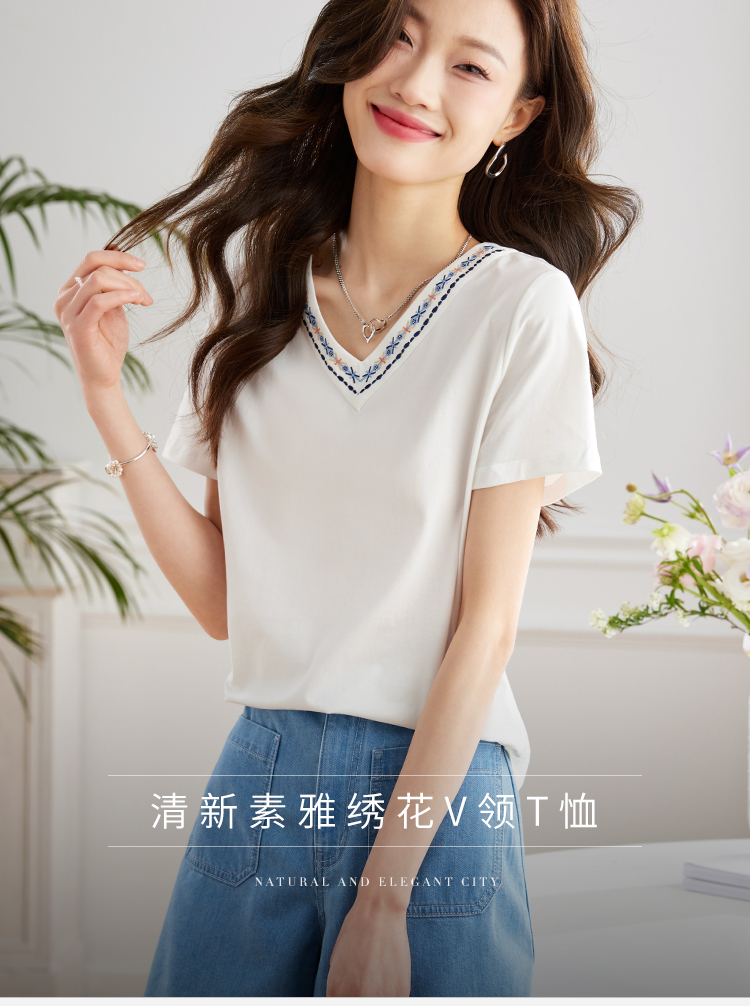 【专属特价】熙世界2025夏季新款设计感复古刺绣V领T恤女短袖时尚宽松显瘦上衣