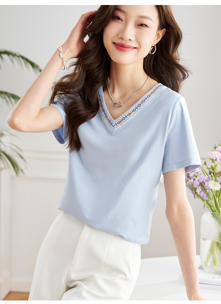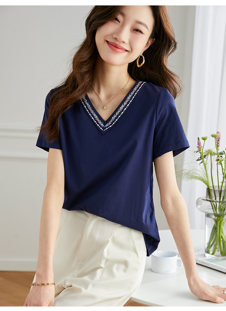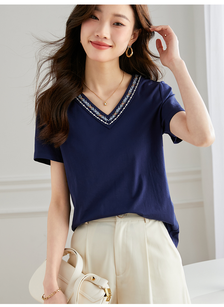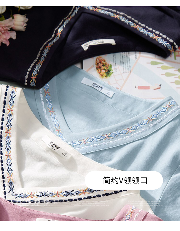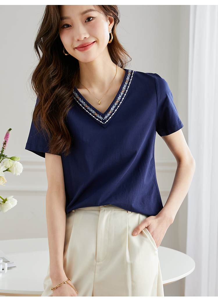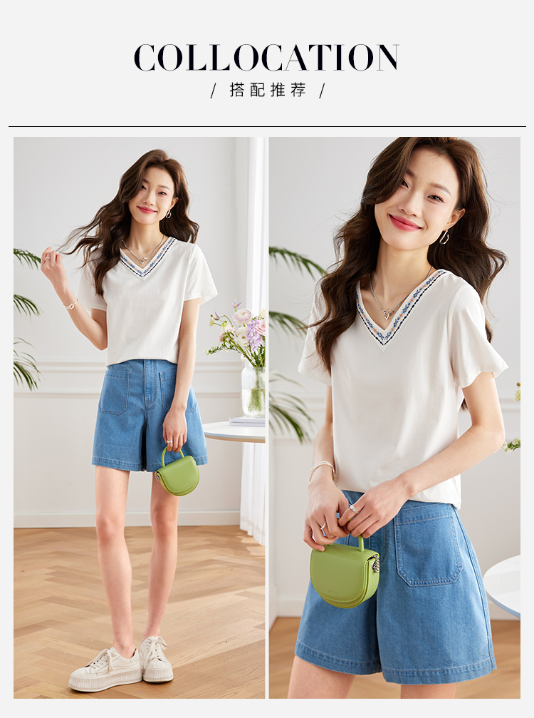 【专属特价】熙世界2025夏季新款设计感复古刺绣V领T恤女短袖时尚宽松显瘦上衣