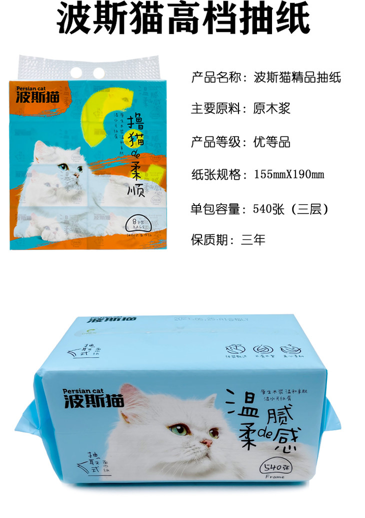 波斯猫精品三层抽取式面纸8包540张 (155*190)