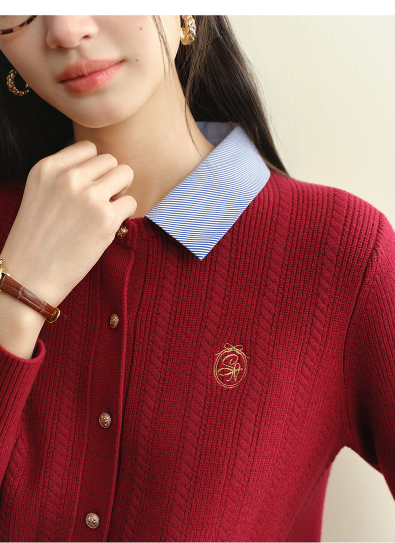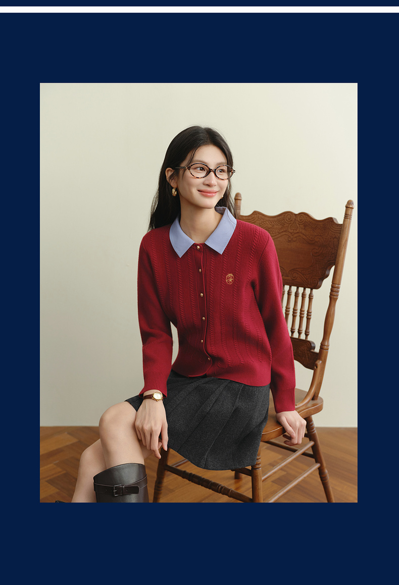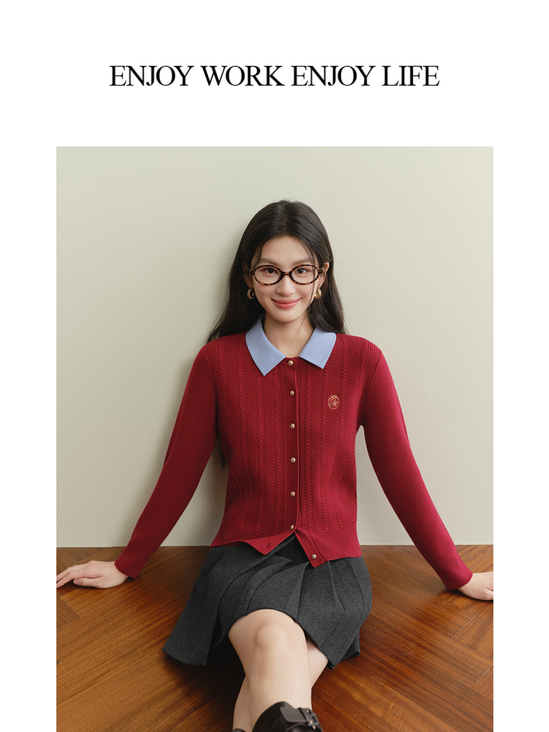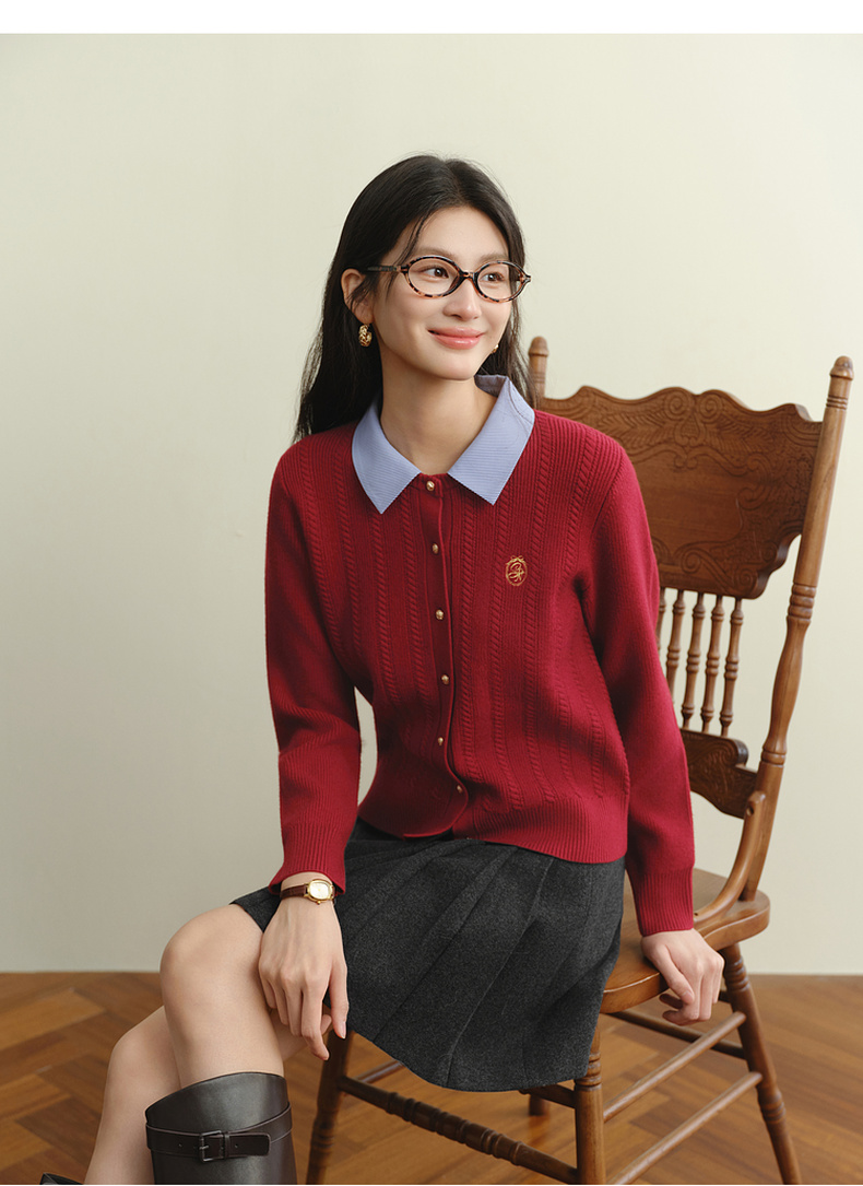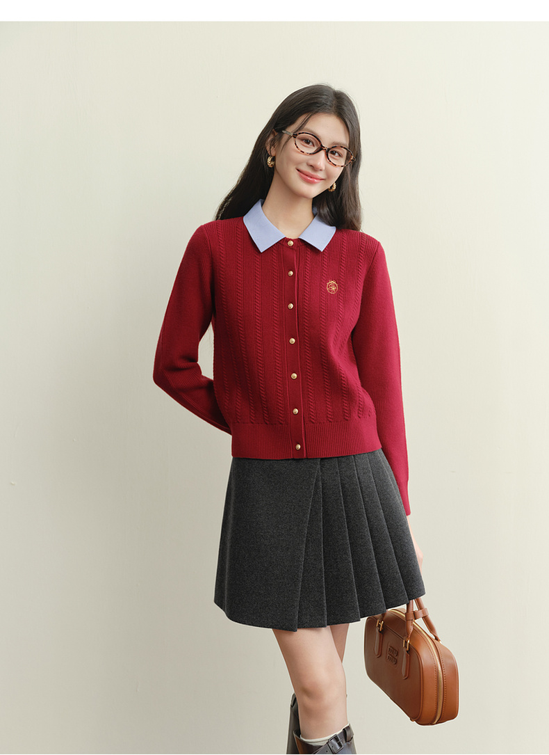 【严选】诗凡黎可脱卸领金扣麻花针织开衫2025冬新款学院风刺绣针梭拼毛衣7GC133411