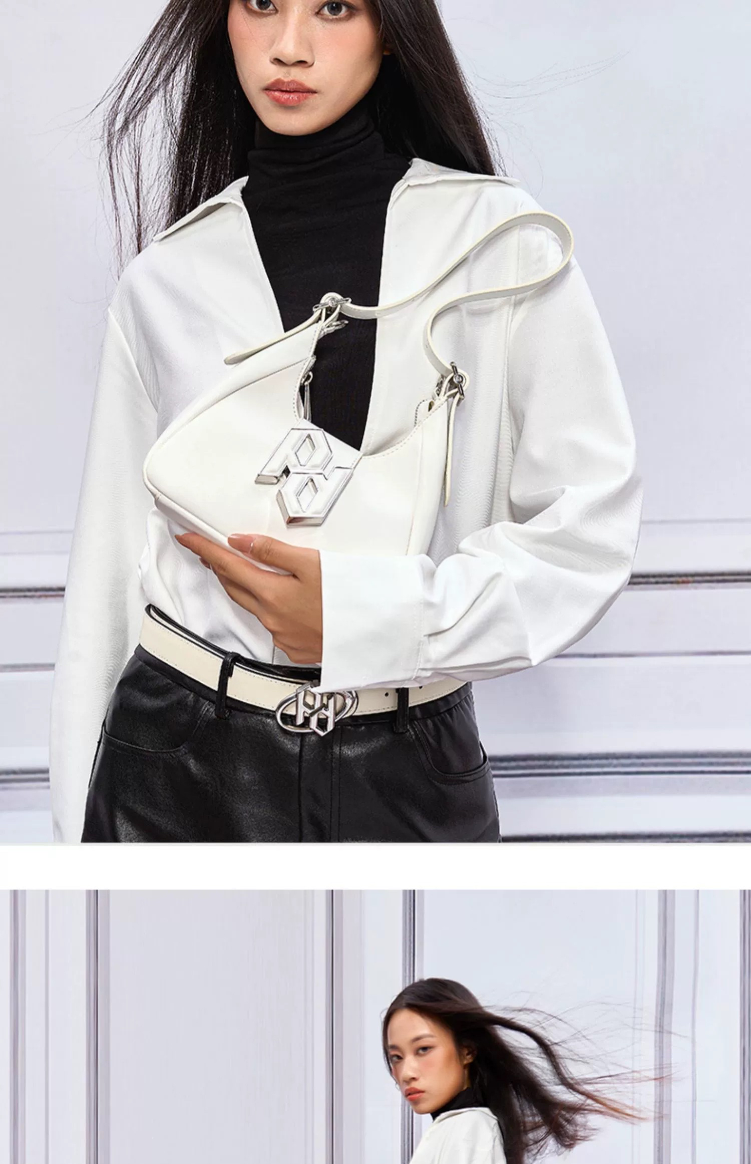 粉白撞色拼接压褶半裙