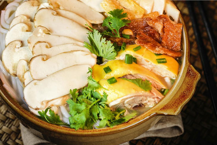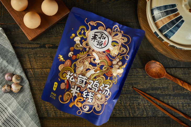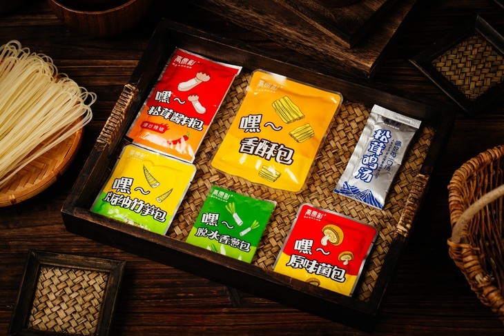 3.煮熟的米线换水,重新倒入新的开水在锅中,加入松茸酱料包、松茸鸡汤包、香酥包、原味菌包继续煮2分钟左右