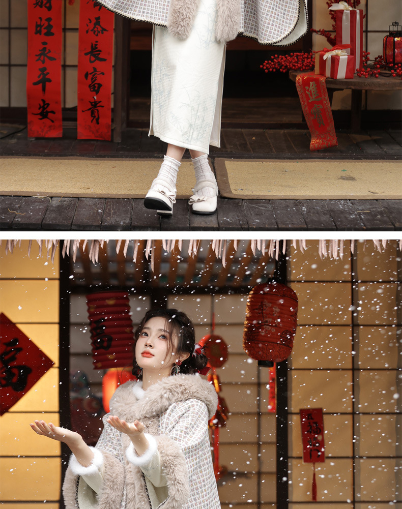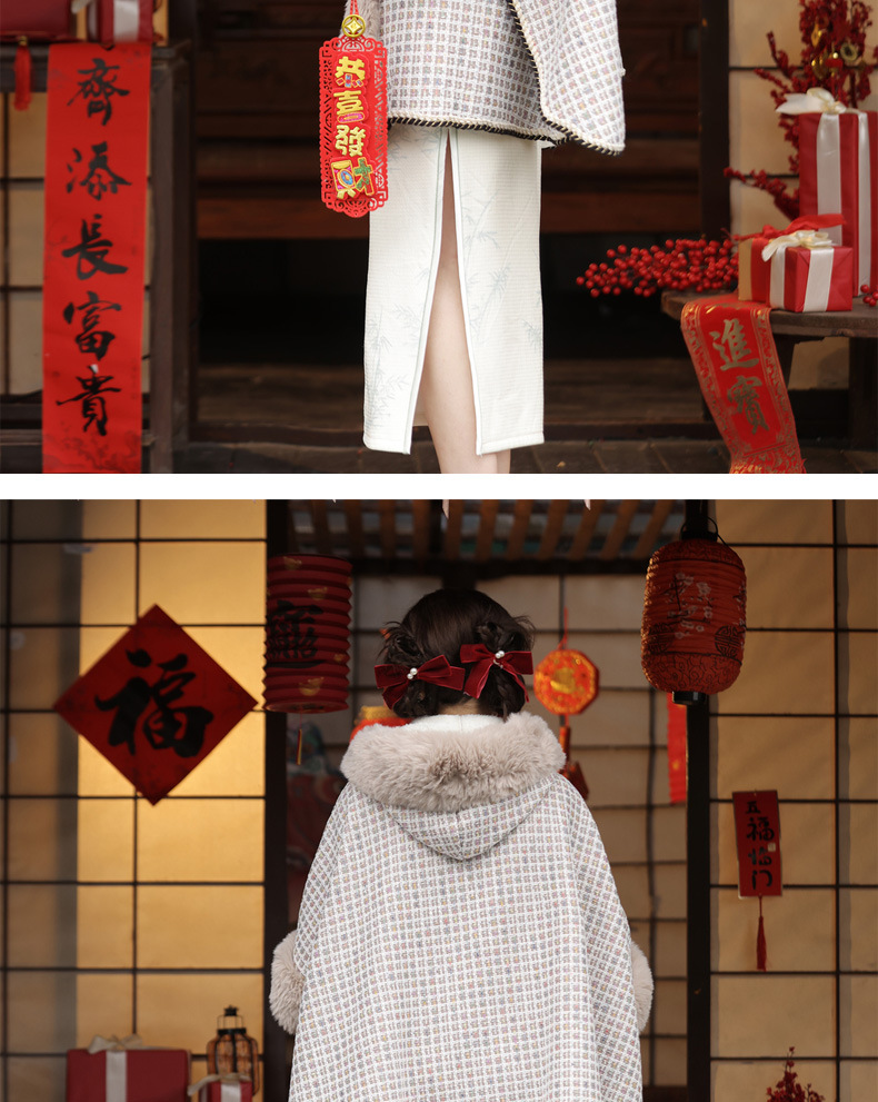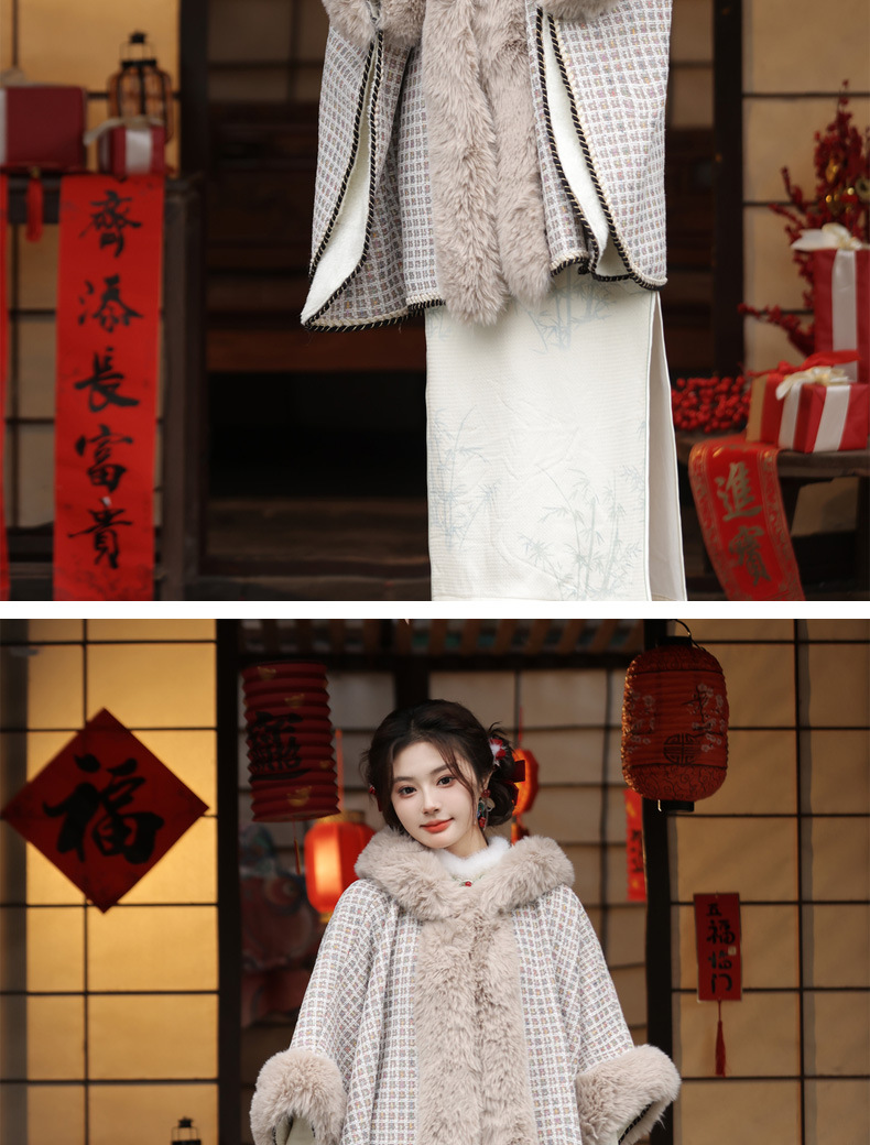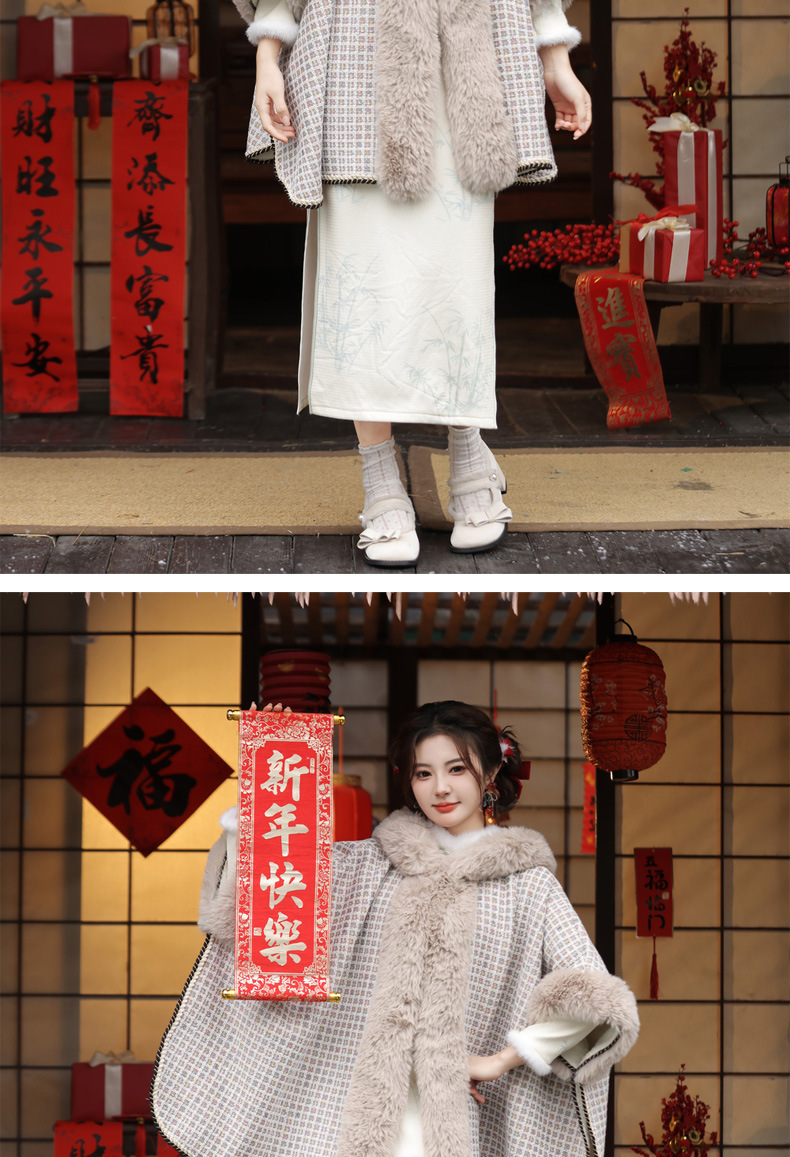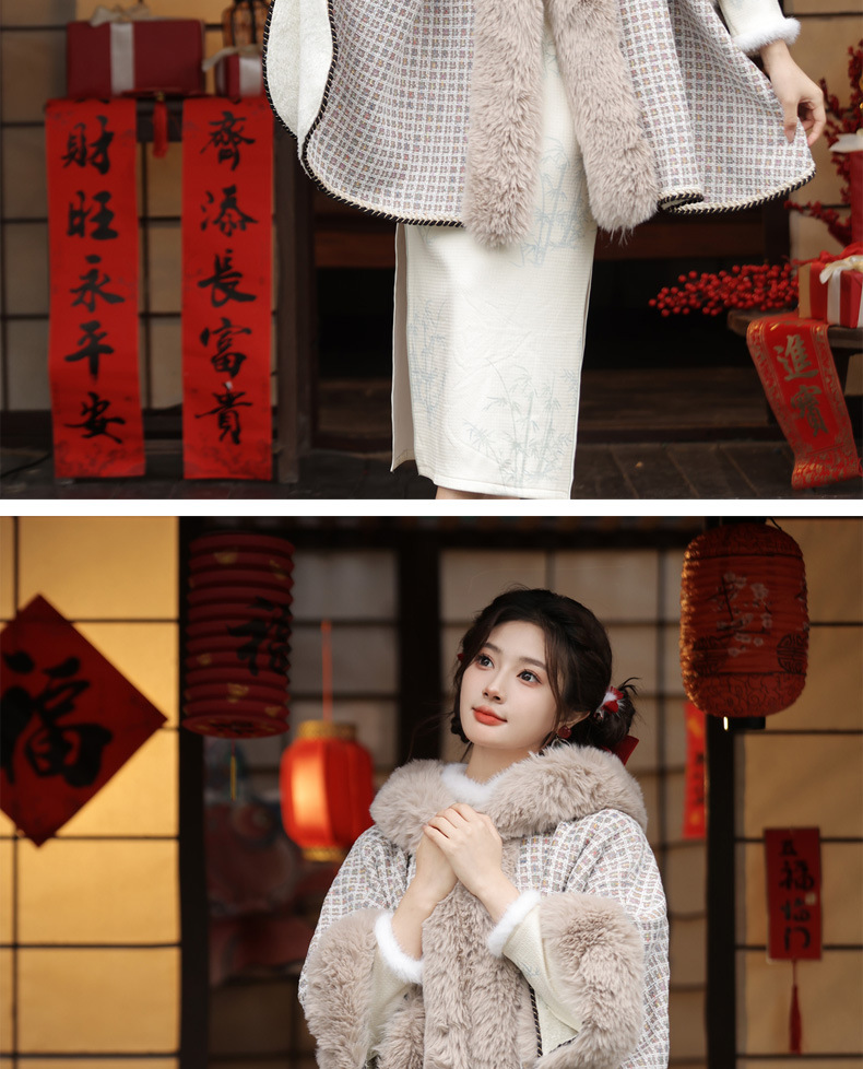 冬款古风披肩,大毛领格纹加厚保暖水貂绒斗篷外搭MLS-127
