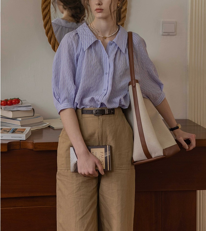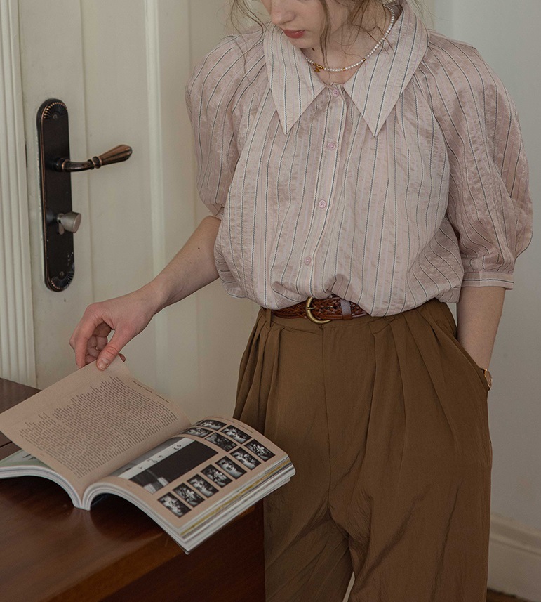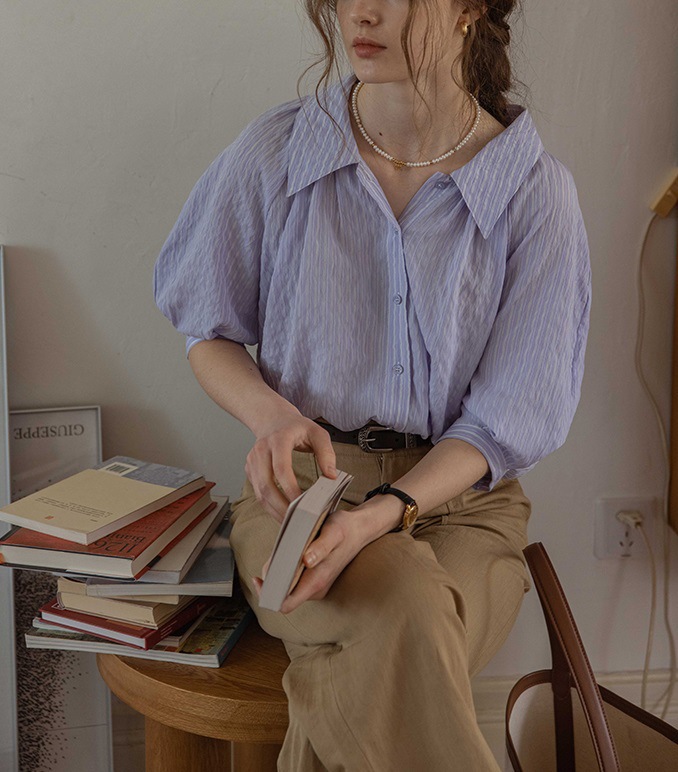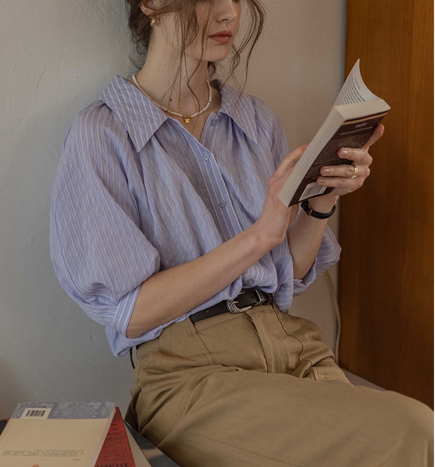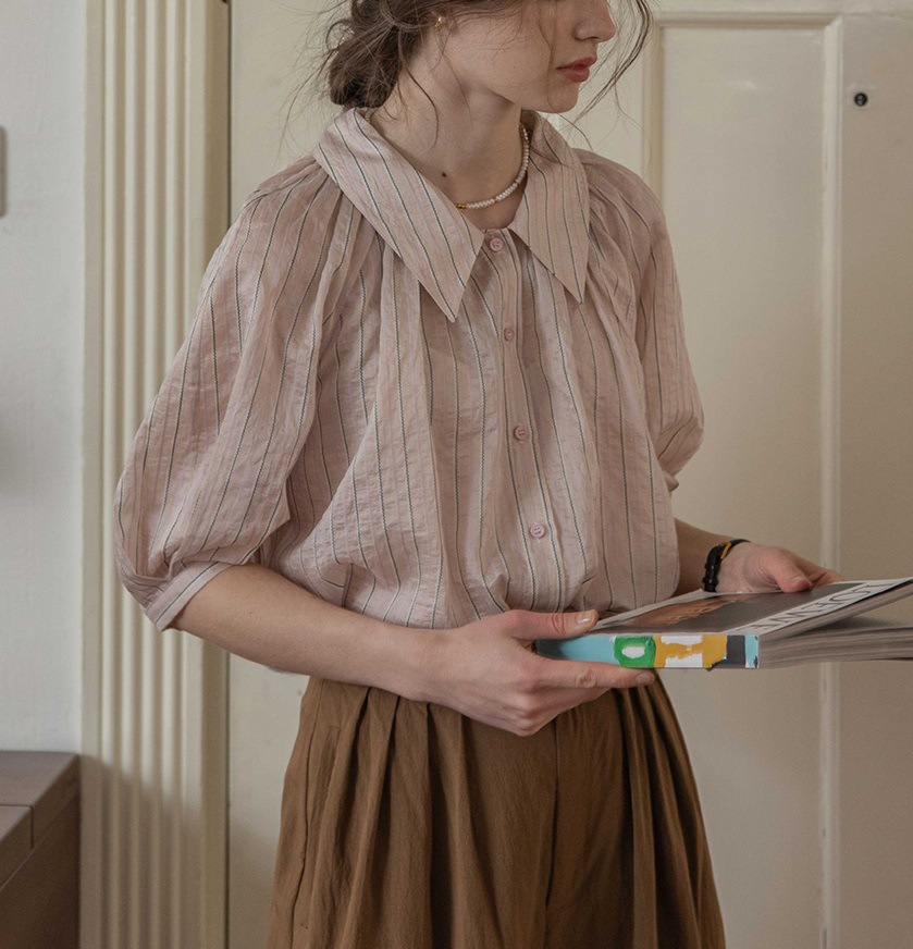 【小众设计!出门不撞衫系列】夏季日系复古宽松条纹衬衫,衫法式肌理感抽皱中袖,轻奢小衫上衣女L