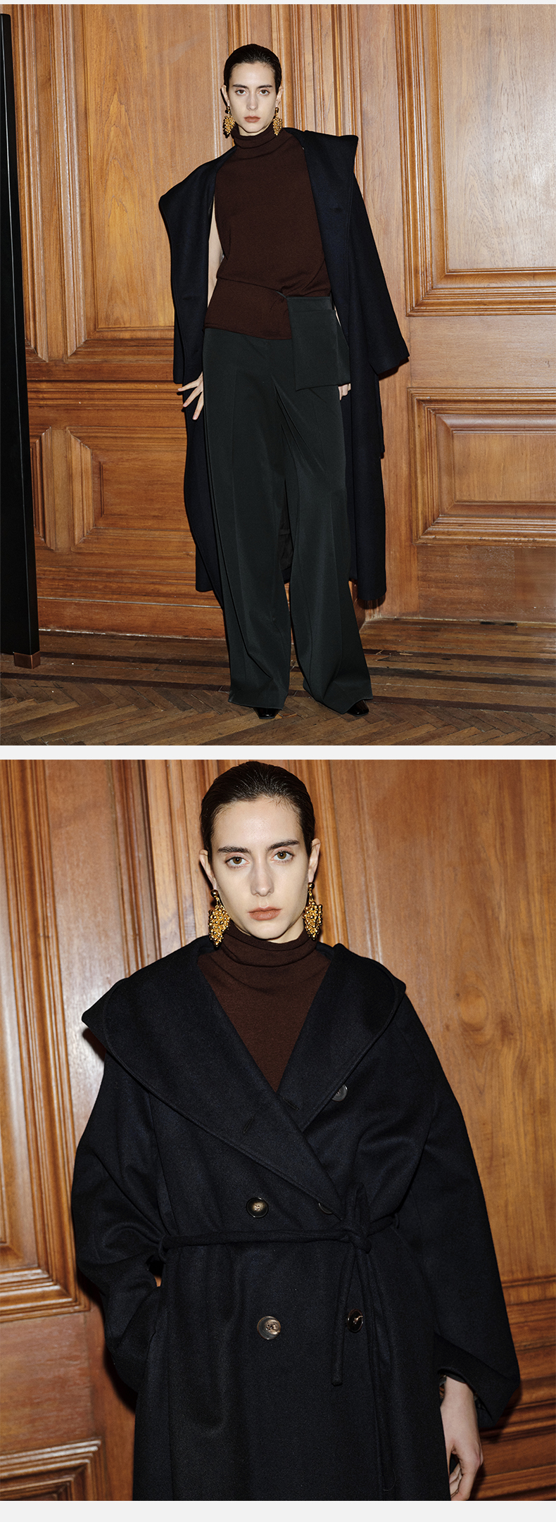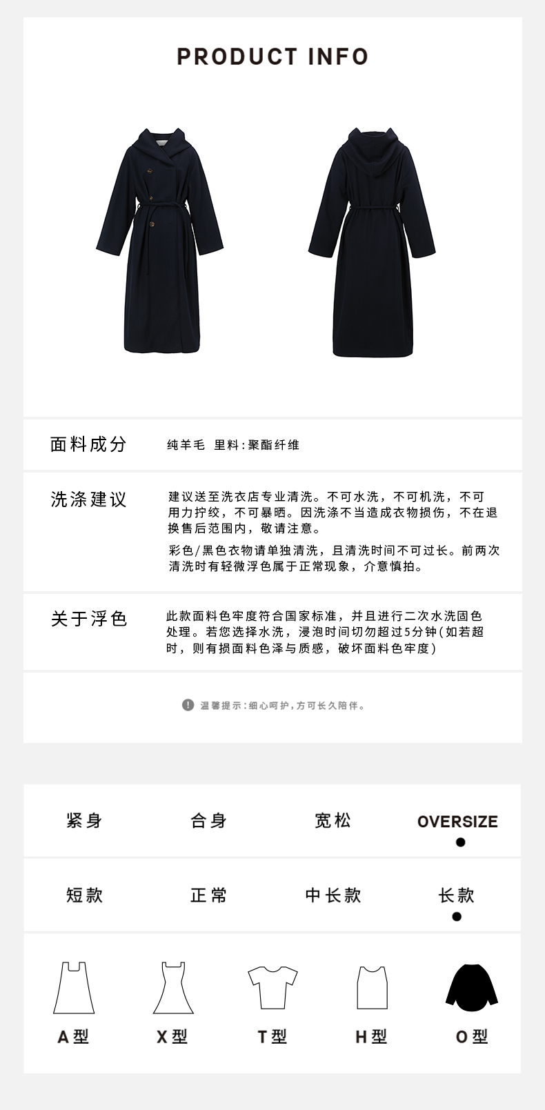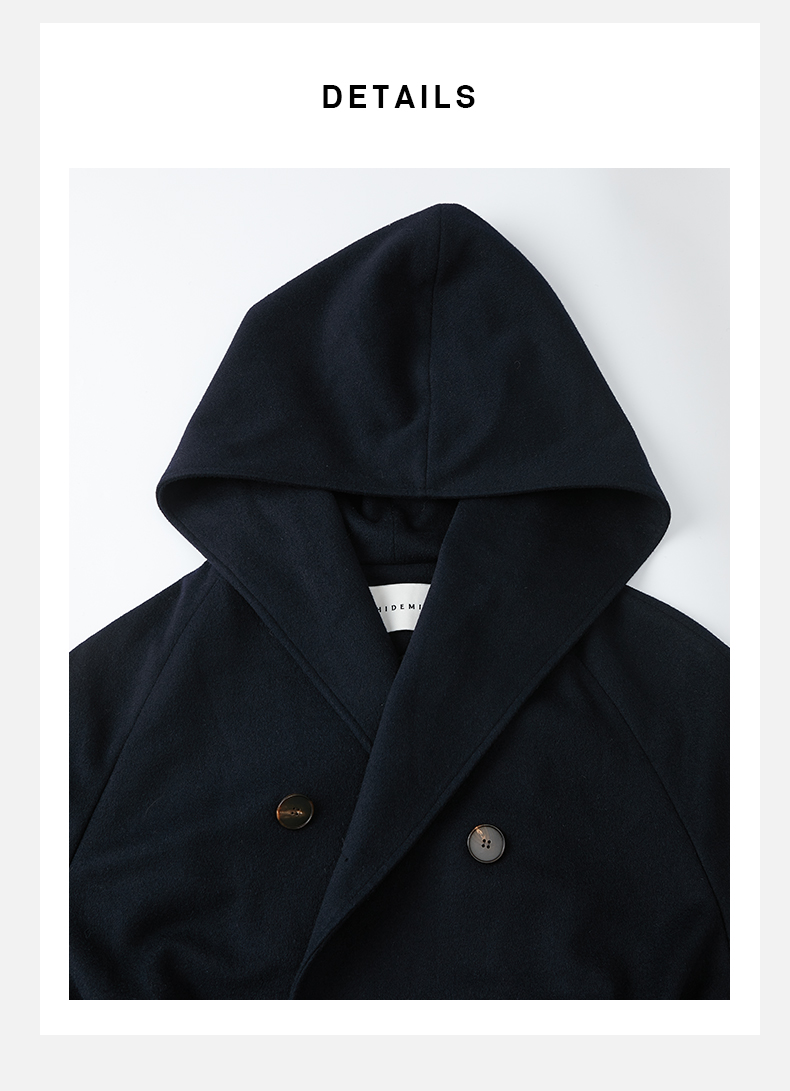 HIDEMI 节日系列藏蓝色大廓形连帽浴袍式腰带设计感长款双排扣美利奴羊毛大衣