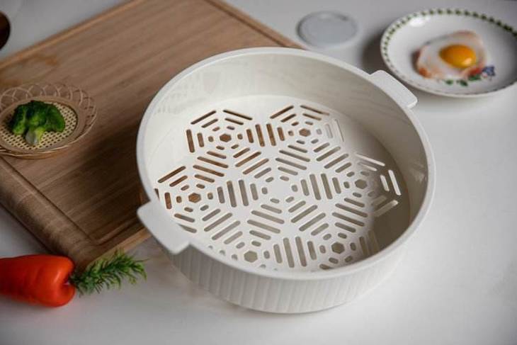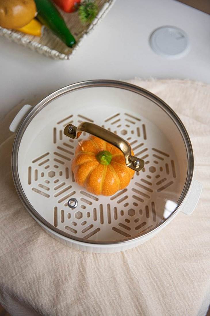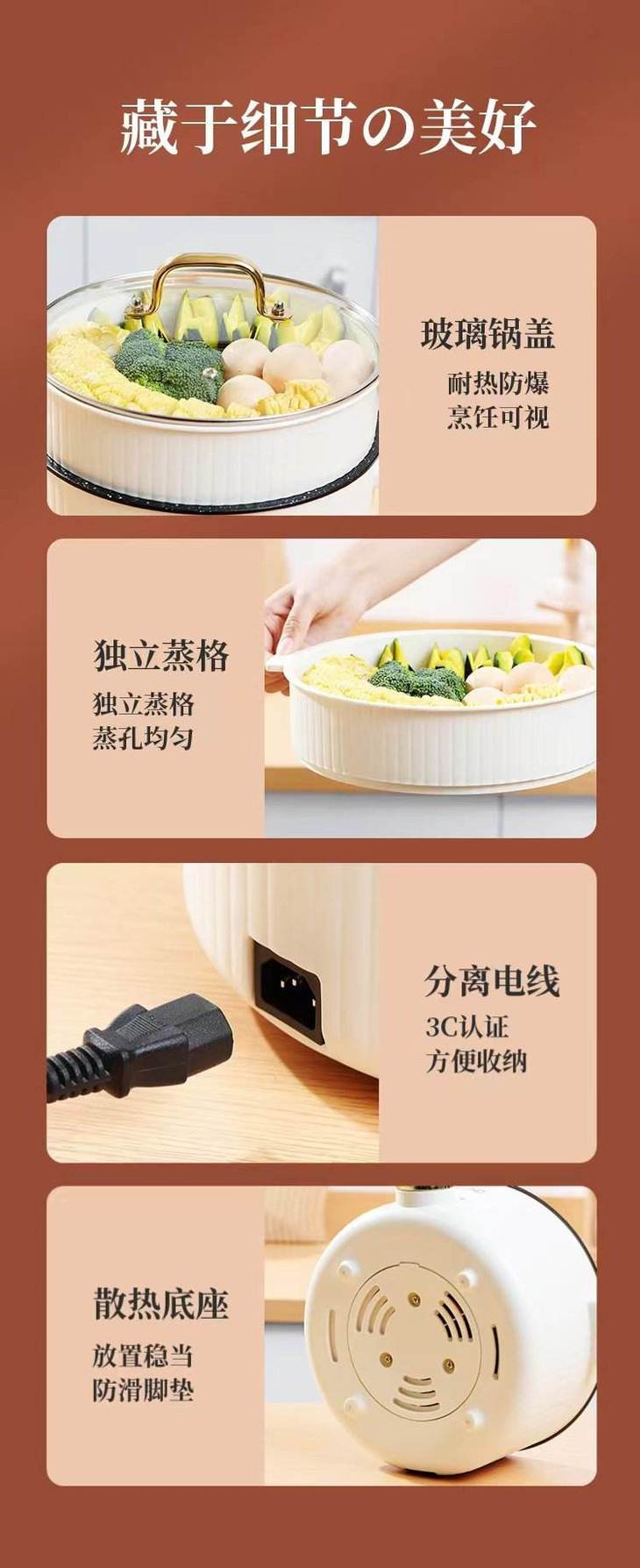 藏于细节の美好 玻璃锅盖,耐热防爆,实现烹饪可视。 独立蒸格,蒸孔均匀,好清洗。 3C认证,分离电线,安全有保障。 方便收纳,散热底座, 防滑脚垫,放置稳当。