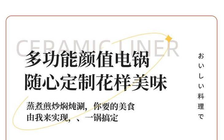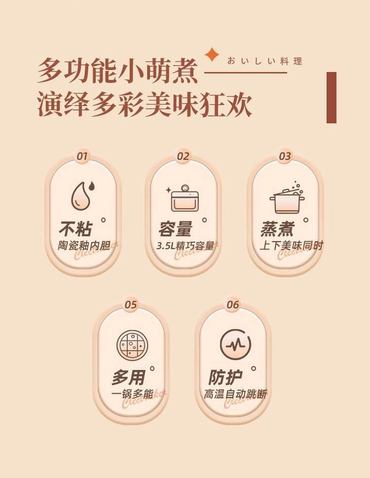 多功能小萌煮おいしい料理,一锅多能。 演绎多彩美味狂欢, 安全不粘陶瓷釉内胆,做宝宝的辅食也能安心完成。 精巧容量3.5L刚刚好, 蒸煮一体,上下美味同时演绎。 安全防护,高温自动跳断。