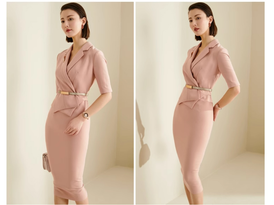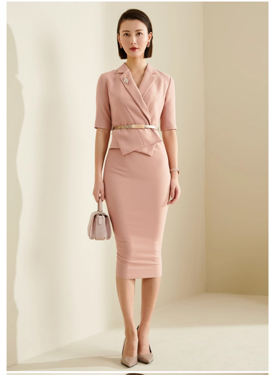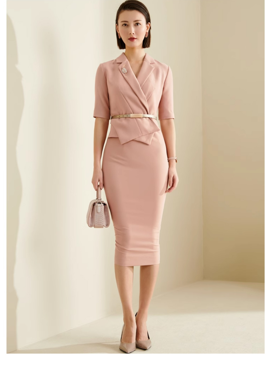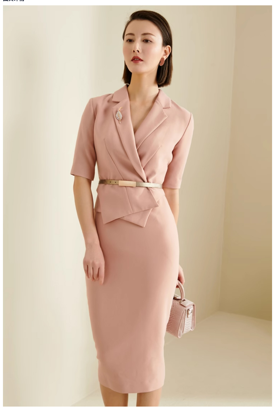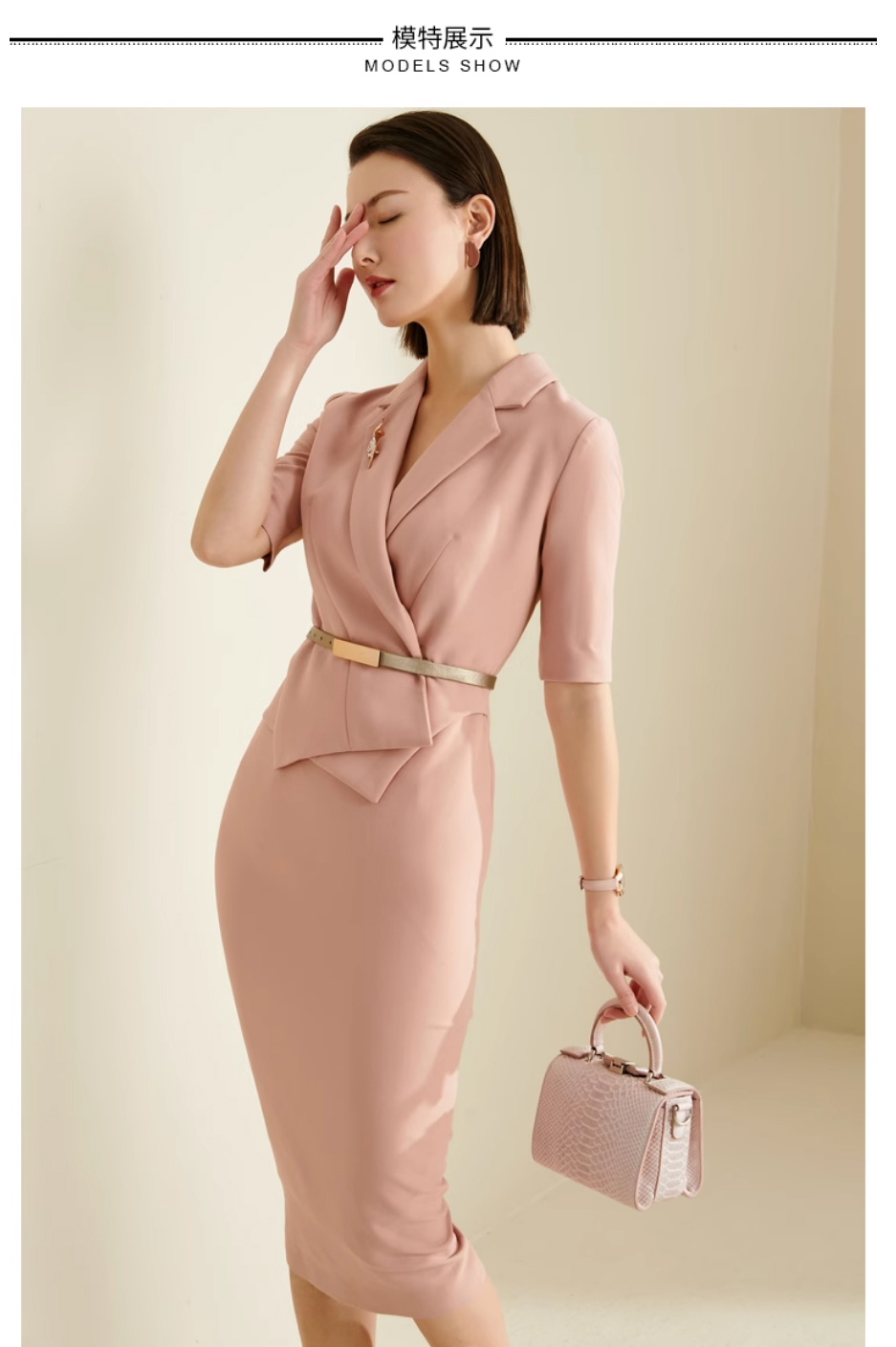 颈袖添香连衣裙修身职业OL通勤女西装裙包臀显瘦粉色商务主持人JD382965
