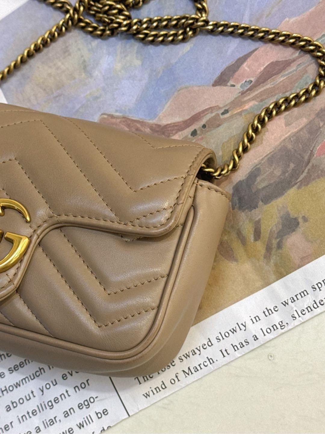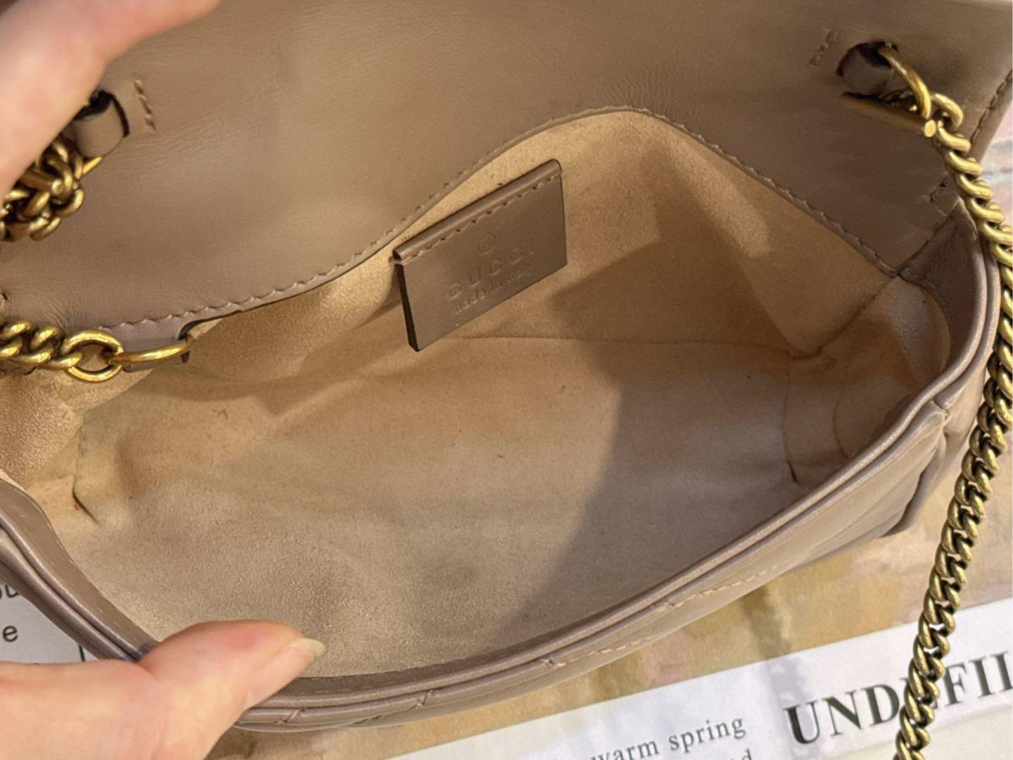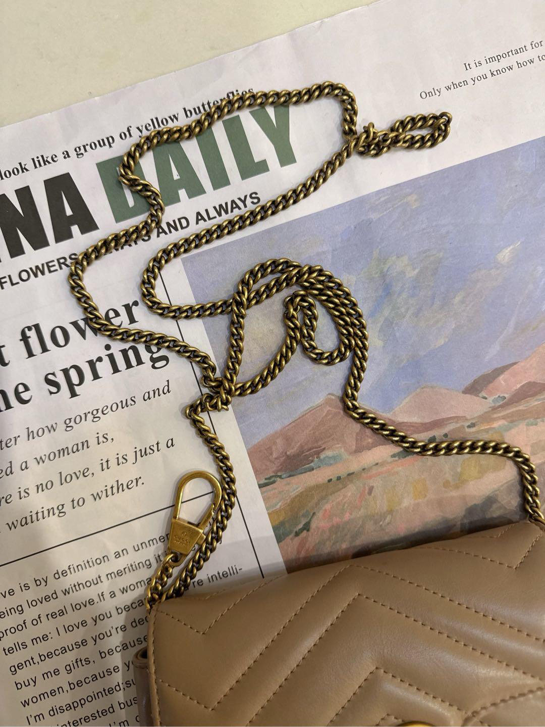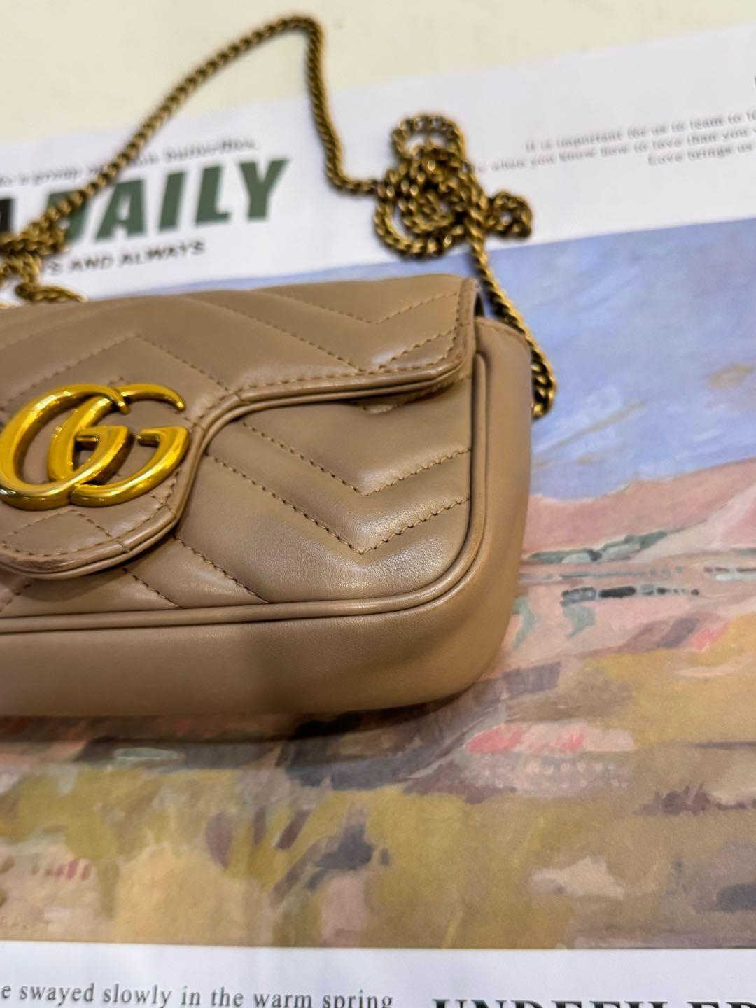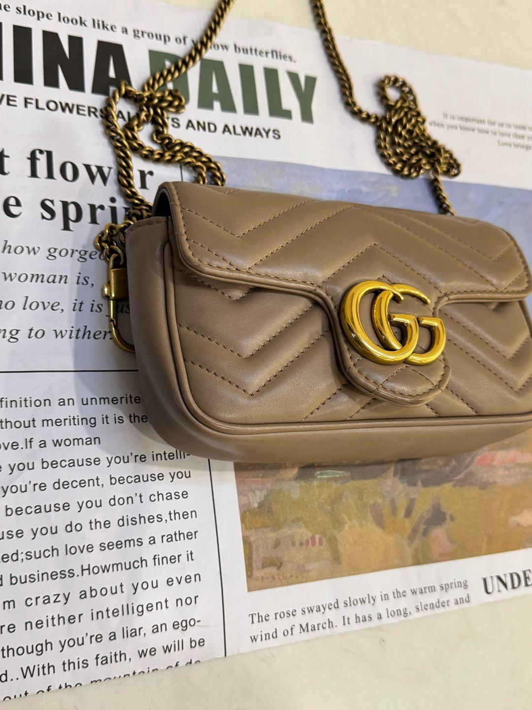 【商品詳情】正品二手 Gucci 马蒙 mini 牛皮 奶茶色 斜挎包🫧95新 17x9 配件:链条 龙虾扣 防尘袋。包边和内里正常使用感。温柔可爱精致