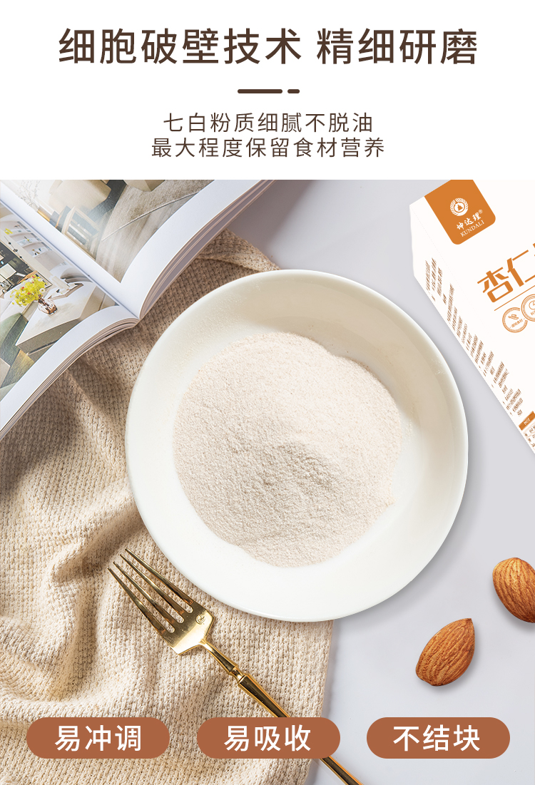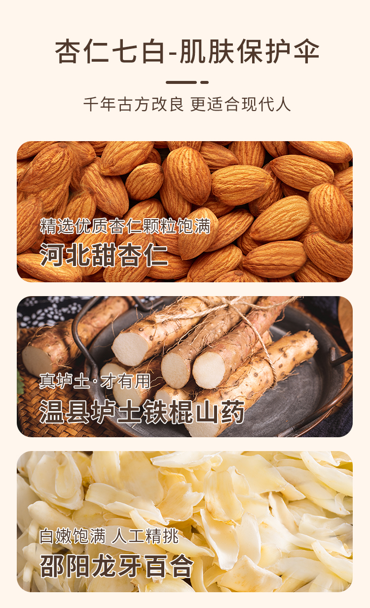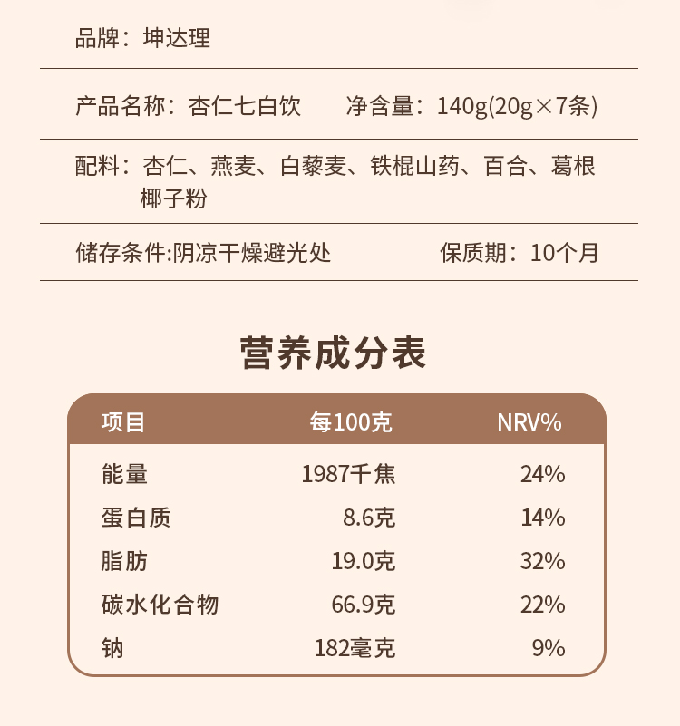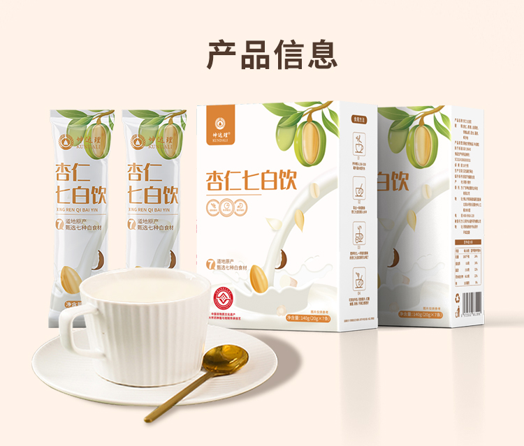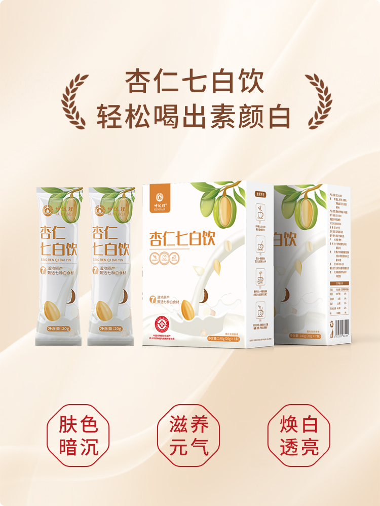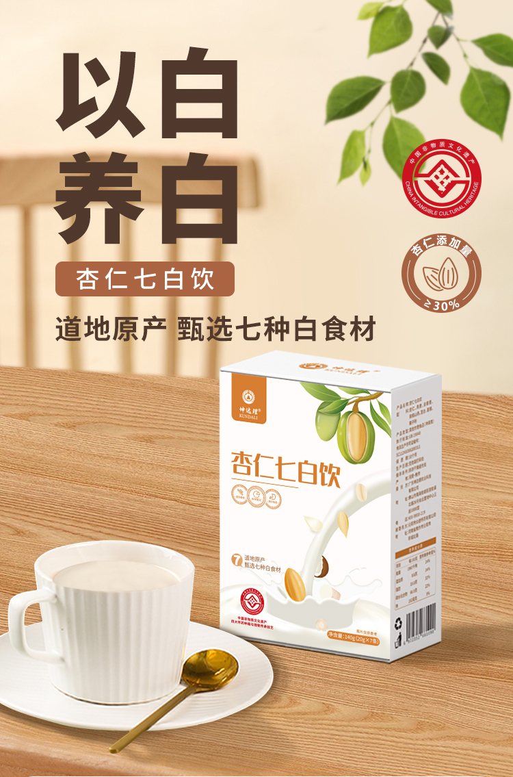 【坤达理】杏仁七白饮,非遗古法精选7种白食材,杏仁高含量高达30%,口感润滑好吸收。每盒140g(7袋*20g)