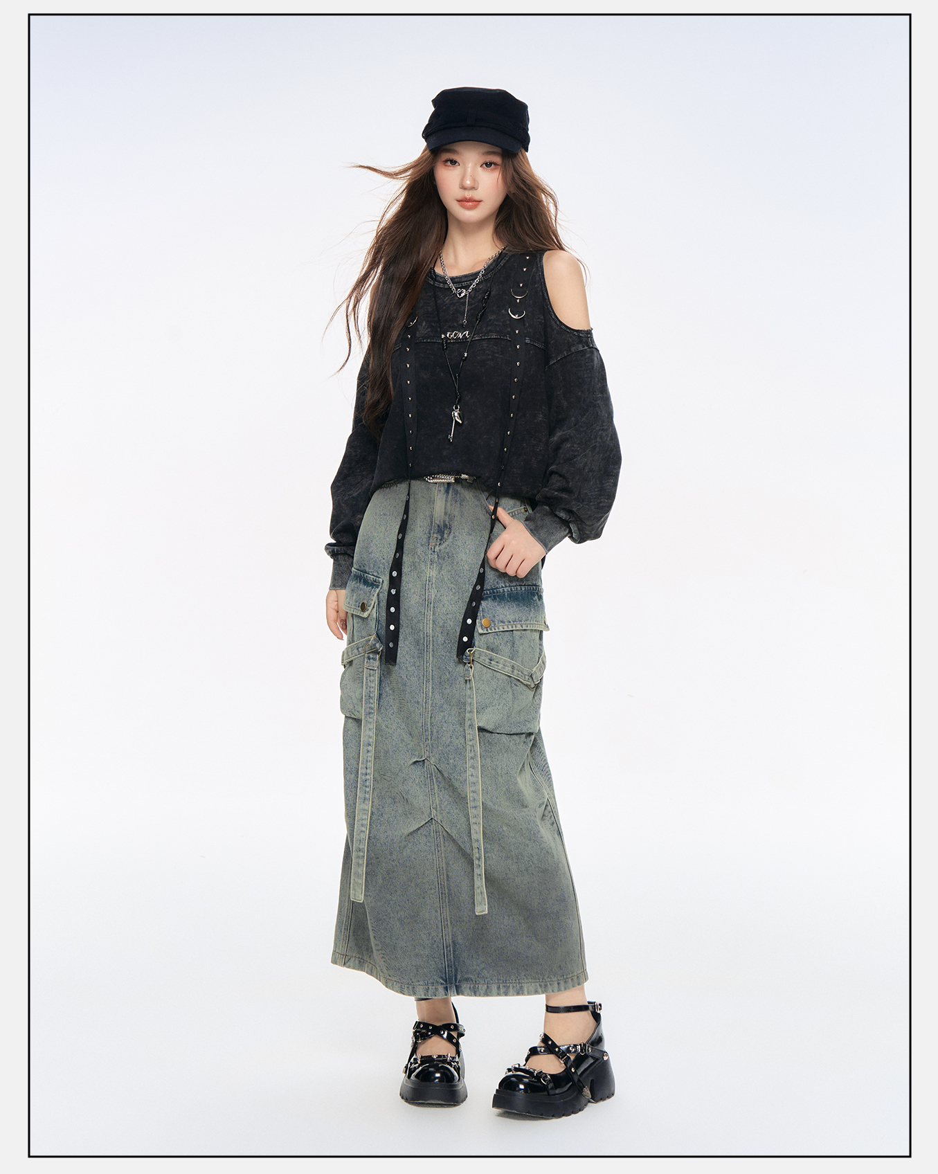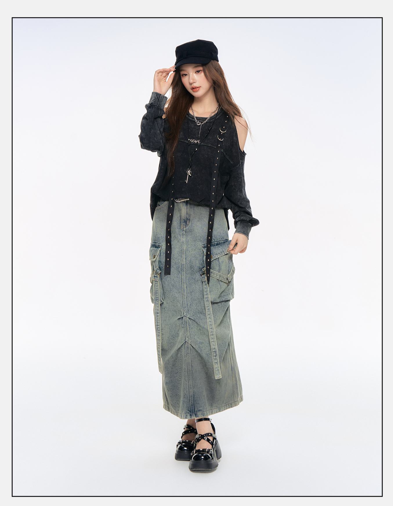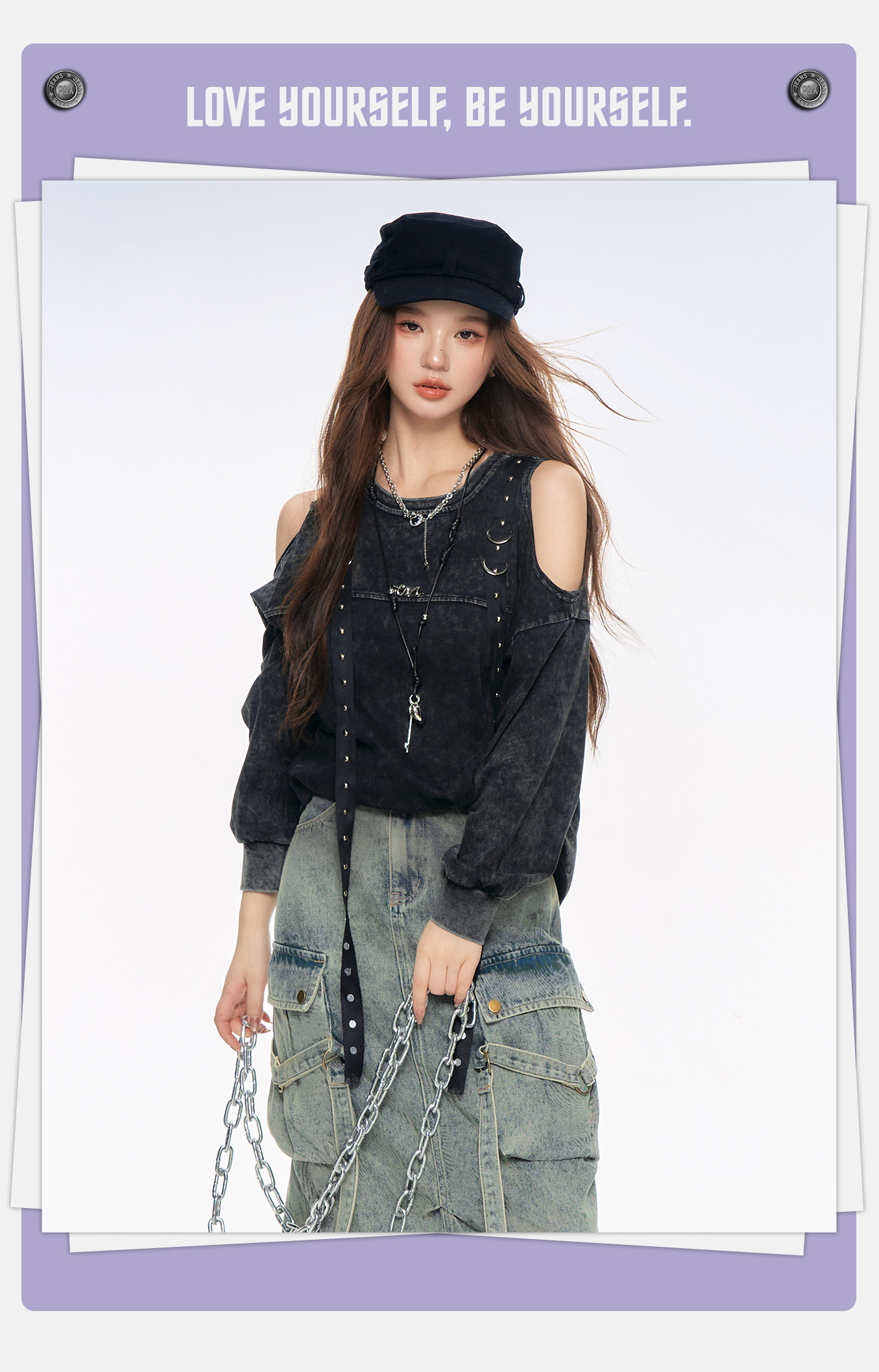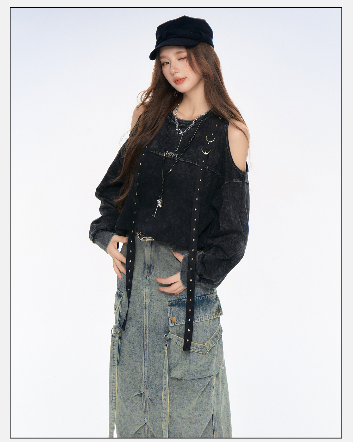 P&X设计师女装2025秋复古做旧铆钉针织长袖T恤825302210 黑色