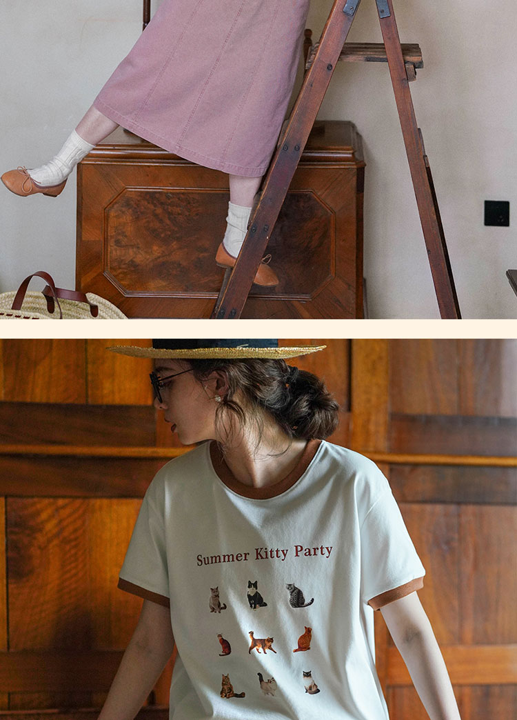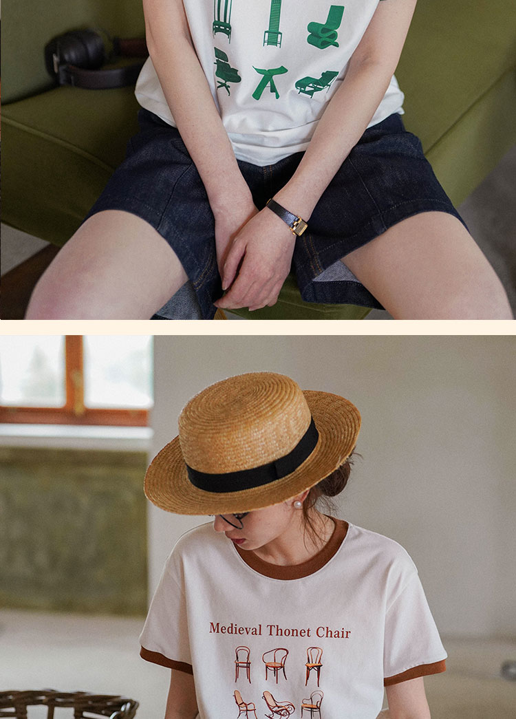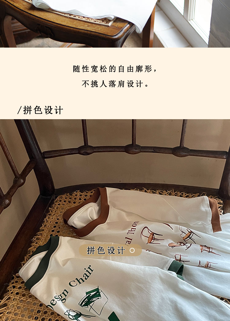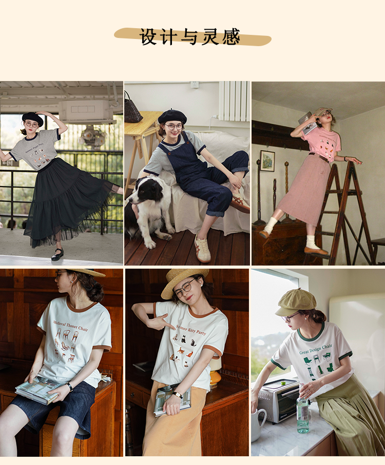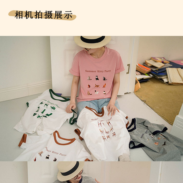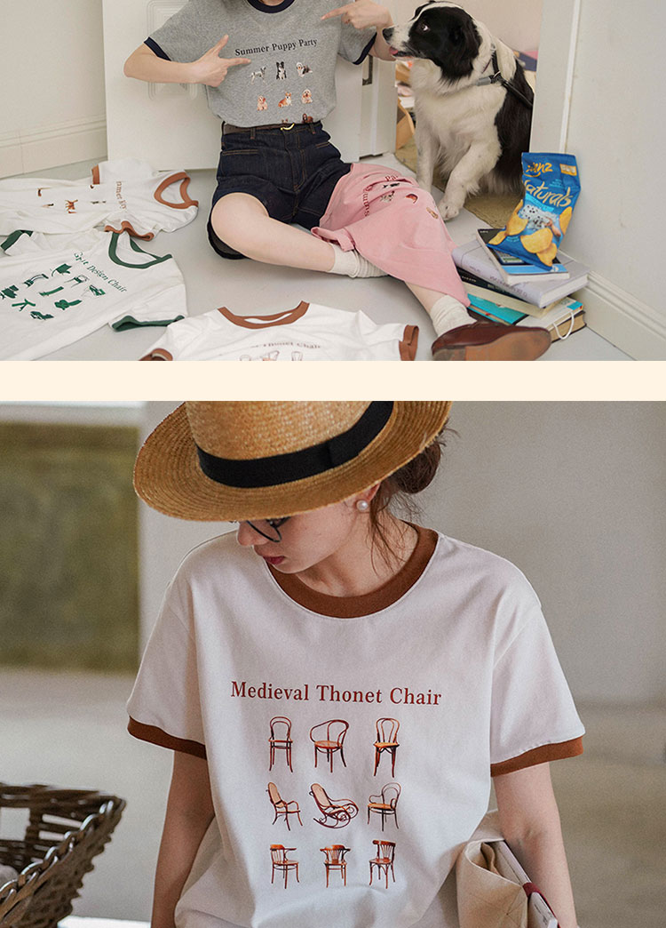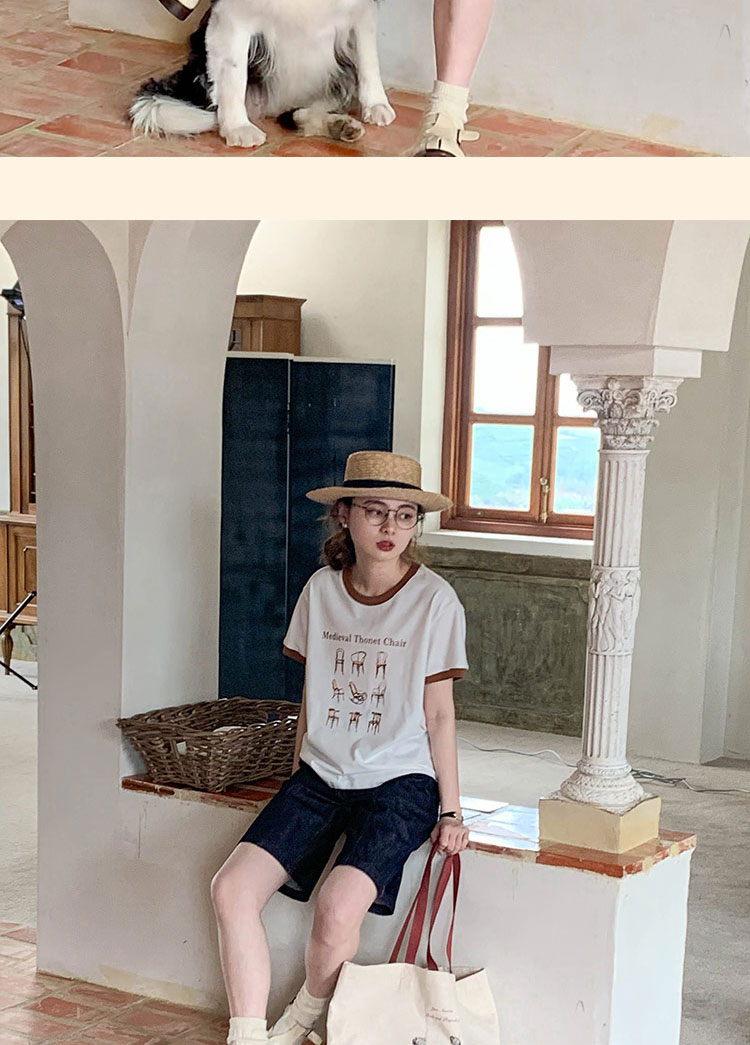 浮生八记/23A067/拼色猫狗椅子印花T恤短袖