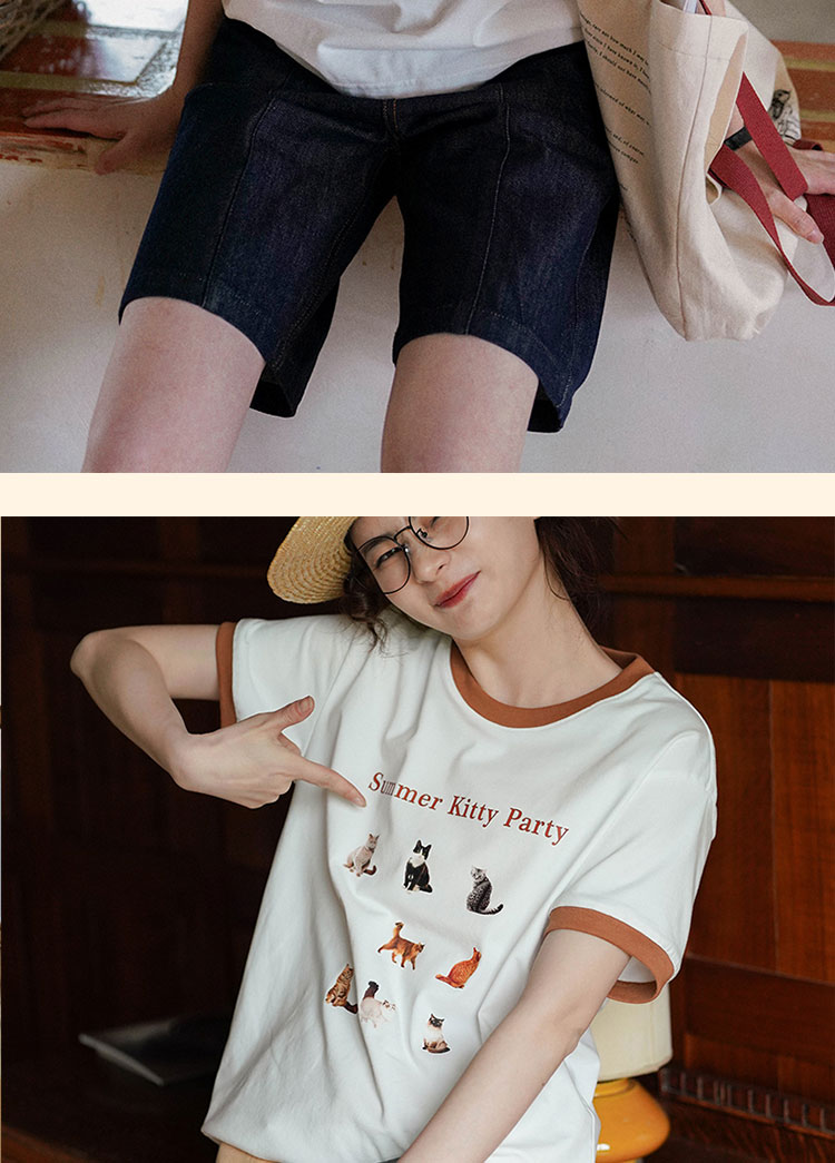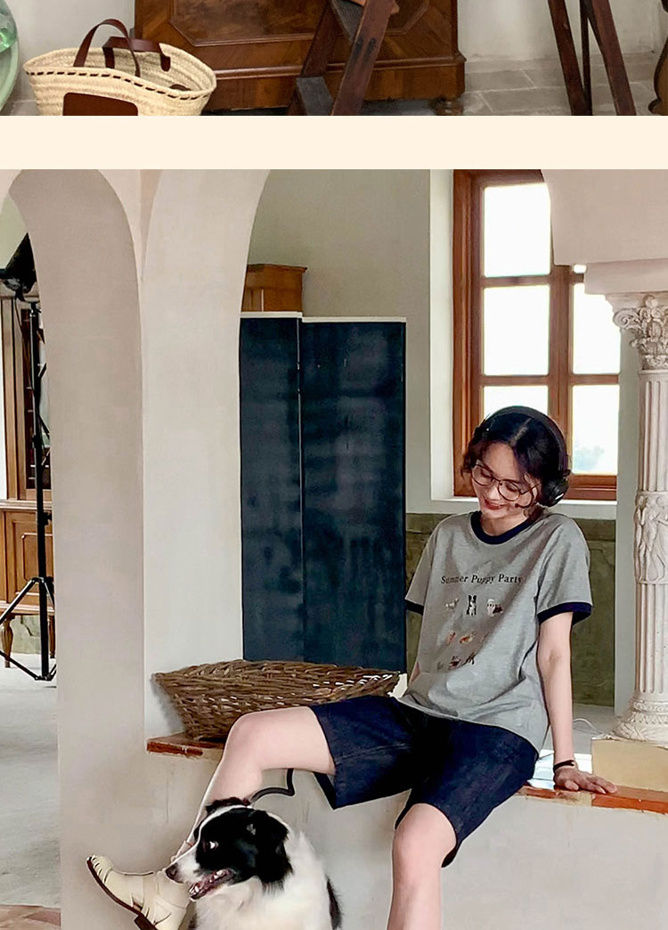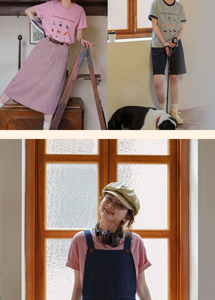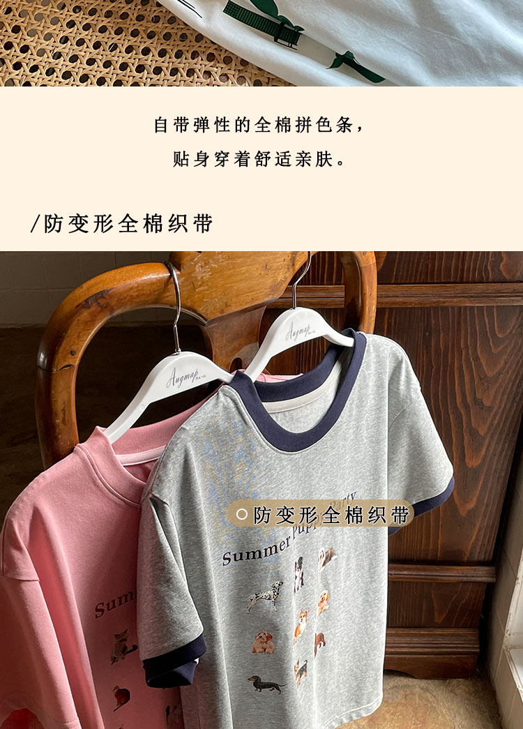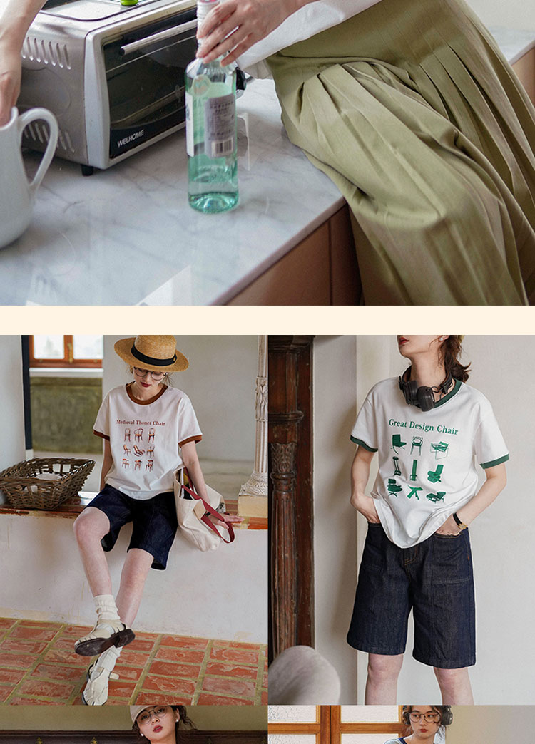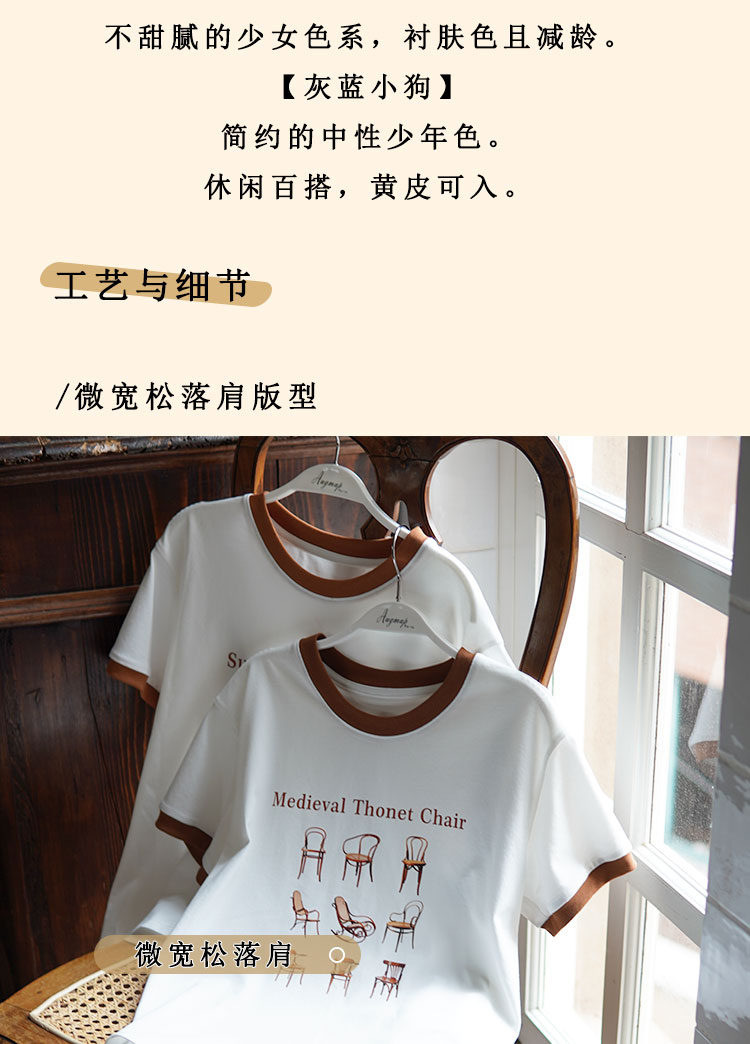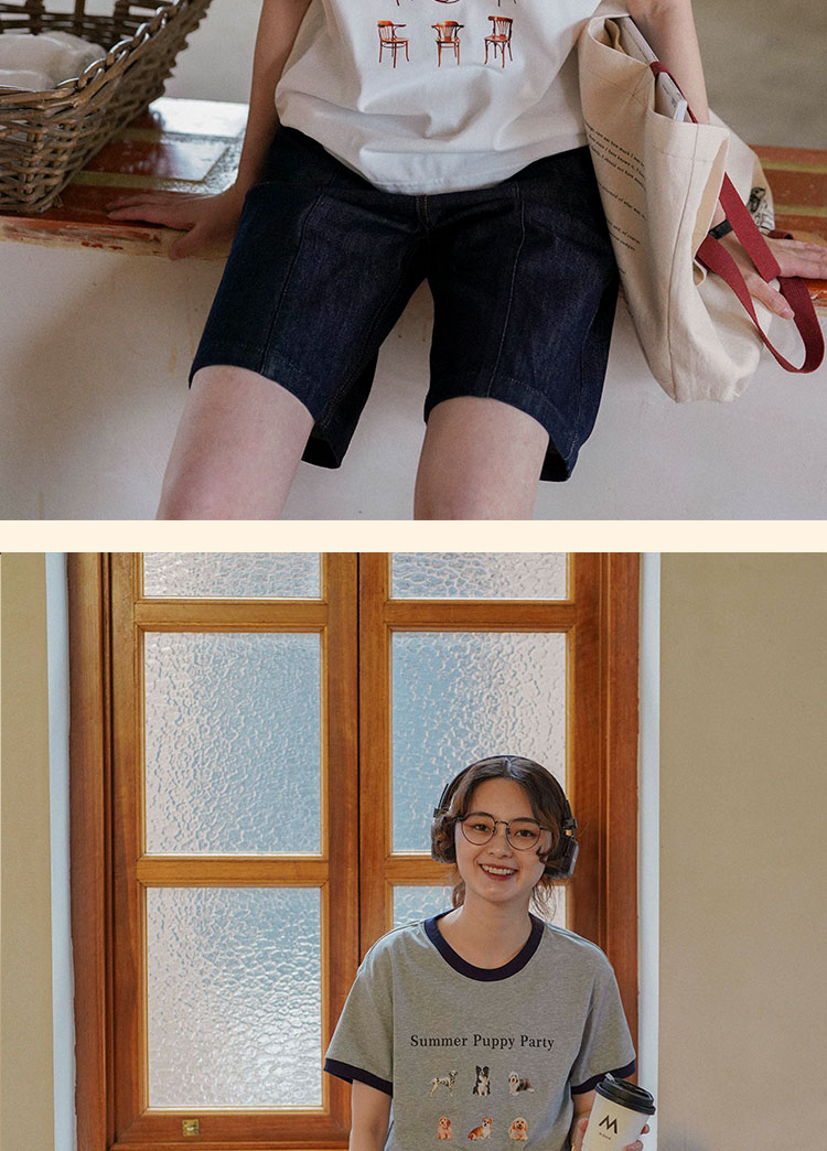 浮生八记/23A067/拼色猫狗椅子印花T恤短袖