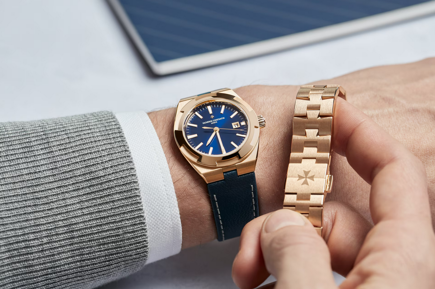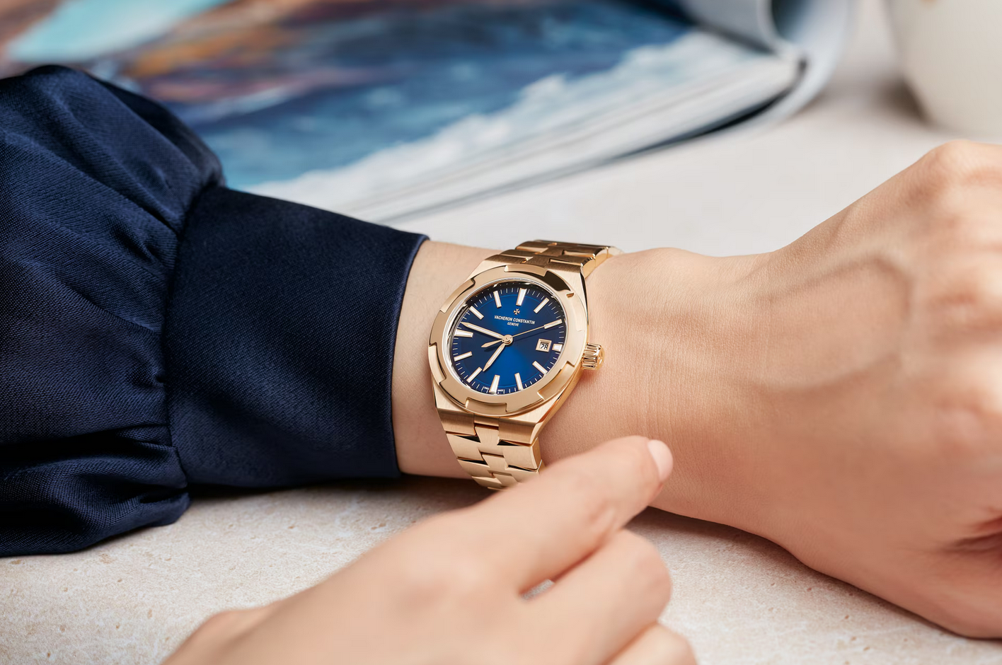 镜面材质 | 蓝宝石水晶玻璃 | 表盘 | 18K粉红金表壳 半透明蓝色调漆面,旭日纹缎面拉丝表盘,天鹅绒质感分钟刻度圈,时标、时针和分针均覆有蓝色Super-LumiNova®夜光涂层 精钢配有防磁软铁内圈表圈 镂雕底盖可见22K金摆陀,其装饰灵感源自风向玫瑰罗盘图案 日期显示 透底 |