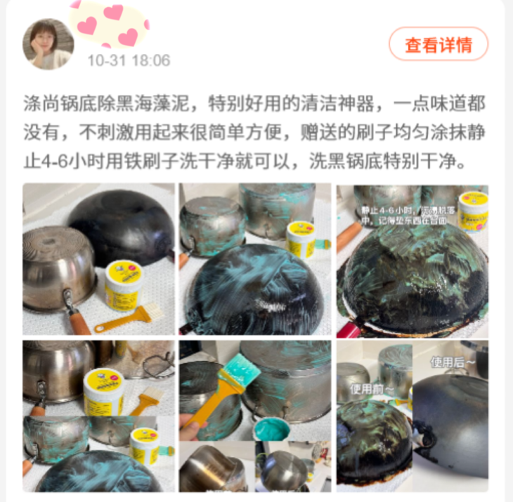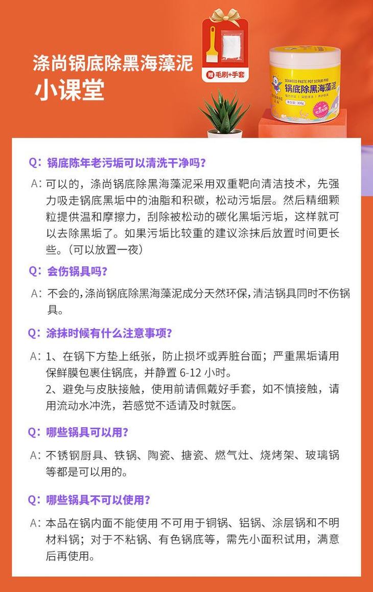 √海藻泥多孔结构,强力吸附锅底黑垢中的油脂和积碳,轻松瓦解顽固黑垢 √精细颗粒,温和研磨,刮除被松动的碳化黑垢,去污更彻底 √温和安全,海藻泥成分天然环保,采用物理吸附+温和研磨的作用方式,不伤锅具 √多种锅具均可使用,使用范围更广