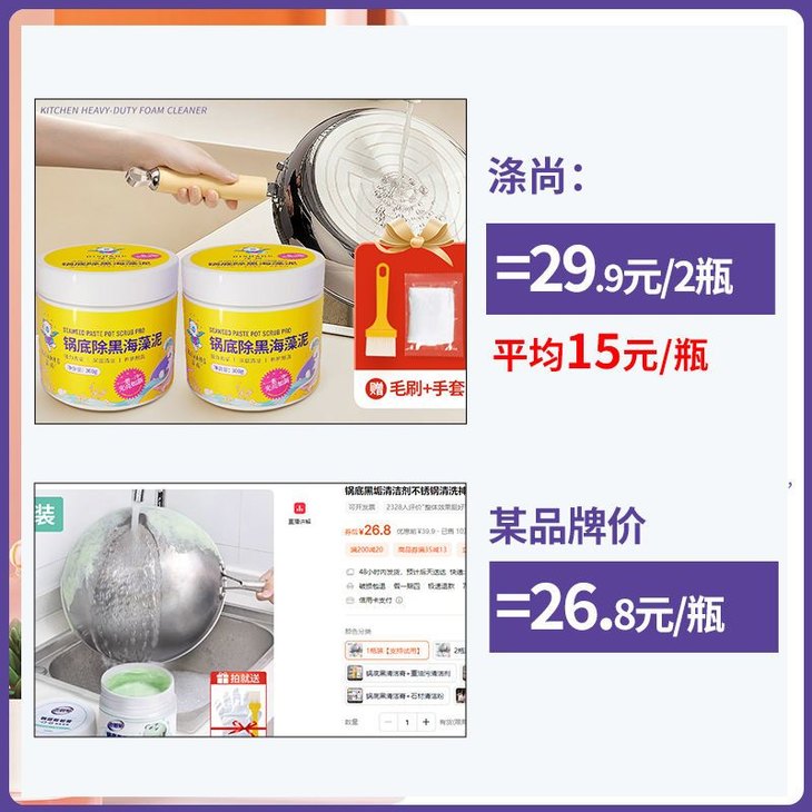 市面上的锅底清洁产品非常的多, 为了让大家不踩雷,我们给大家做了份调查,把结果分享给大家叭~ ①关于价格 像一些信得过的大品牌,一瓶锅底清洁剂就需要26.8元了,真心觉得太贵!!! 毕竟涤尚这款锅底除黑海藻泥,成分环保又安全。1瓶才不到15元,真正的性价比之王呀~