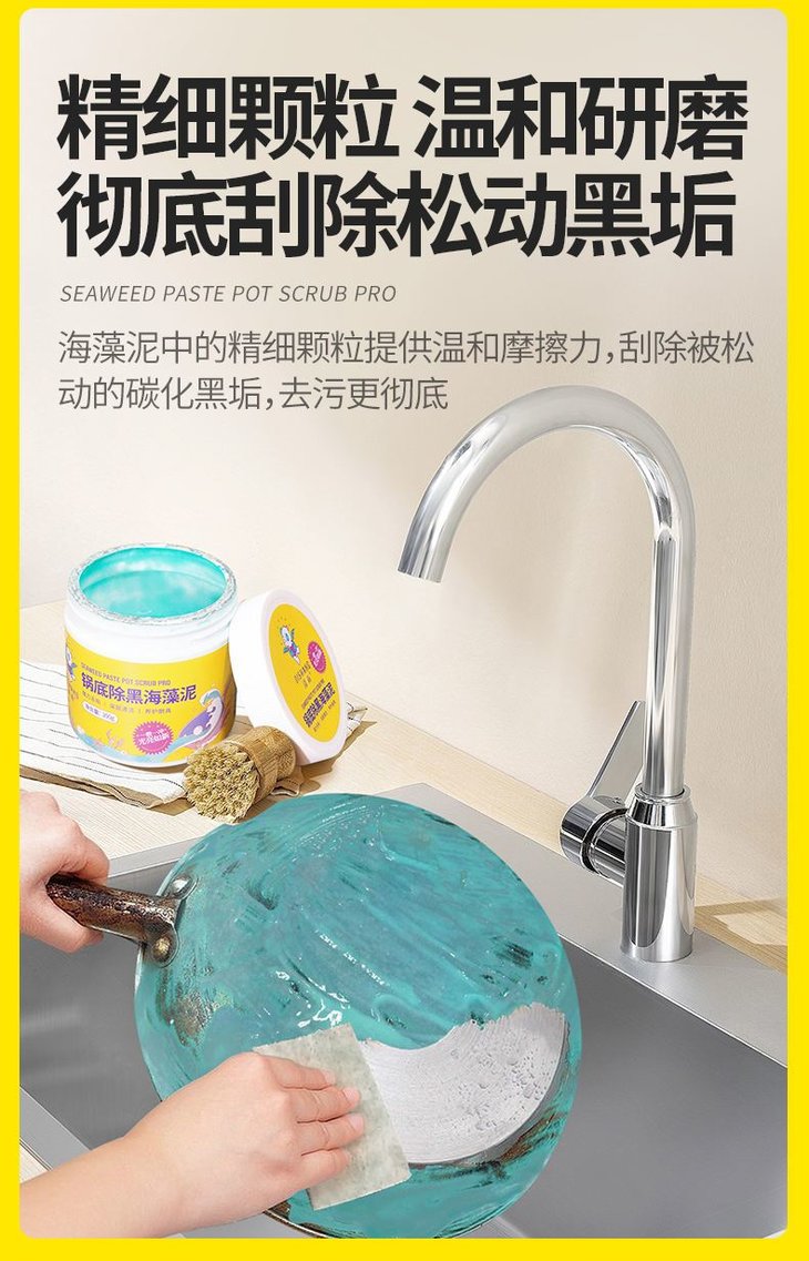 ✅ 卖点2:精细颗粒·温柔摩擦不留痕! 💎 海藻泥的精细颗粒在锅底打圈,刮除被松动的碳化黑垢。 默默磨掉黑垢却0划痕!像给锅做SPA~ 👉 去污彻底+不伤锅具=治愈力MAX!