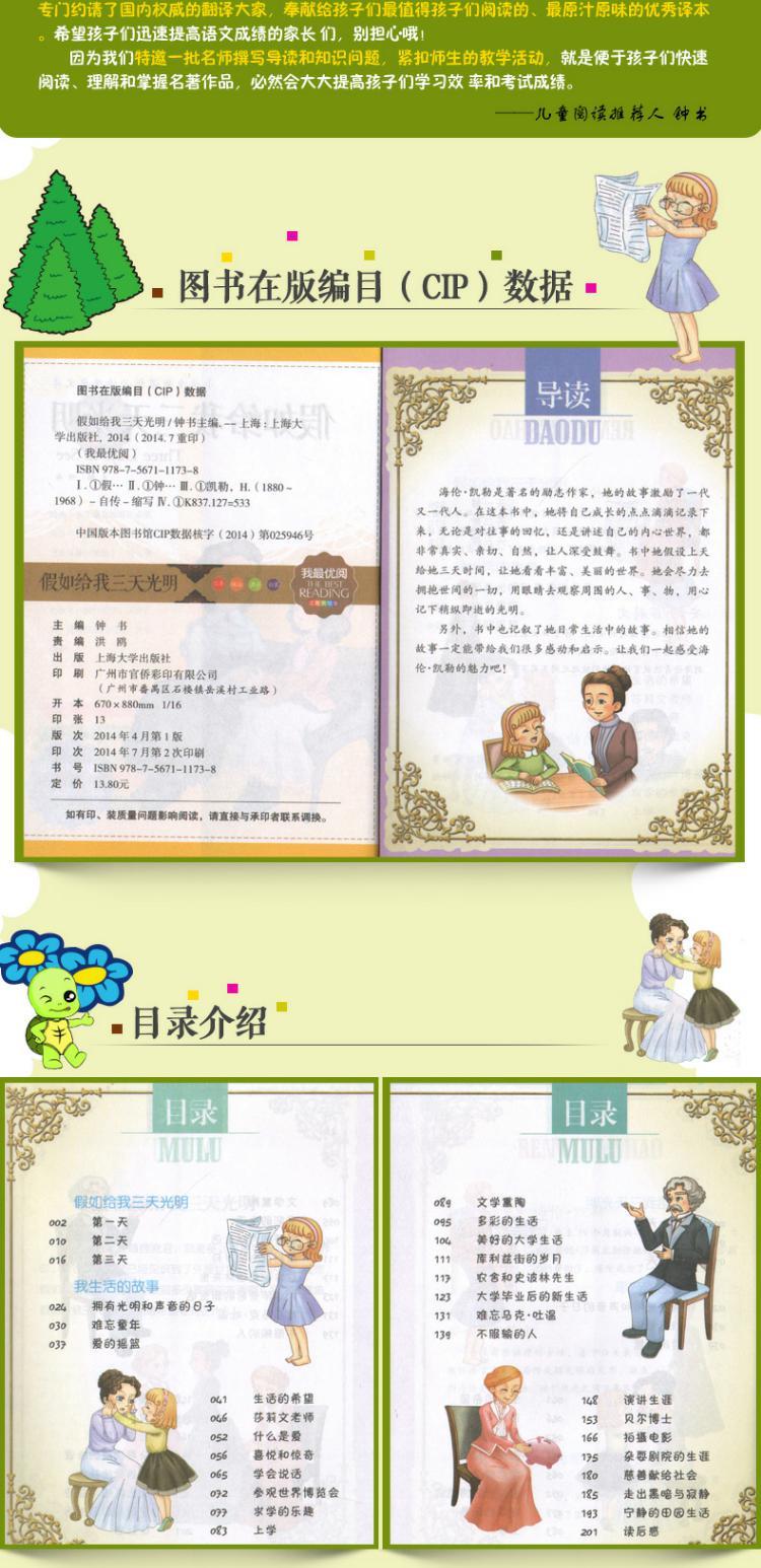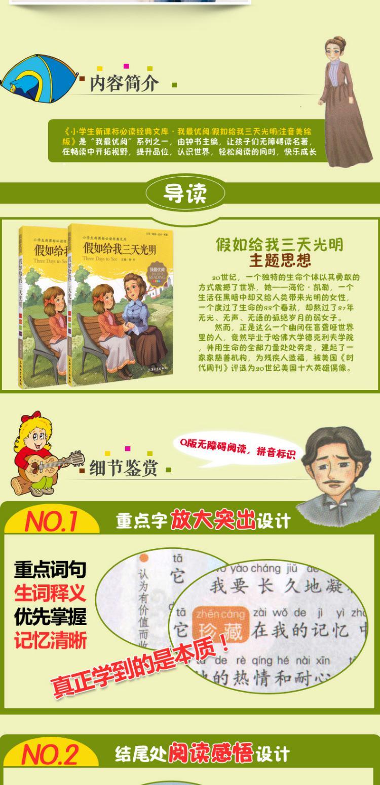 1-3年级适用 注音美绘版-假如给我三天光明 钟书正版少儿读物我优阅系列拼音彩图版假如给我三天光明 儿童文学课外读物小学生作文