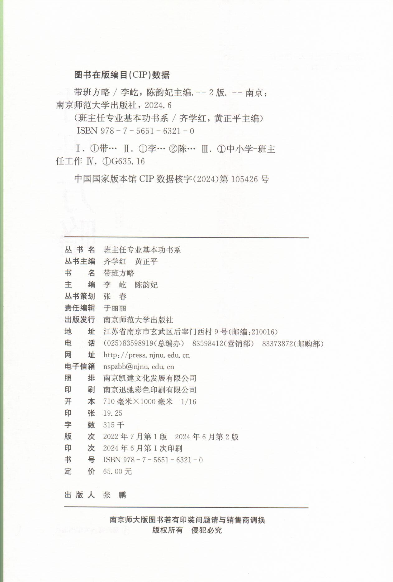 《带班方略》(第2版)面向中小学班级工作和学生管理实践,结合班主任工作的实际需求,针对作为“专业” 的班主任在带班育人方面应知、应会、应能的核心内容,通过理论概括与案例分析,提炼并优化班主任带班育人的方法与策略。全书既聚焦班主任的带班育人意识和能力提升,又密切关注班主任工作如何契合当下中国的教育发展,进一步夯实班主任专业基本功,从而为班主任带班育人提供切实而具有可操作性的指导建议。