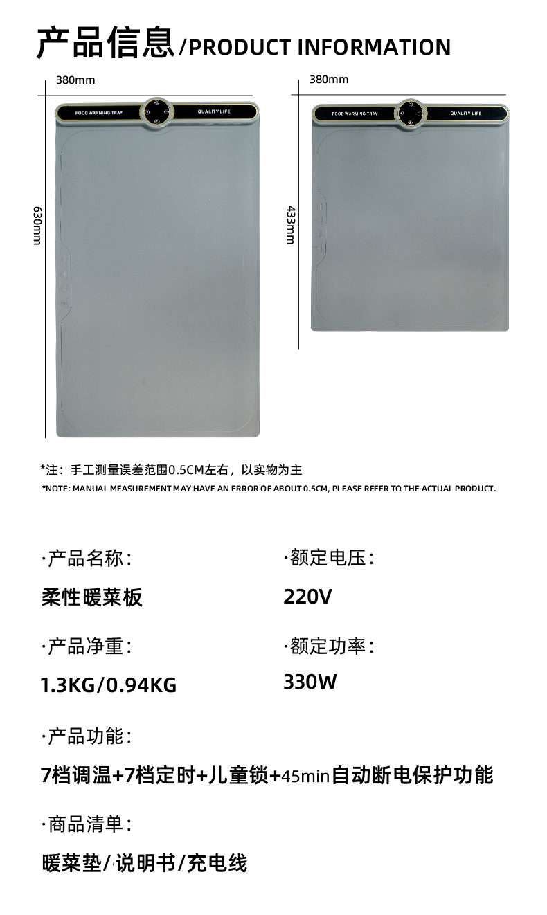 【品名】敏煌 暖菜神器 恒温热菜板 速热易收纳 7档调温定时+童锁功能 【规格】 米色/蓝色大号:380mm*630mm 米色/蓝色小号:380mm*433mm 【产地】国内 【发货包装】独立包装 【发货地】温州 【发货快递】顺丰、中通、圆通、邮政随机发 【补邮费地区】全国春节期间+3元 新疆、西藏+18元 【发货时效】48-72小时,周末节假日顺延 |