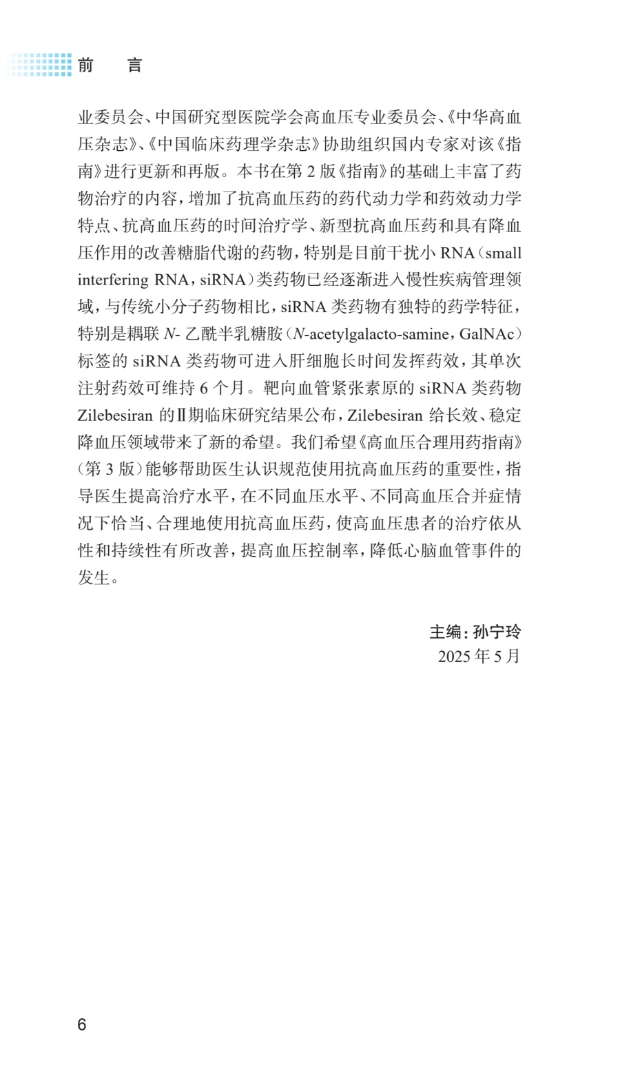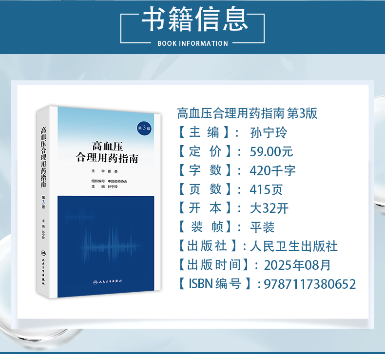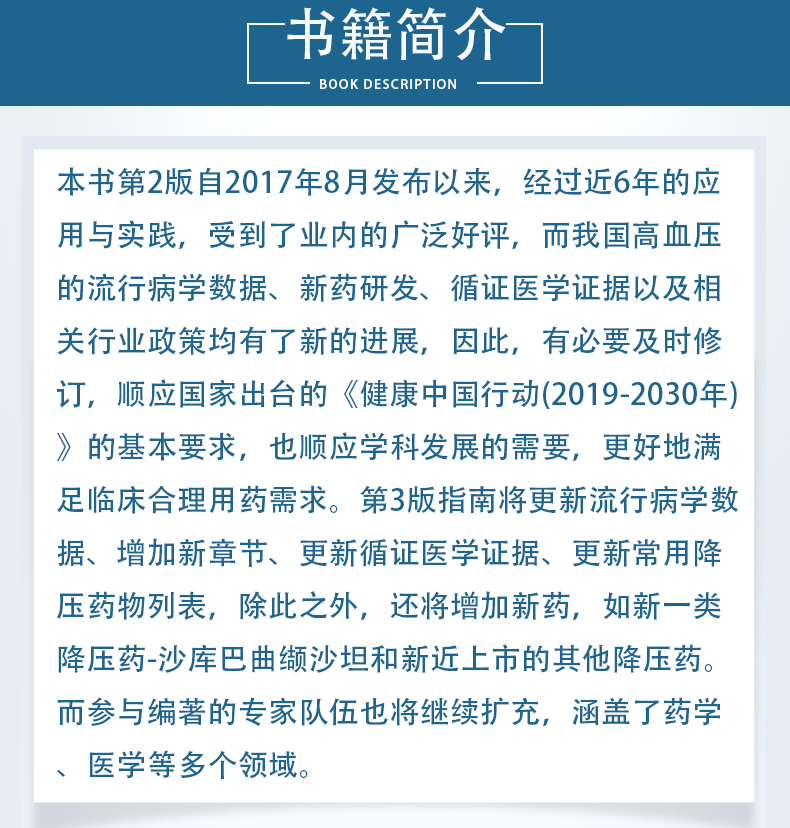 本书第2版自2017年8月发布以来,经过近6年的应用与实践,受到了业内的广泛好评,而我国高血压的流行病学数据、新药研发、循证医学证据以及相关行业政策均有了新的进展,因此,有必要及时修订,顺应国家出台的《健康中国行动(2019-2030年)》的基本要求,也顺应学科发展的需要,更好地满足临床合理用药需求。第3版指南将更新流行病学数据、增加新章节、更新循证医学证据、更新常用降压药物列表,除此之外,还将增加新药,如新一类降压药-沙库巴曲缬沙坦和新近上市的其他降压药。而参与编著的专家队伍也将继续扩充,涵盖了药学、医学等多个领域。