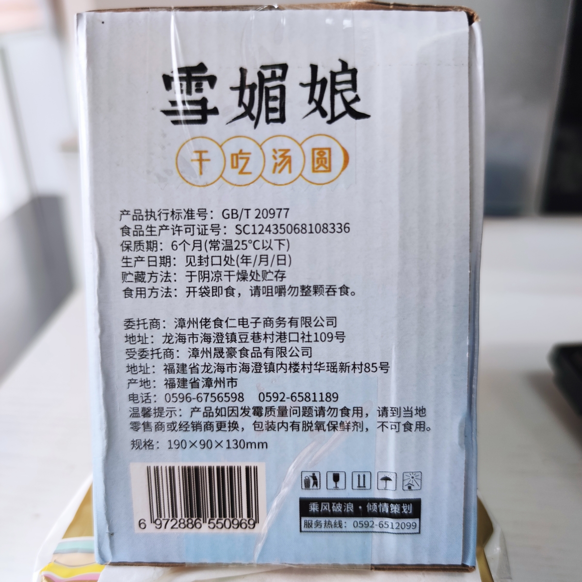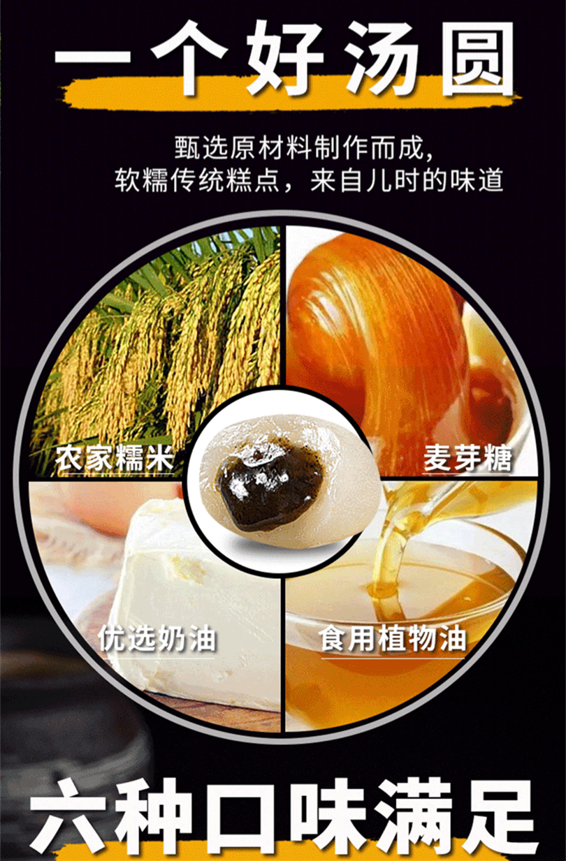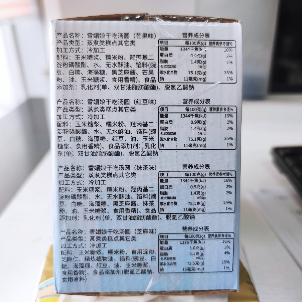 【主要配料】玉米糖浆、糯米粉、水、馅料、白糖、海藻糖、黑芝麻酱、芒果粉、油、玉米糖浆、食用香精等