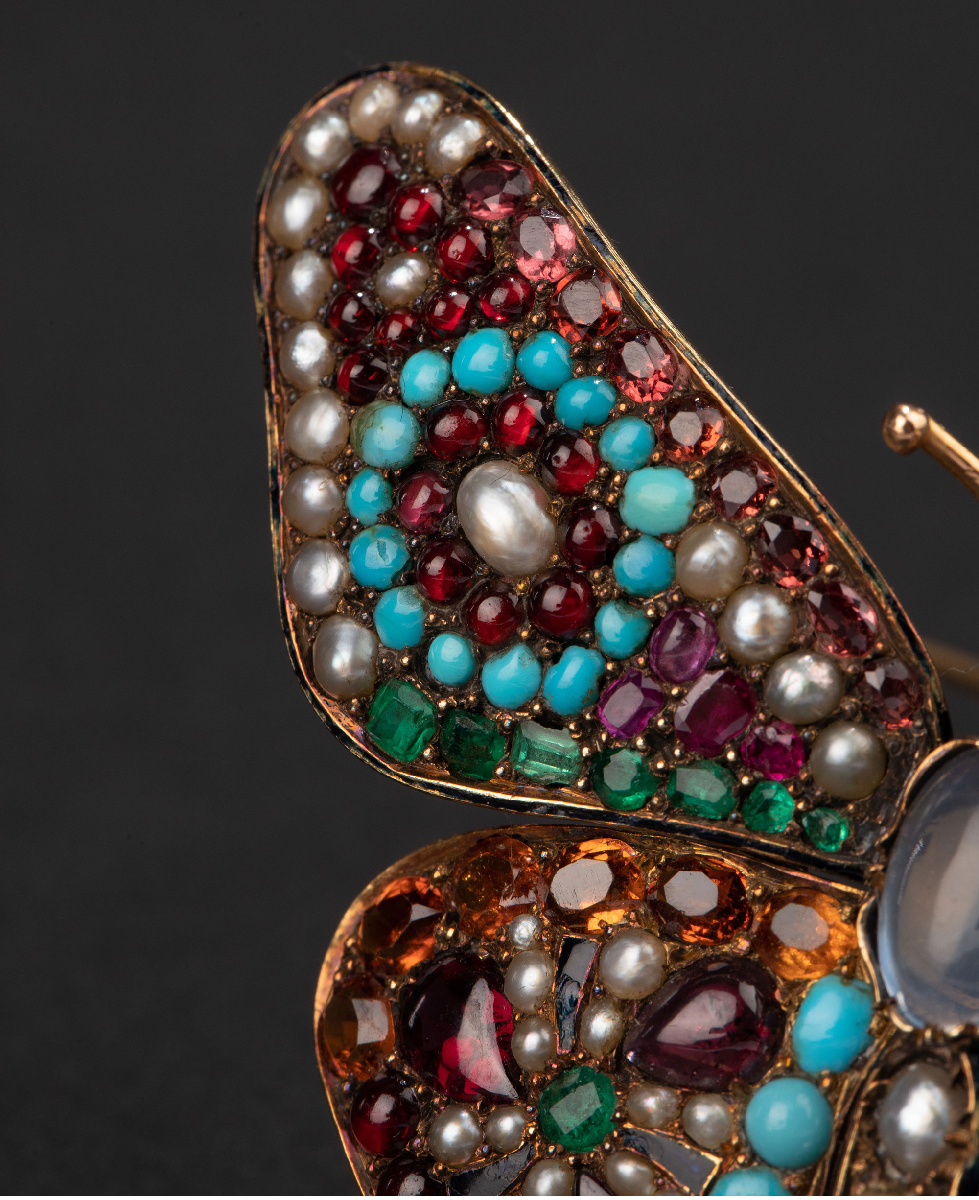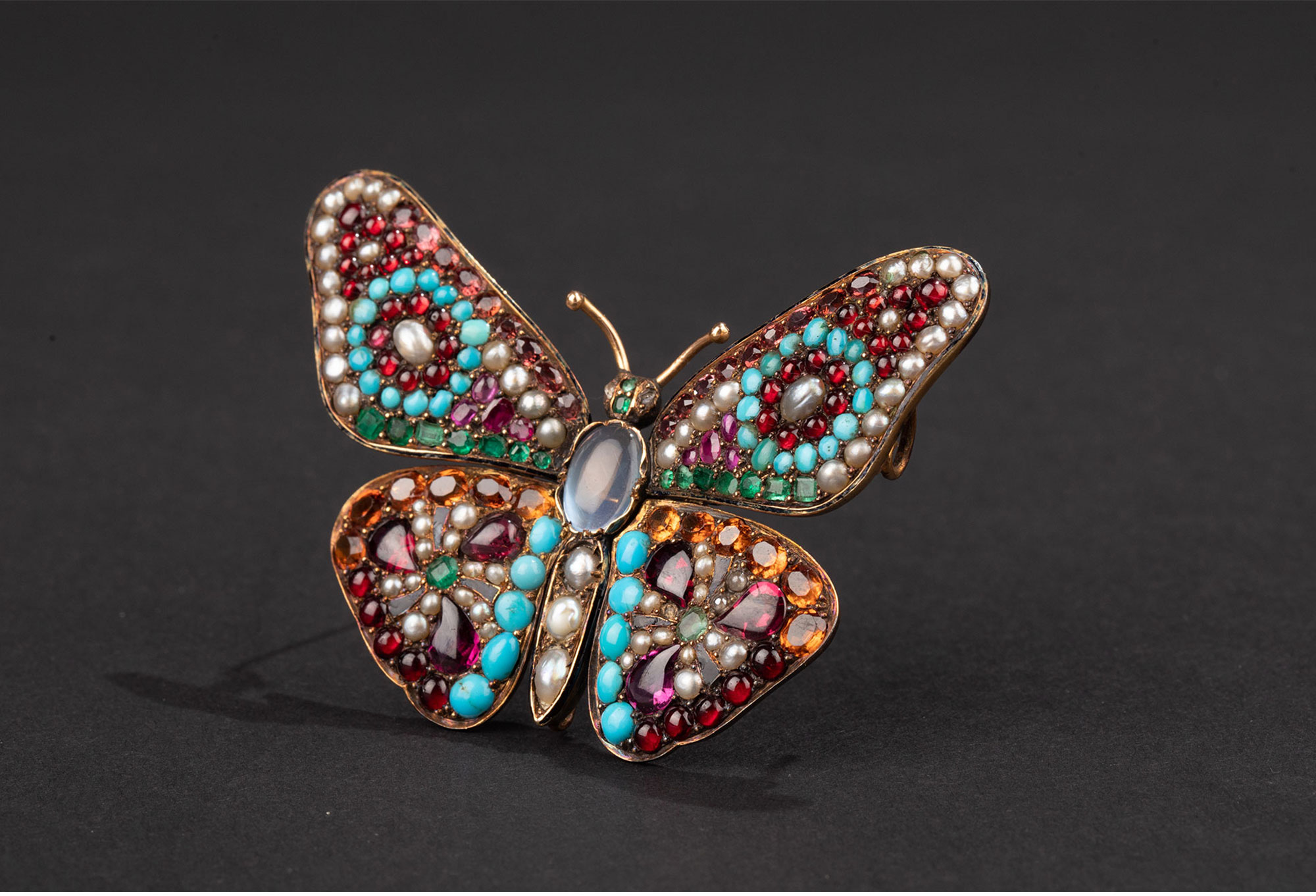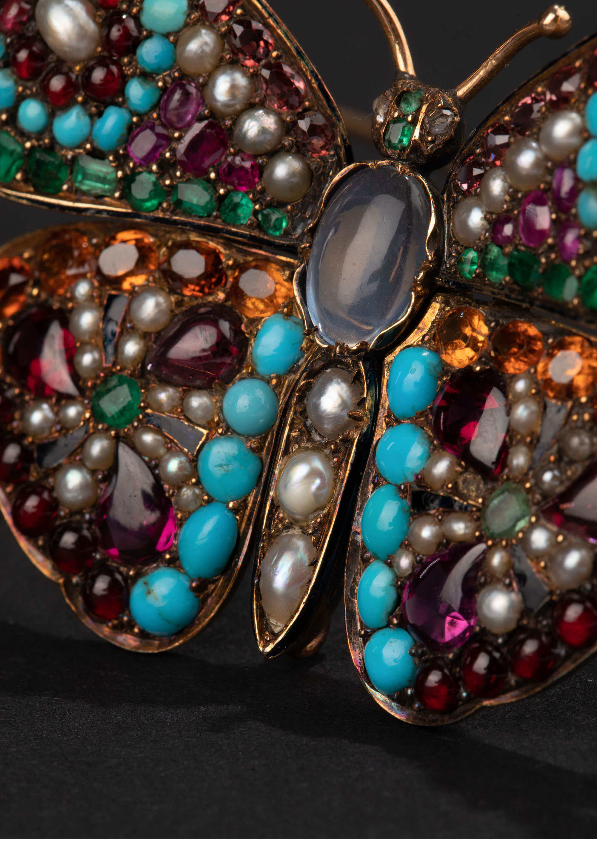 1890年代英国出品蝴蝶造型18K黄金镶嵌多宝石及天然海水珍珠胸针