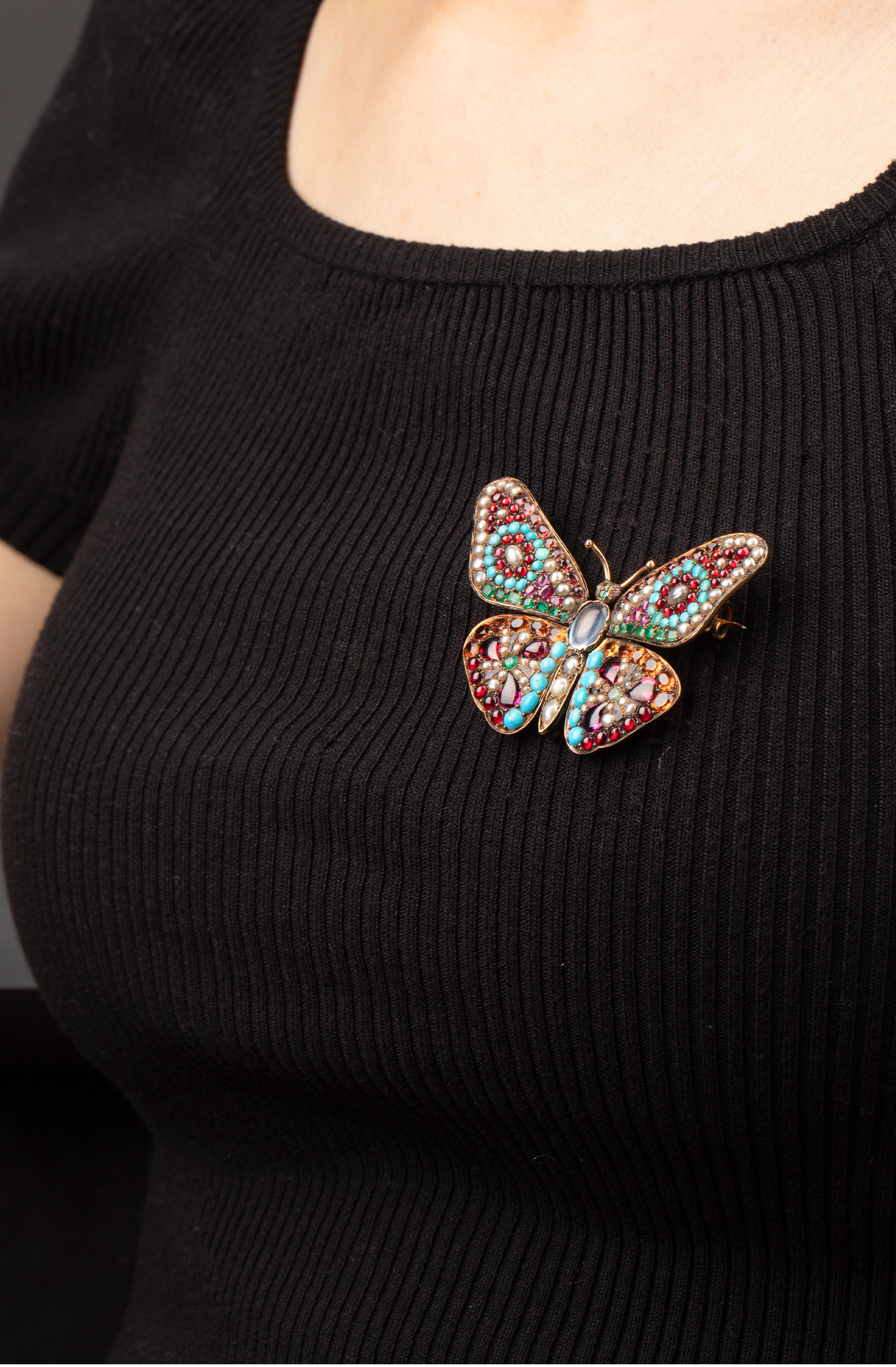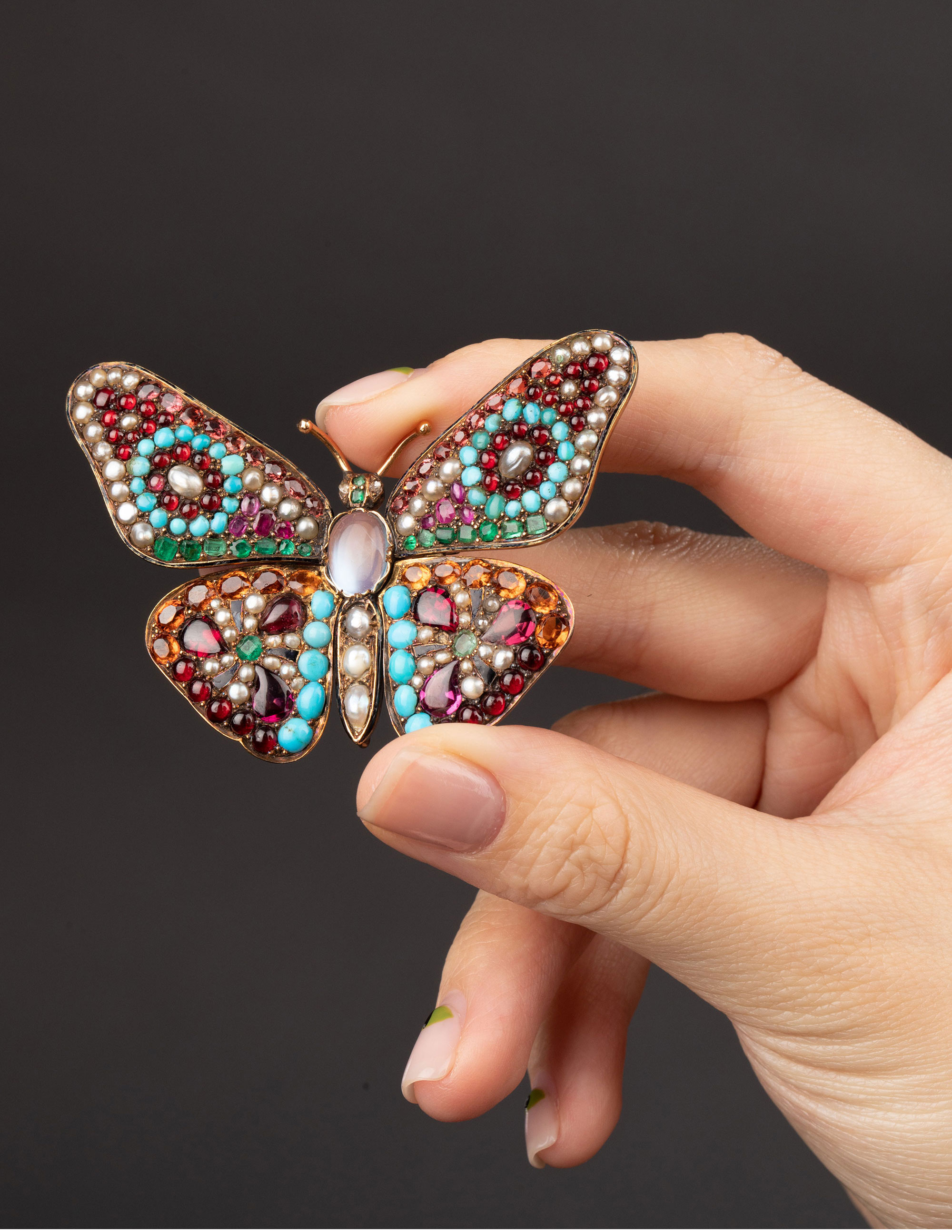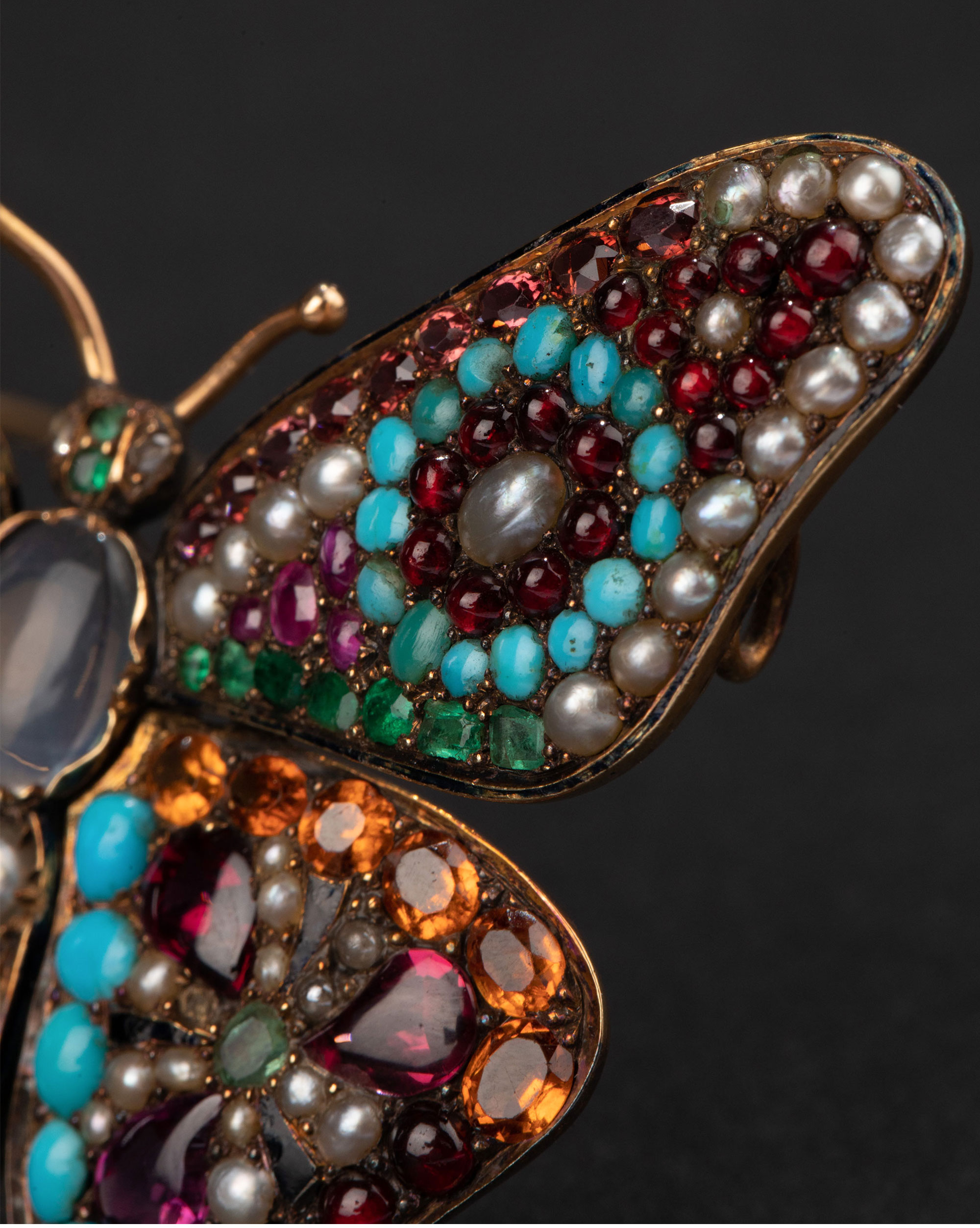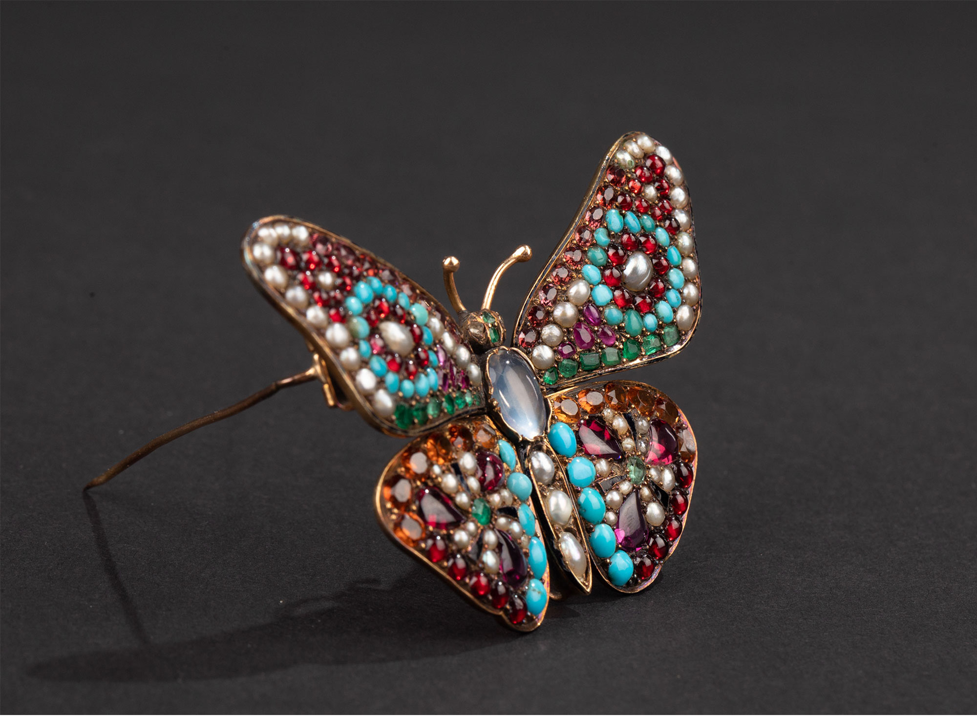 1890年代英国出品蝴蝶造型18K黄金镶嵌多宝石及天然海水珍珠胸针