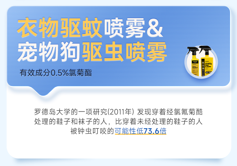氯菊酯喷雾:只能用于衣物和其他设备,不能用于皮肤,防护时间超长(6周或6次清洗),更适合在进行长时间户外活动时搭配上述3款驱蚊剂来强化防护效果。实在不想在皮肤上涂抹驱蚊剂的人群,也可以将本产品喷涂于衣物(喷在衣服上需晾干再穿)或其他设备来实现一定的防护效果。(喷雾刚喷洒出时会有较大异味,晾干后则无味,产品本身安全无毒,可放心使用喷洒时注意避免吸入,且避免与眼睛和皮肤接触。)