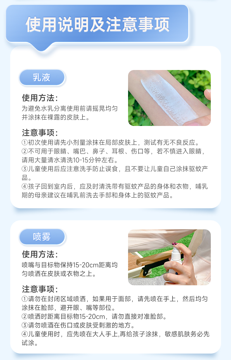 避蚊胺乳液:不含酒精,没什么味道,给儿童使用建议首选这一款,对酒精过敏人群也建议选这款。但避蚊胺成分质地会较黏腻,肤感不太好。